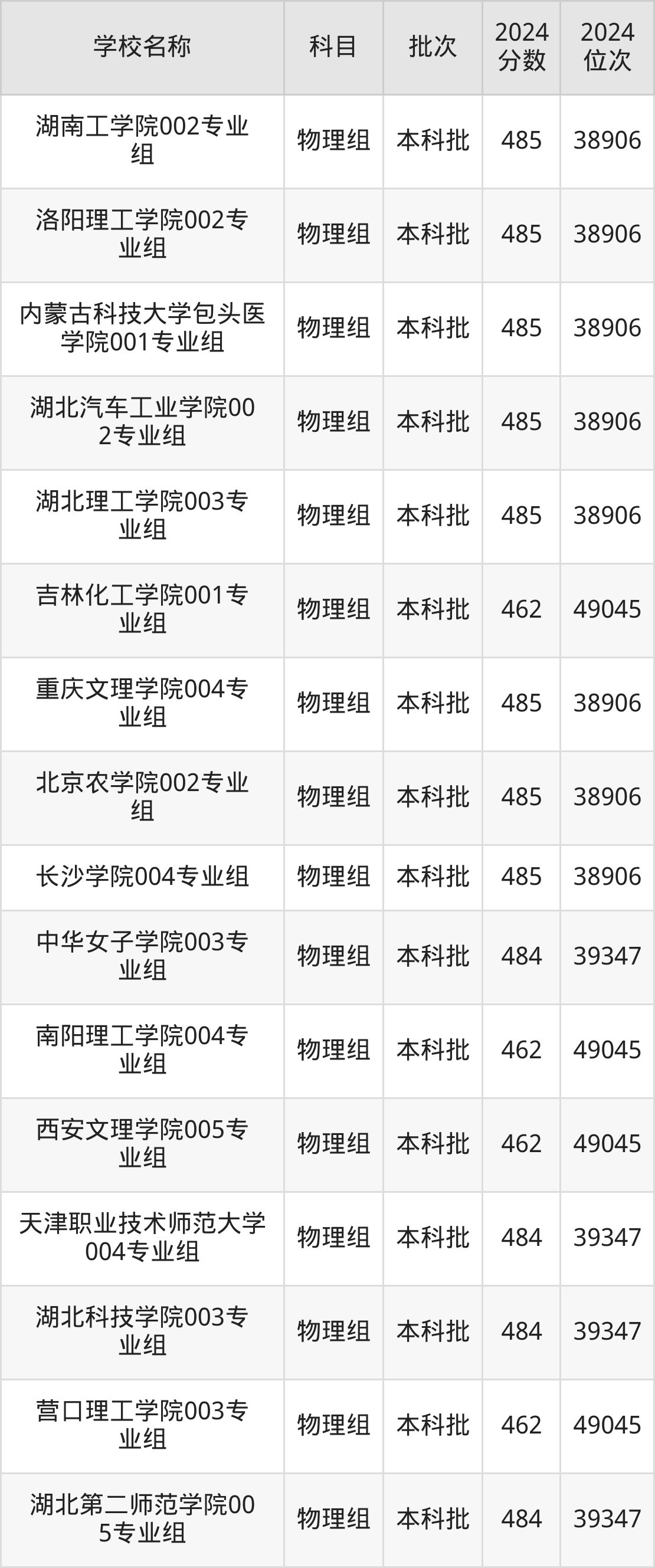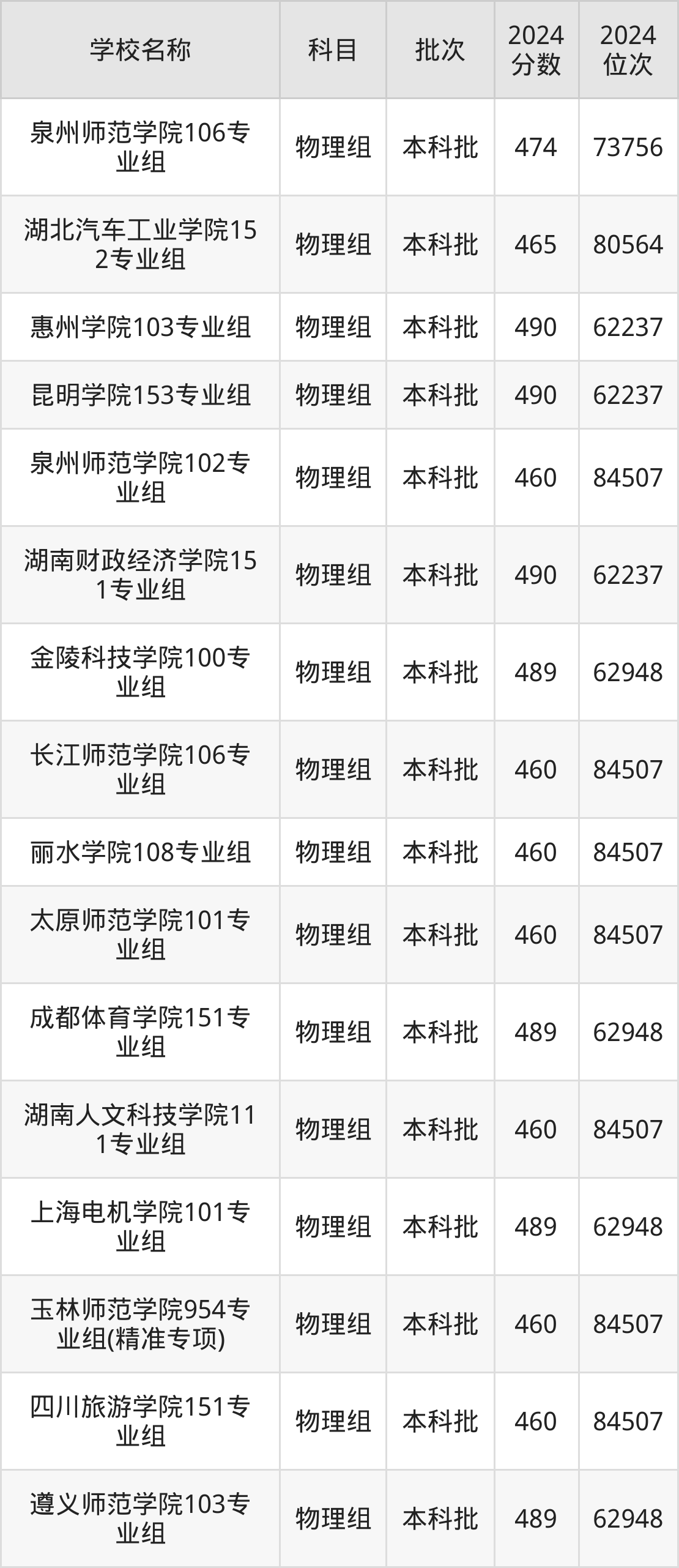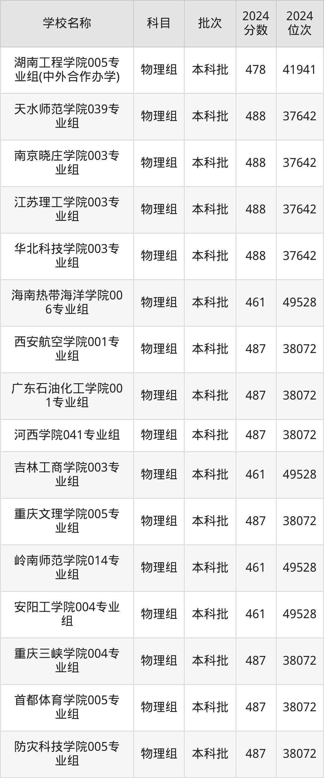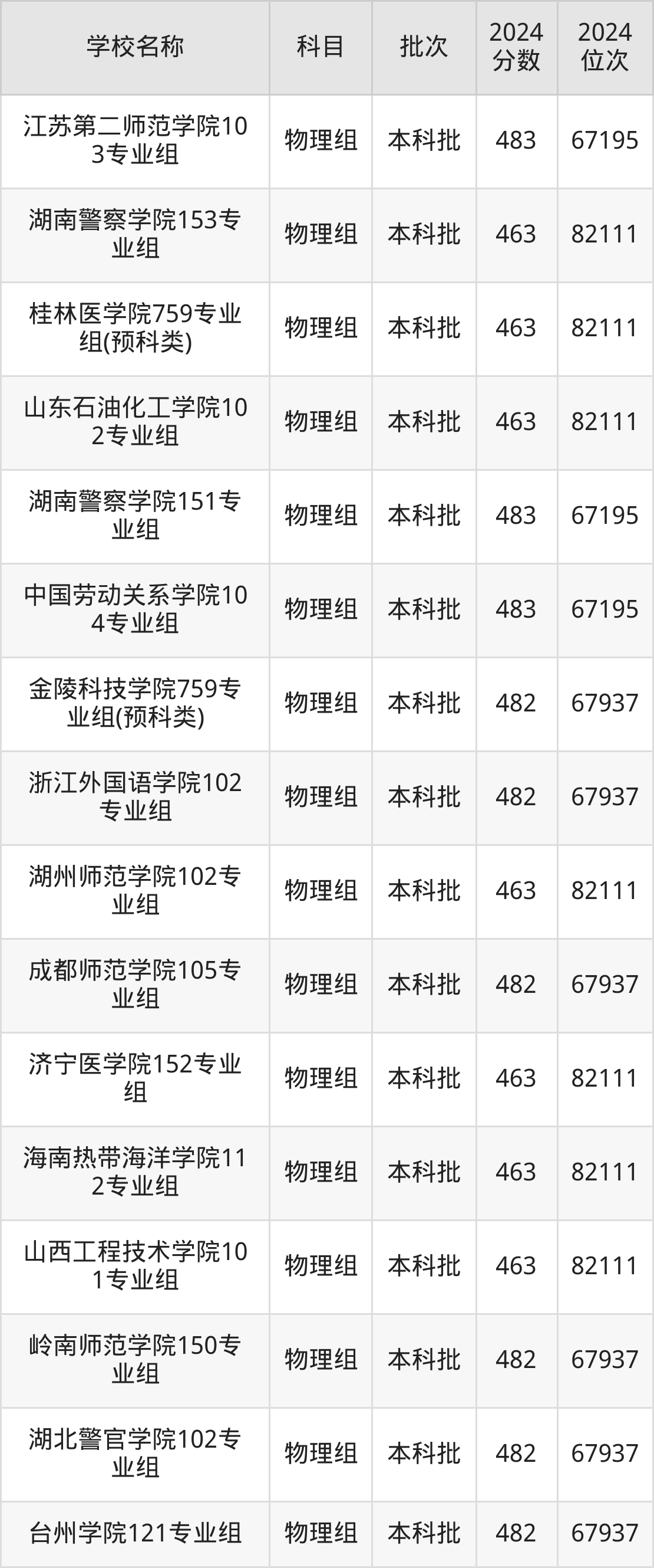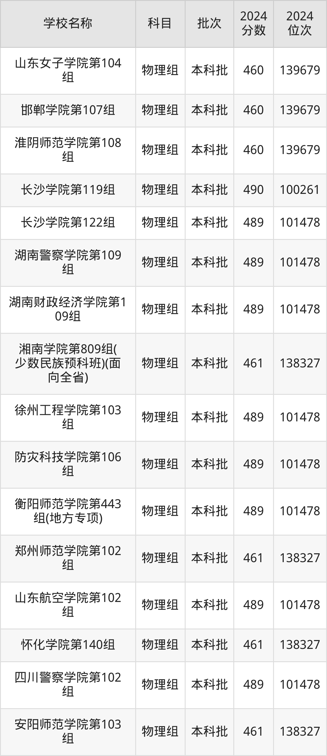 湖南高考物理组共有226所二本公办大学在460到490分之间录取,包含防灾科技学院、湖北第二师范学院、邵阳学院、丽水学院、怀化学院、四川音乐学院、嘉兴南湖学院、杭州医学院、长沙学院、湖南警察学院。