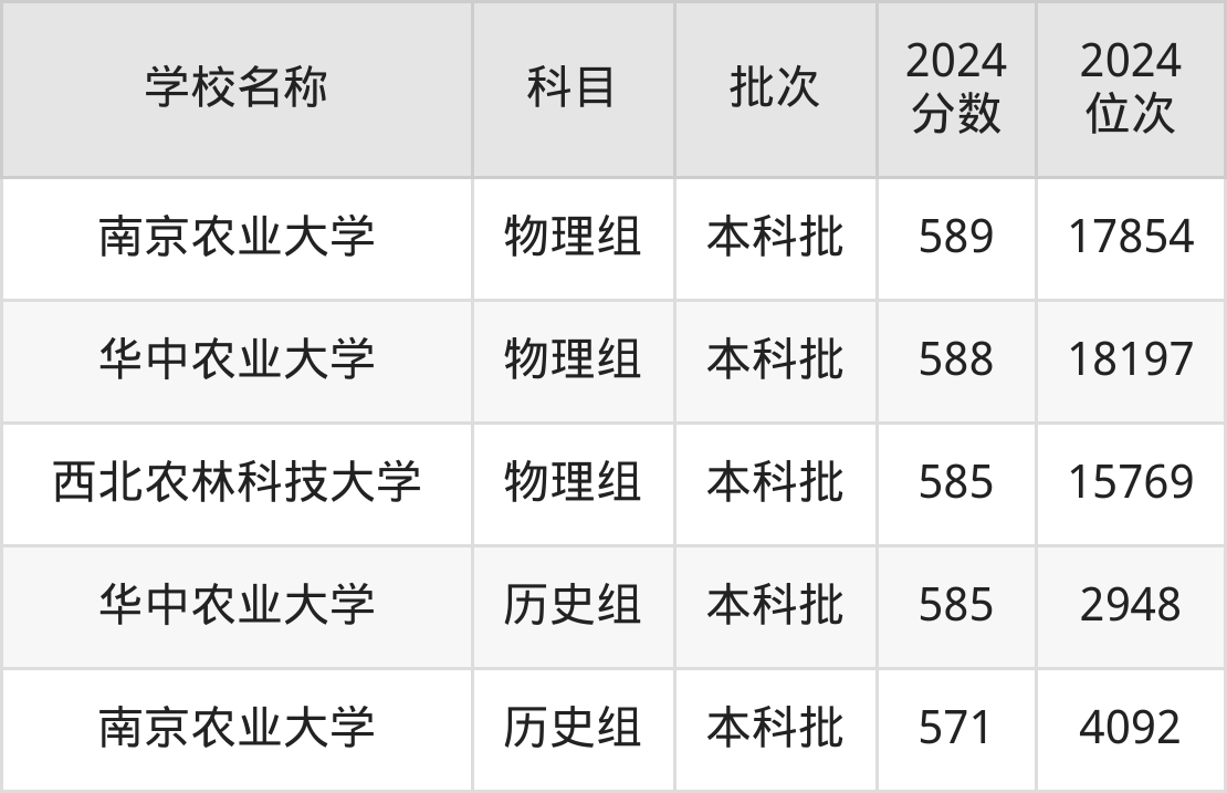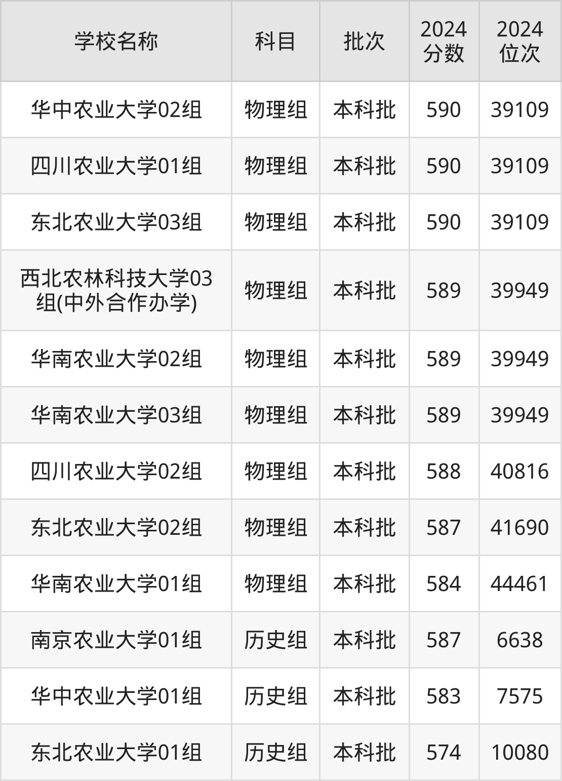 江苏高考历史组共有3所农业大学在570到590分之间录取,包含南京农业大学、华中农业大学、东北农业大学。
