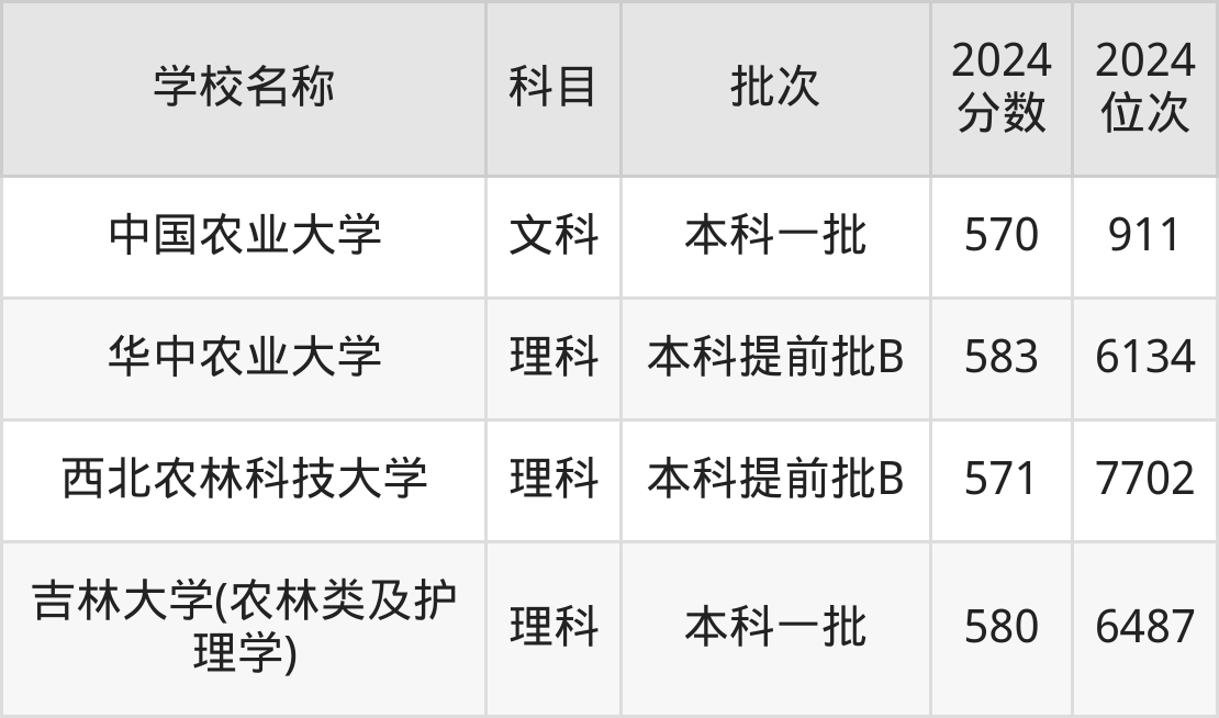 内蒙古高考理科共有3所农业大学在570到590分之间录取,包含华中农业大学、吉林大学(农林类及护理学)、西北农林科技大学。