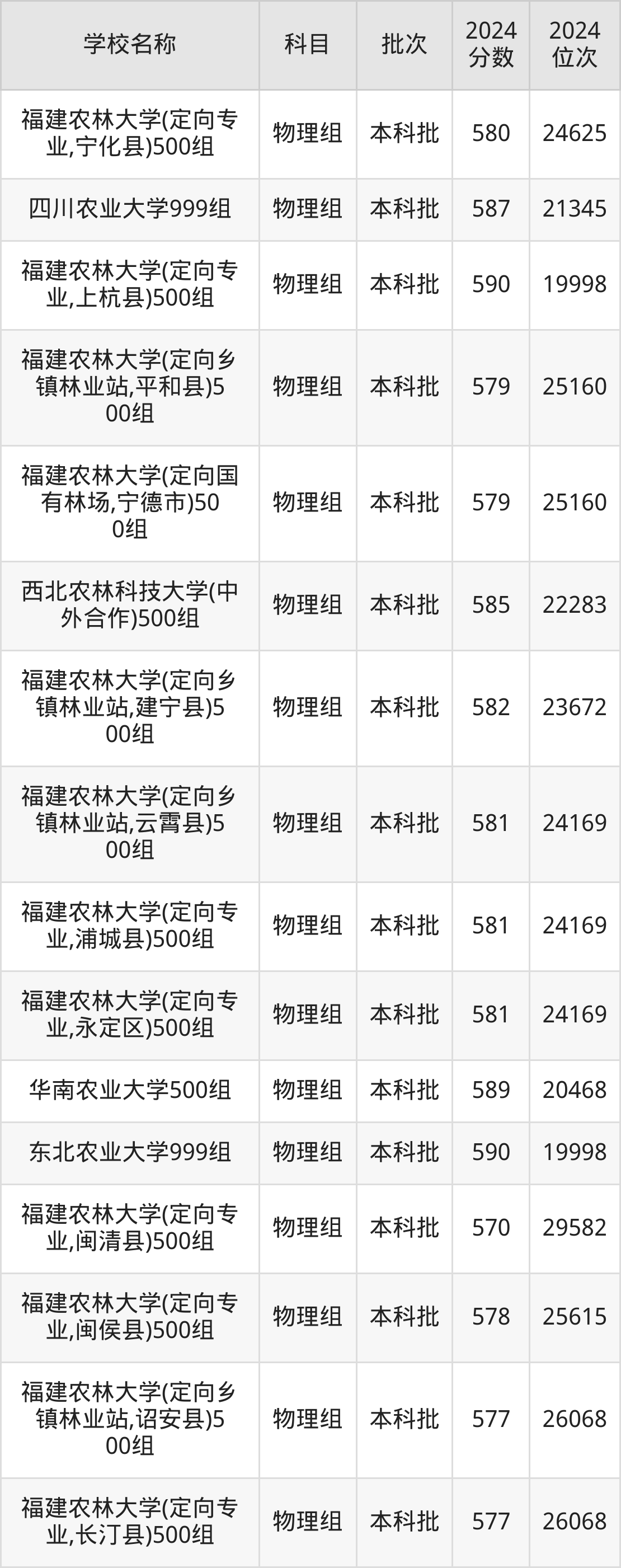 福建高考物理组共有18所农业大学在570到590分之间录取,包含福建农林大学(定向专业,上杭县)、东北农业大学、华南农业大学、四川农业大学、西北农林科技大学(中外合作)、福建农林大学(定向乡镇林业站,建宁县)、福建农林大学(定向乡镇林业站,云霄县)、福建农林大学(定向专业,浦城县)、福建农林大学(定向专业,永定区)、福建农林大学(定向专业,宁化县)。