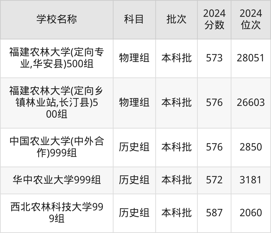 福建高考历史组共有3所农业大学在570到590分之间录取,包含西北农林科技大学、中国农业大学(中外合作)、华中农业大学。