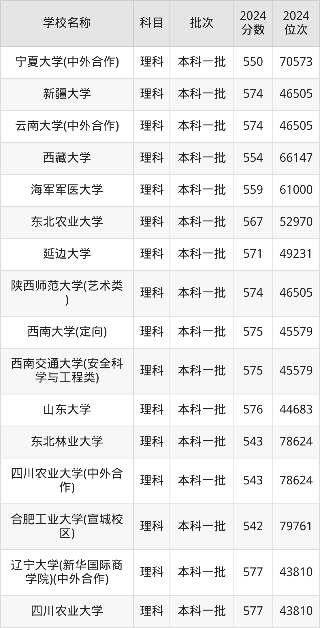 四川高考理科共有43所211大学在530到580分之间录取,包含西北农林科技大学(中外合作)、辽宁大学(中外合作)、东北师范大学(中外合作)(计算机)、中国地质大学(武汉)(中外合作)、海南大学(中外合作)、青海大学、东北师范大学(艺术类)、四川农业大学、辽宁大学(新华国际商学院)(中外合作)、山东大学。