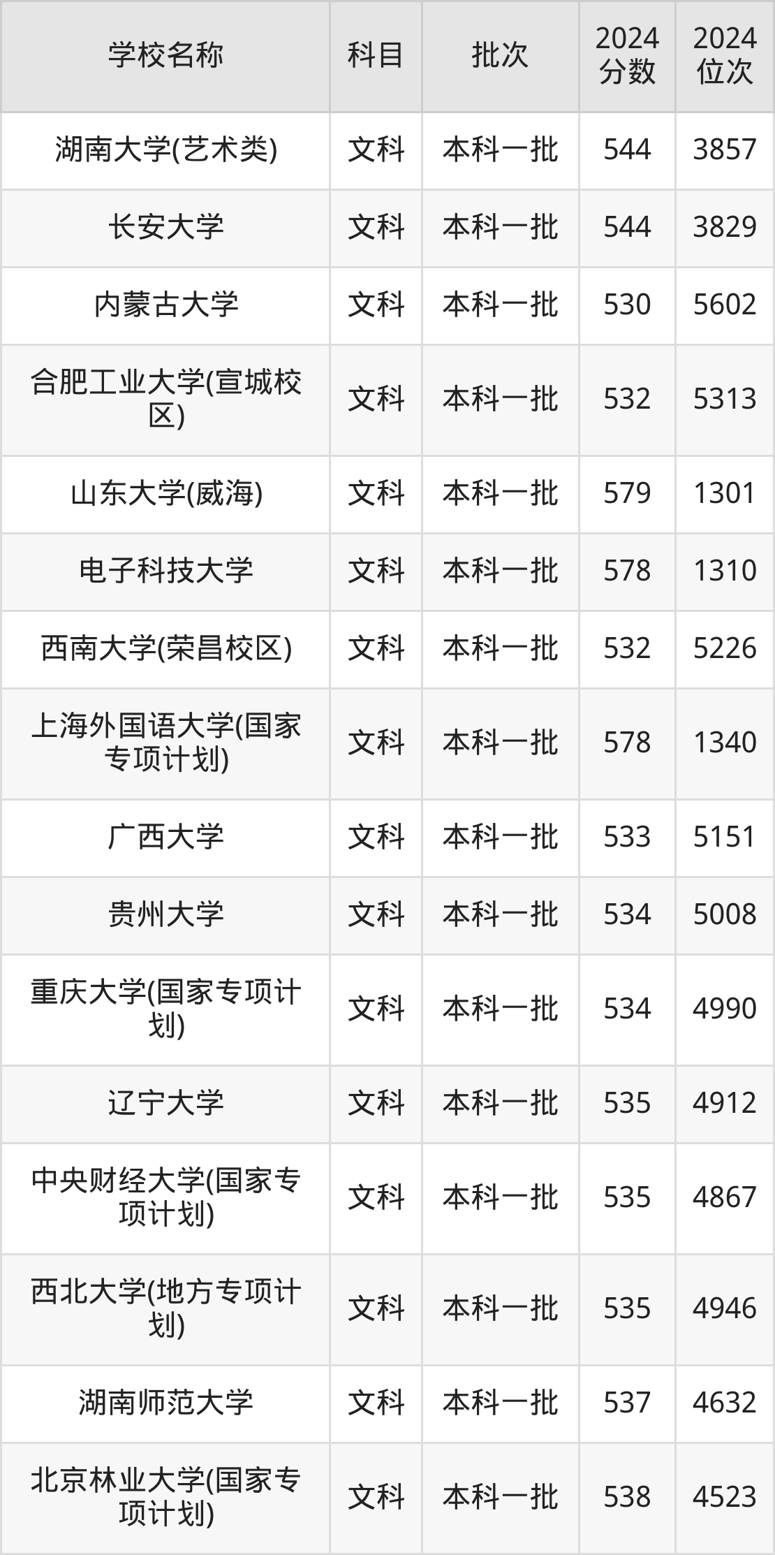 陕西高考文科共有89所211大学在530到580分之间录取,包含湖南大学、北京外国语大学(国家专项计划)、山东大学(威海)、电子科技大学、上海外国语大学(国家专项计划)、厦门大学(马来西亚分校)、西南财经大学、北京邮电大学、中央民族大学、中国海洋大学。