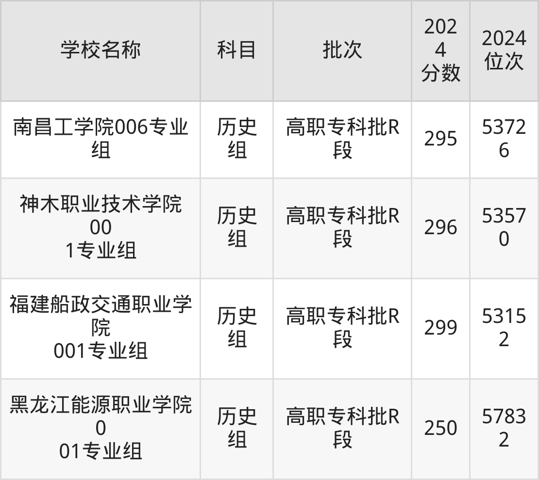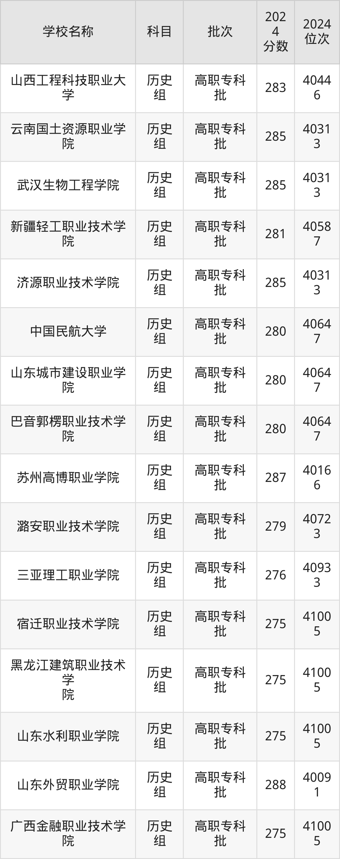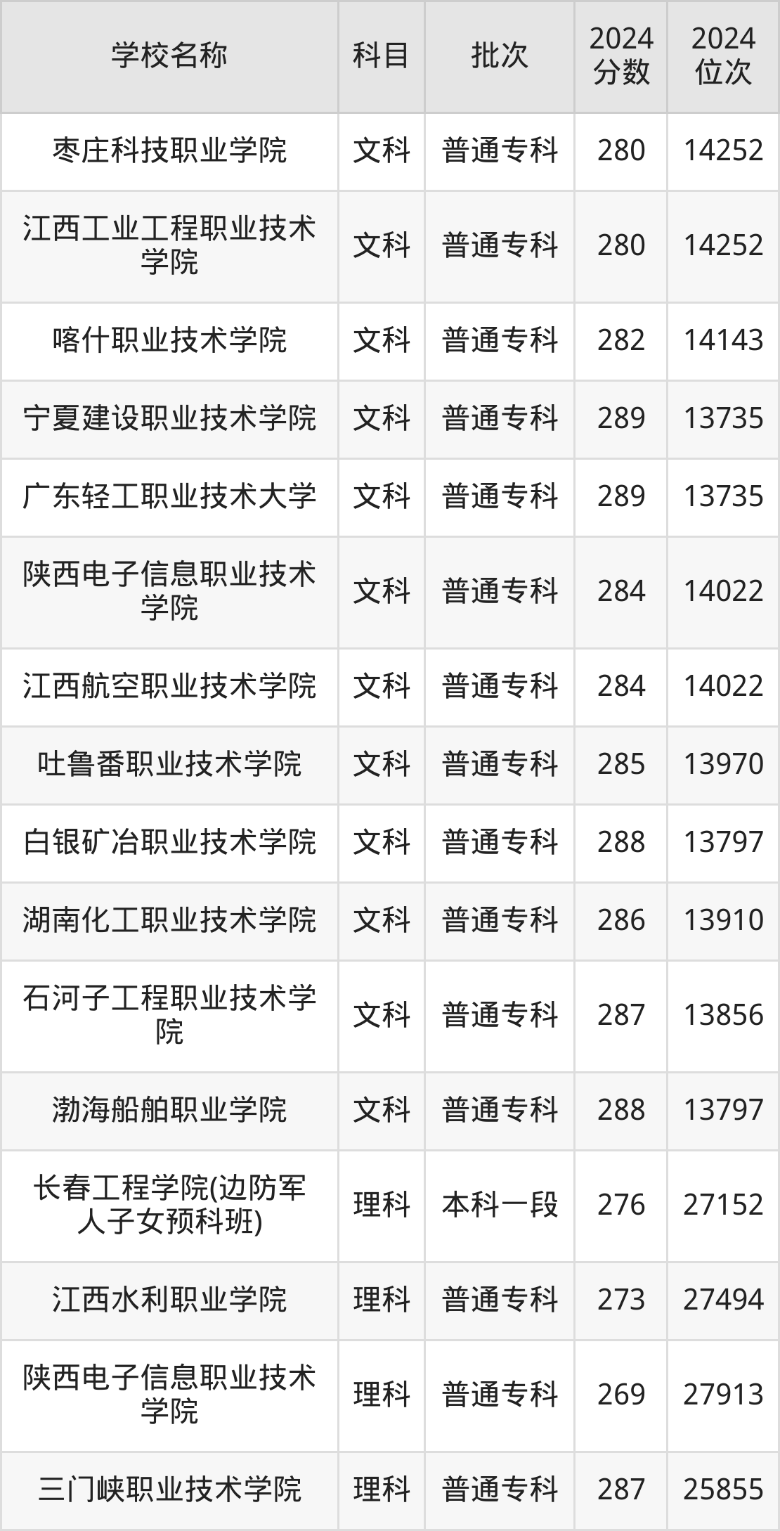 甘肃高考历史组共有58所理科大学在250到300分之间录取,包含江苏城乡建设职业学院、福建船政交通职业学院、广西经济职业学院、神木职业技术学院、南昌工学院、四川长江职业学院、新疆建设职业技术学院、山东铝业职业学院、辽宁金融职业学院、长江职业学院。