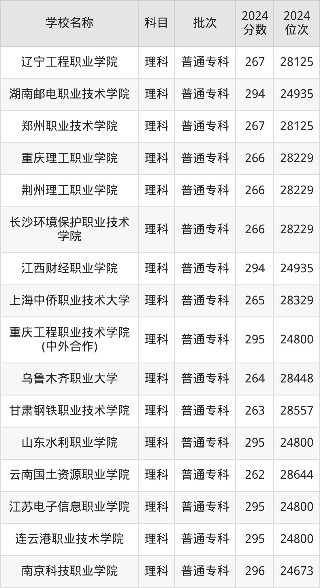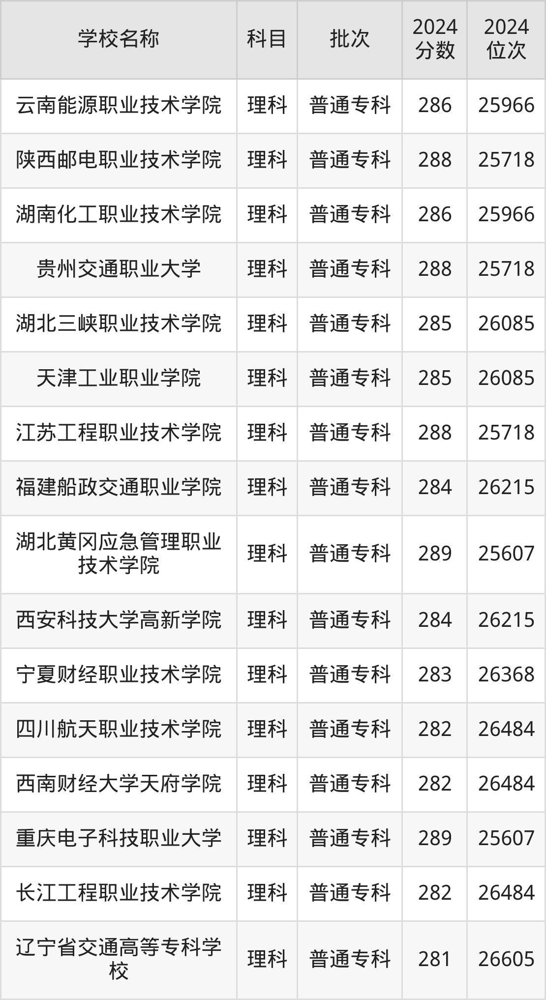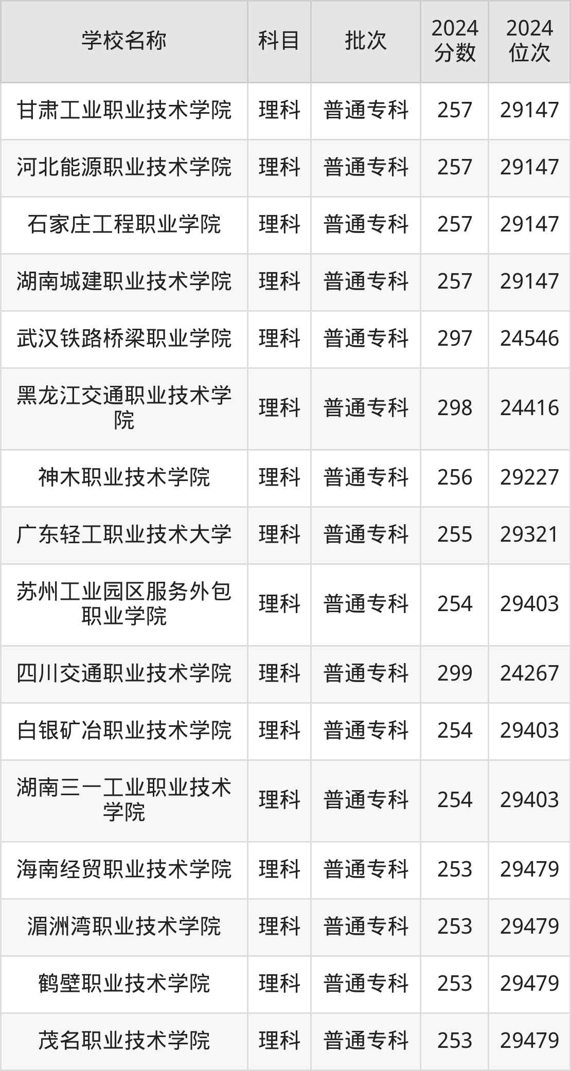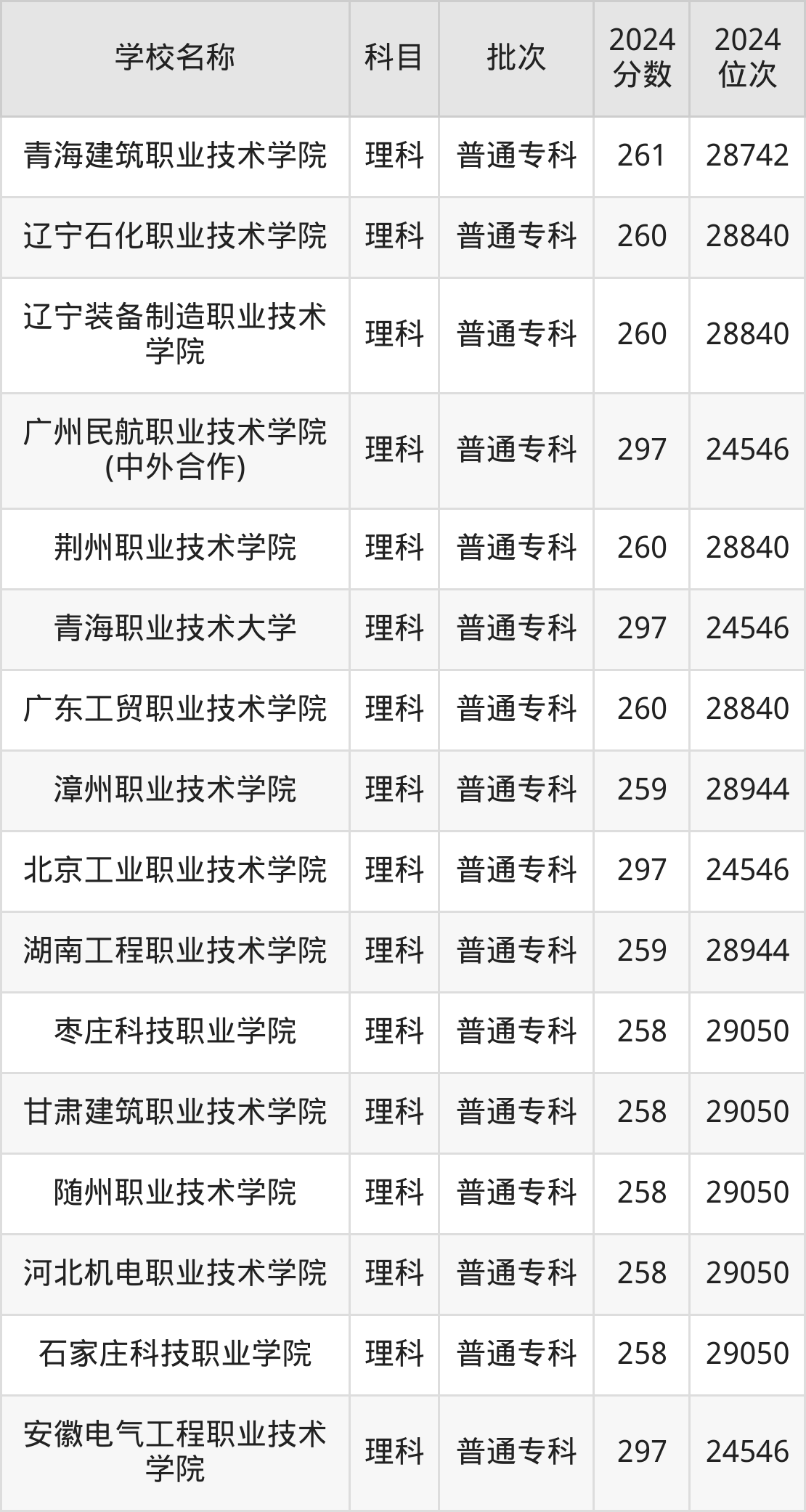 青海高考理科共有123所理科大学在250到300分之间录取,包含天津电子信息职业技术学院、四川交通职业技术学院、黑龙江交通职业技术学院、武汉铁路桥梁职业学院、安徽电气工程职业技术学院、北京工业职业技术学院、青海职业技术大学、广州民航职业技术学院(中外合作)、南京科技职业学院、连云港职业技术学院。