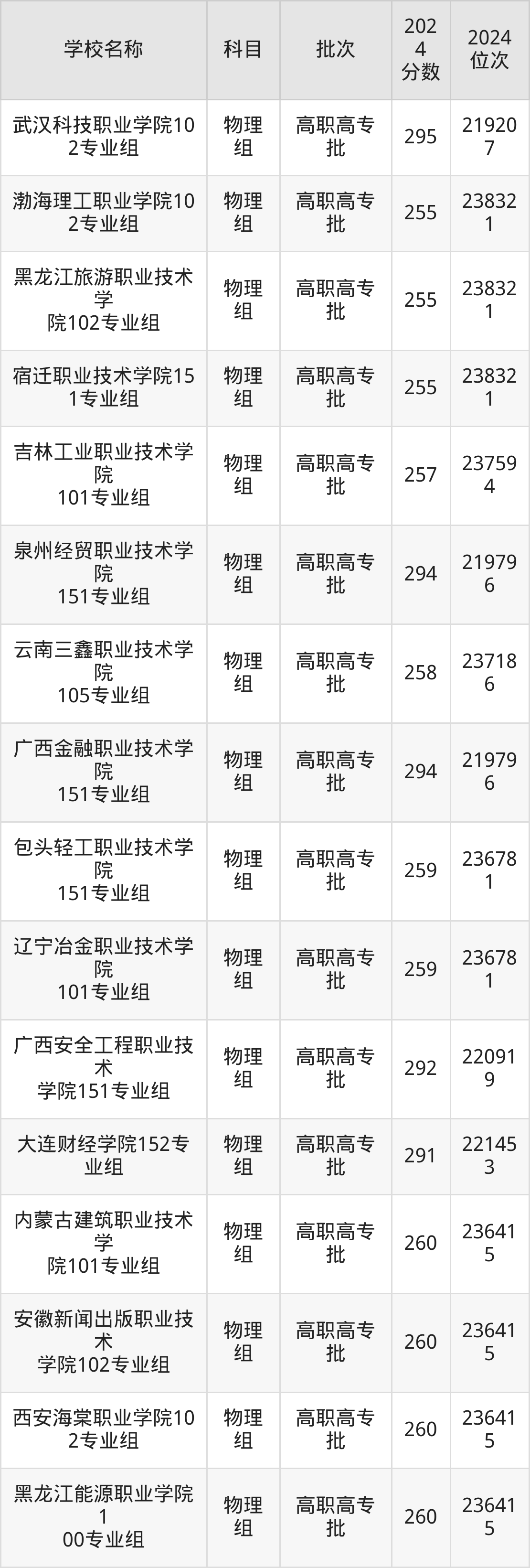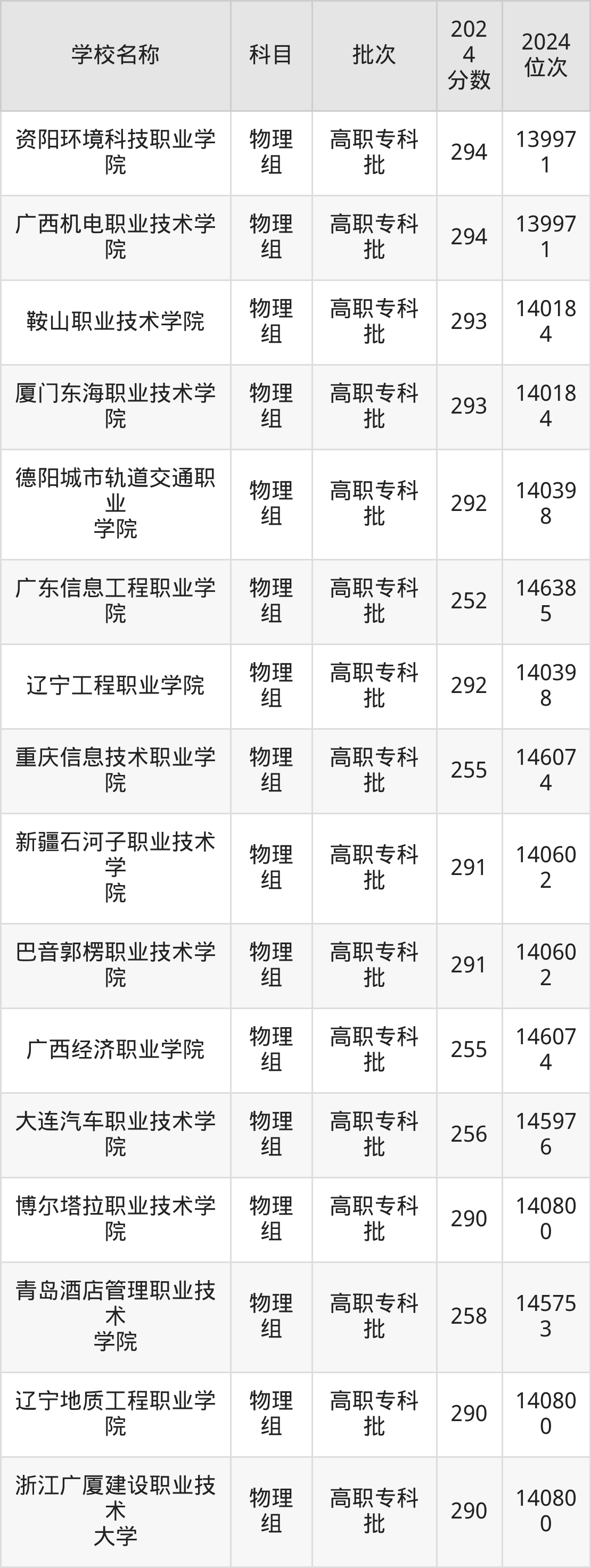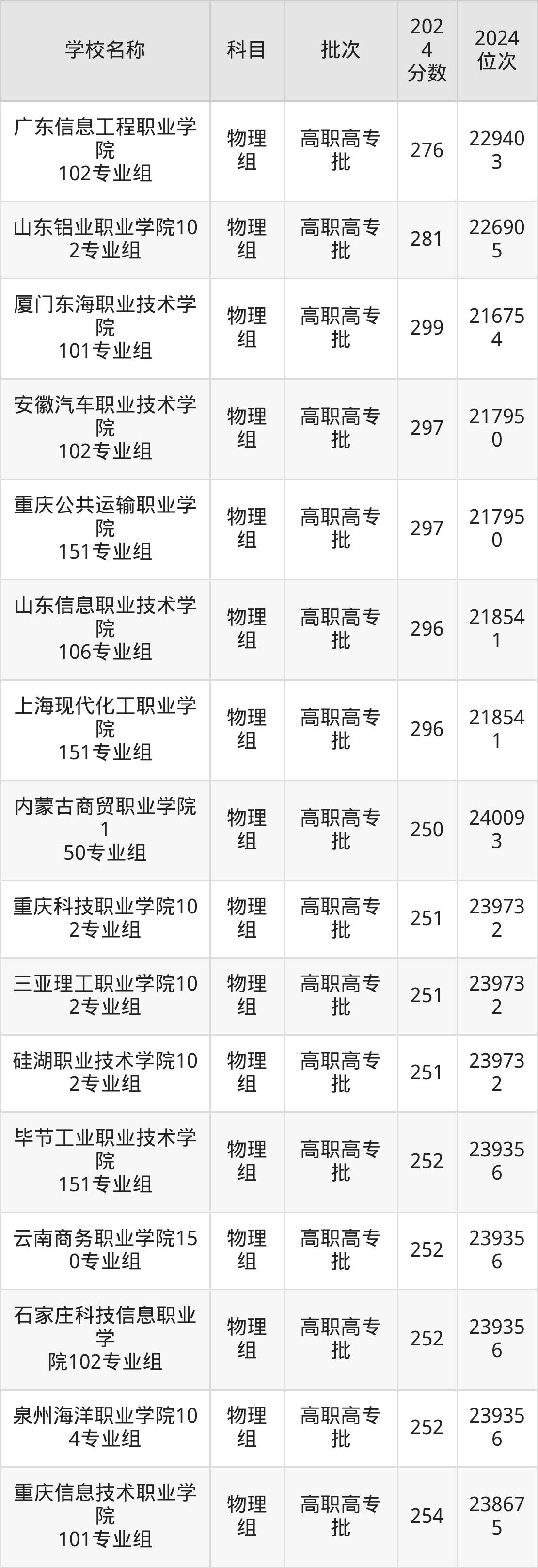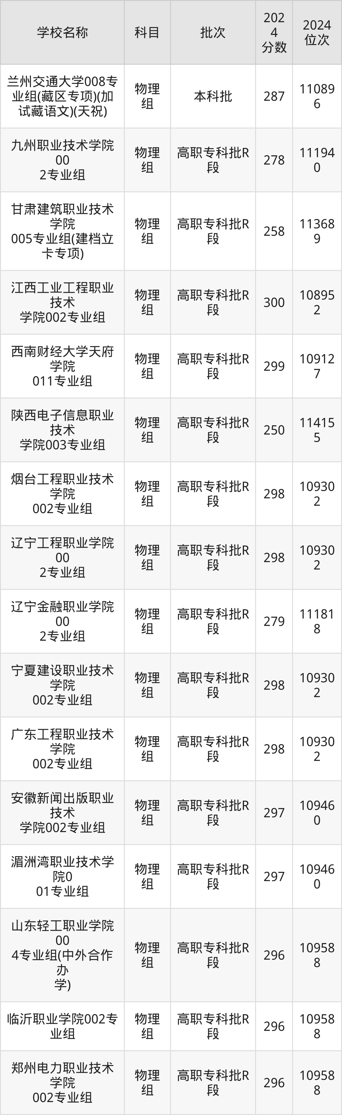 广西高考物理组共有79所理科大学在250到300分之间录取,包含湖南城建职业技术学院、江西建设职业技术学院、厦门东海职业技术学院、安徽汽车职业技术学院、重庆公共运输职业学院、山东信息职业技术学院、上海现代化工职业学院、武汉科技职业学院、泉州经贸职业技术学院、广西金融职业技术学院。