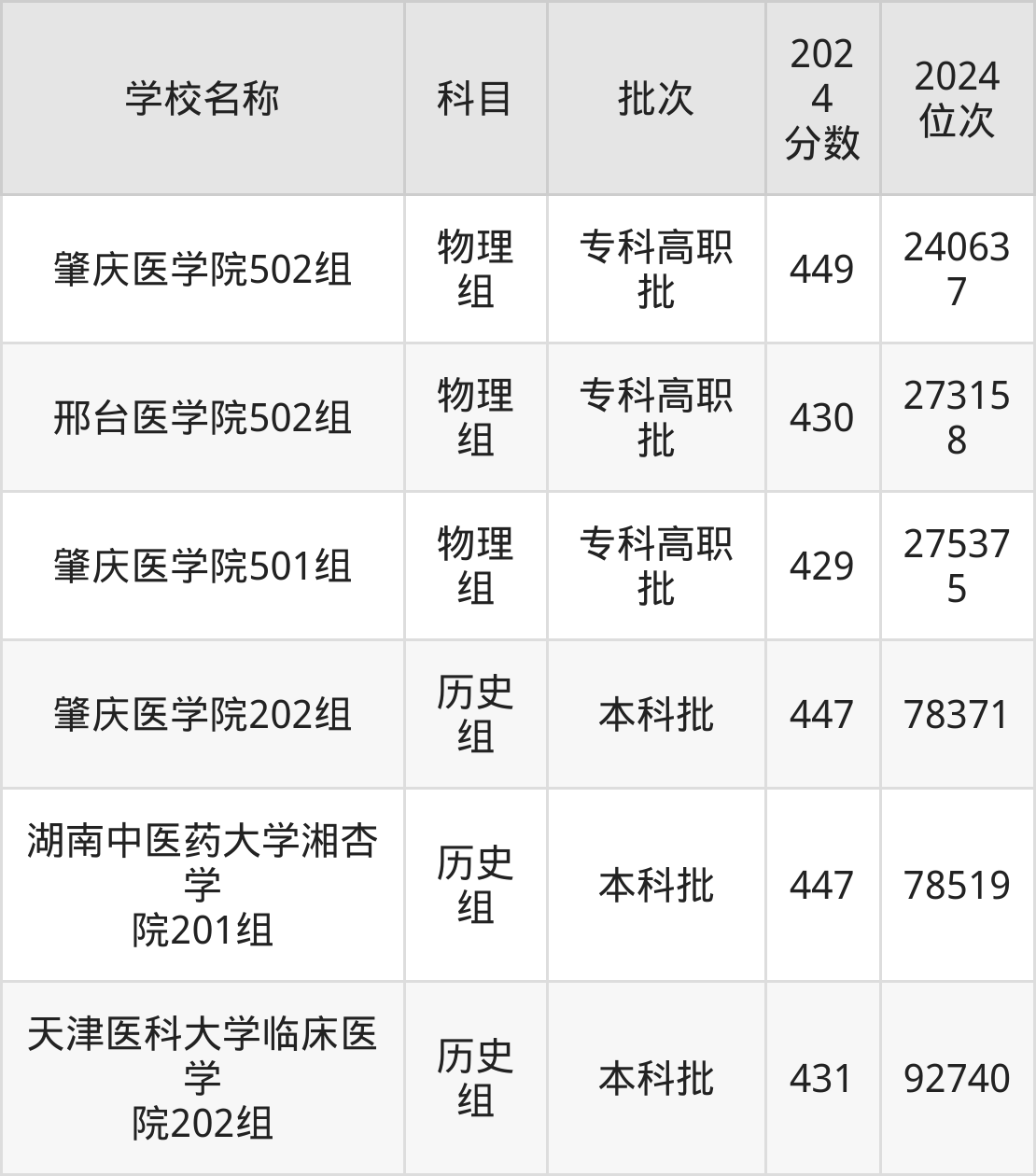 广东高考历史组共有3所二本医学院在410到450分之间录取,包含肇庆医学院、湖南中医药大学湘杏学院、天津医科大学临床医学院。