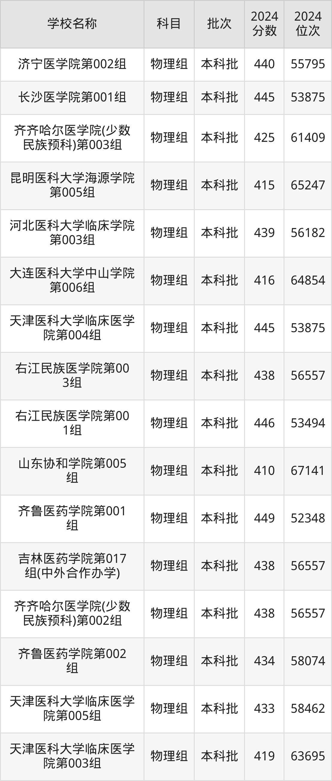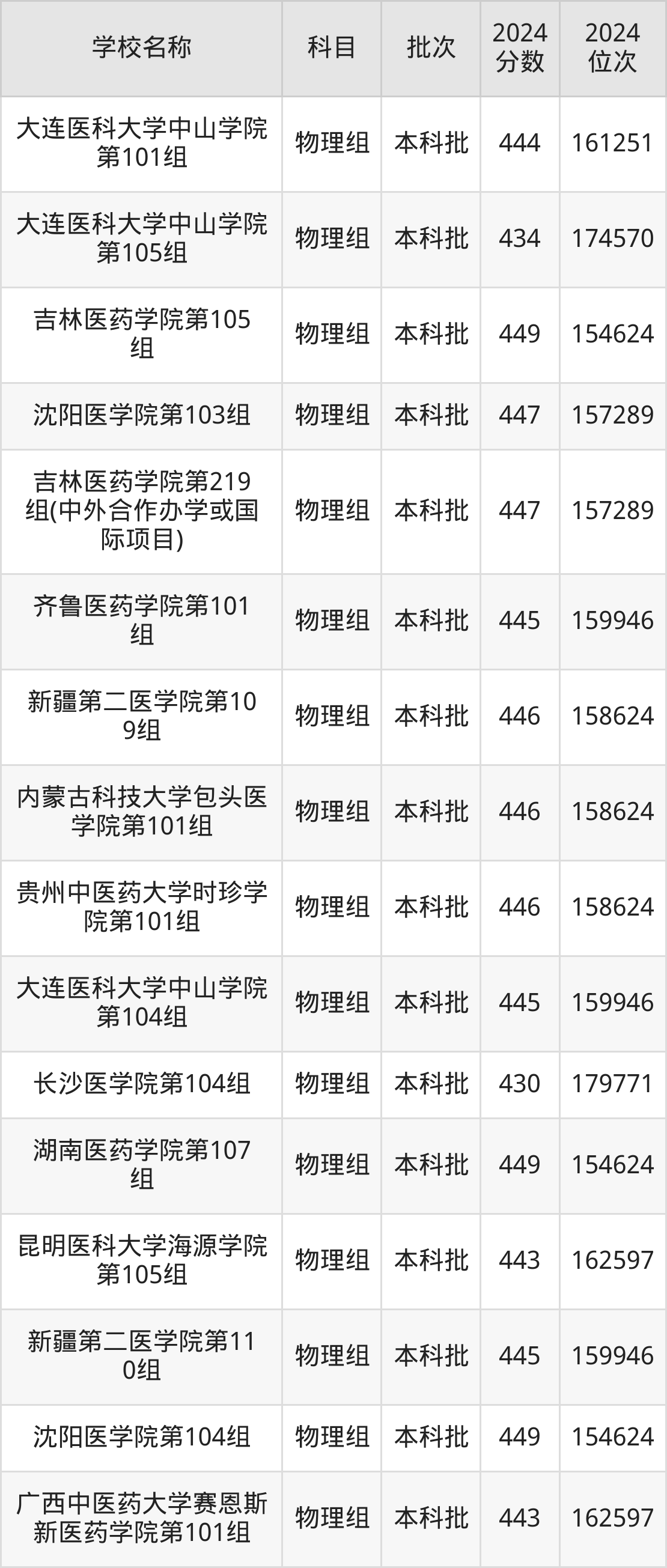 湖南高考物理组共有15所二本医学院在410到450分之间录取,包含沈阳医学院、湖南医药学院、吉林医药学院、肇庆医学院、新疆第二医学院、内蒙古科技大学包头医学院、贵州中医药大学时珍学院、大连医科大学中山学院、齐鲁医药学院、昆明医科大学海源学院。