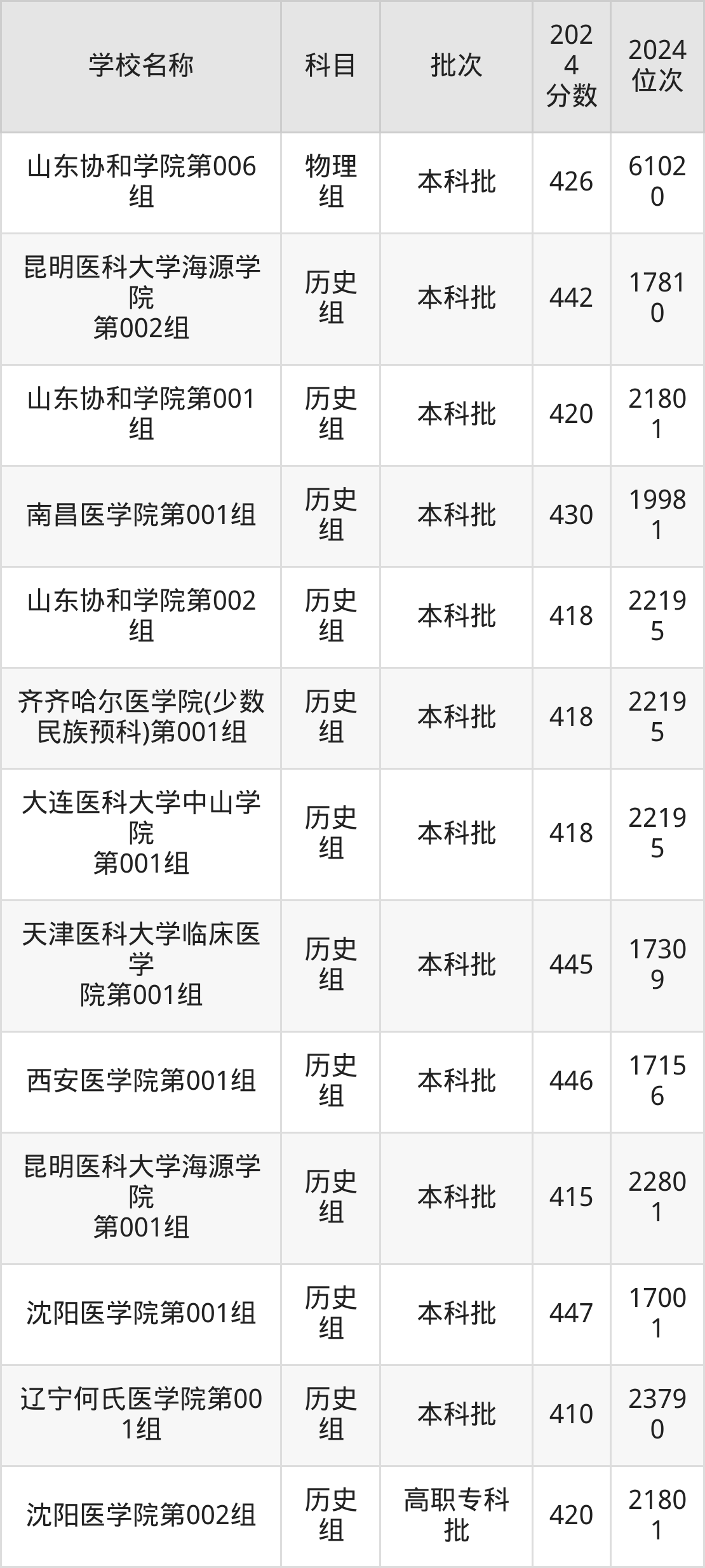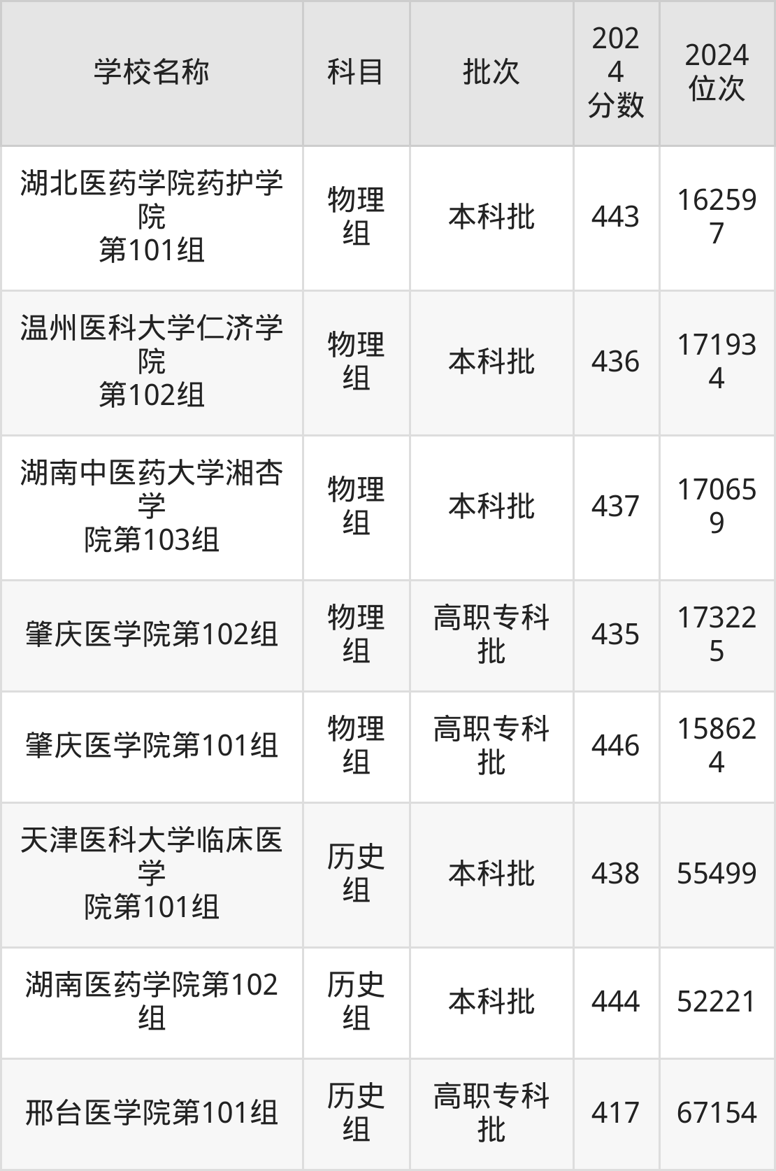 湖南高考历史组共有3所二本医学院在410到450分之间录取,包含湖南医药学院、天津医科大学临床医学院、邢台医学院。