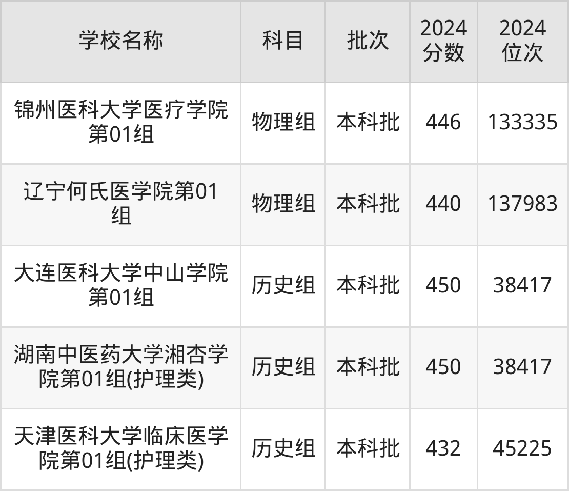 湖北高考历史组共有3所二本医学院在410到450分之间录取,包含大连医科大学中山学院、湖南中医药大学湘杏学院、天津医科大学临床医学院。