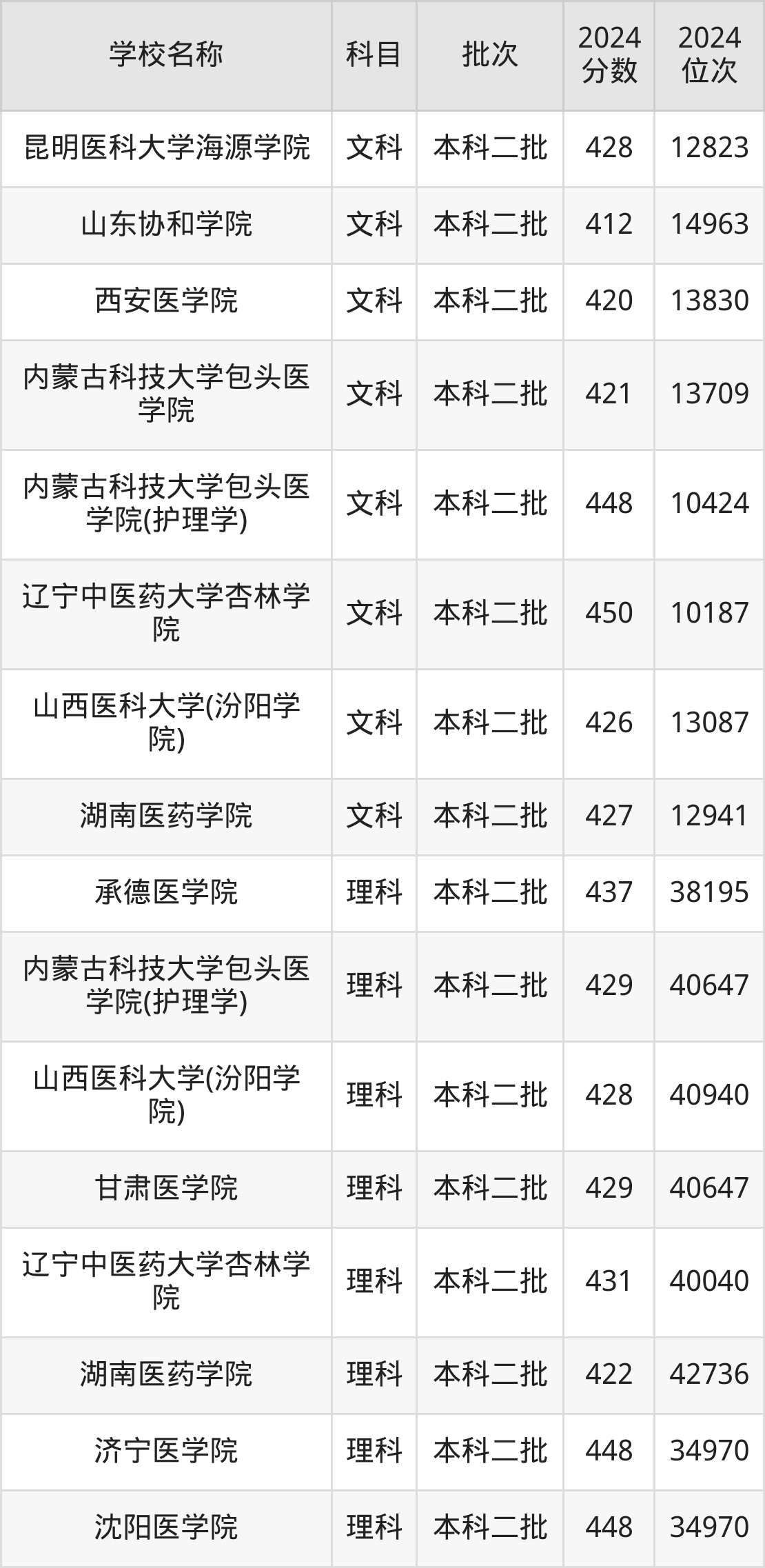 内蒙古高考文科共有8所二本医学院在410到450分之间录取,包含辽宁中医药大学杏林学院、内蒙古科技大学包头医学院(护理学)、昆明医科大学海源学院、湖南医药学院、山西医科大学(汾阳学院)、内蒙古科技大学包头医学院、西安医学院、山东协和学院。