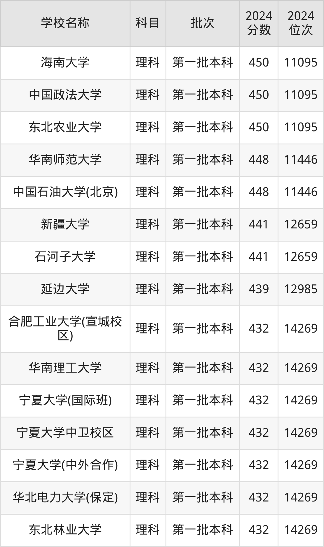 宁夏高考理科共有15所211大学在400到450分之间录取,包含海南大学、中国政法大学、东北农业大学、华南师范大学、中国石油大学(北京)、新疆大学、石河子大学、延边大学、合肥工业大学(宣城校区)、华南理工大学。