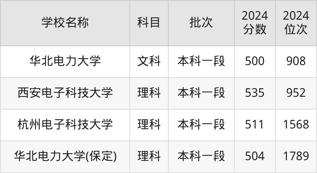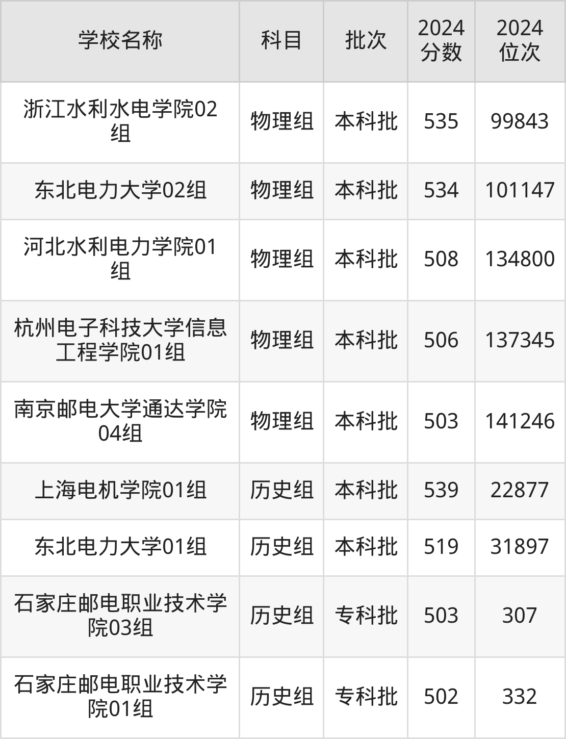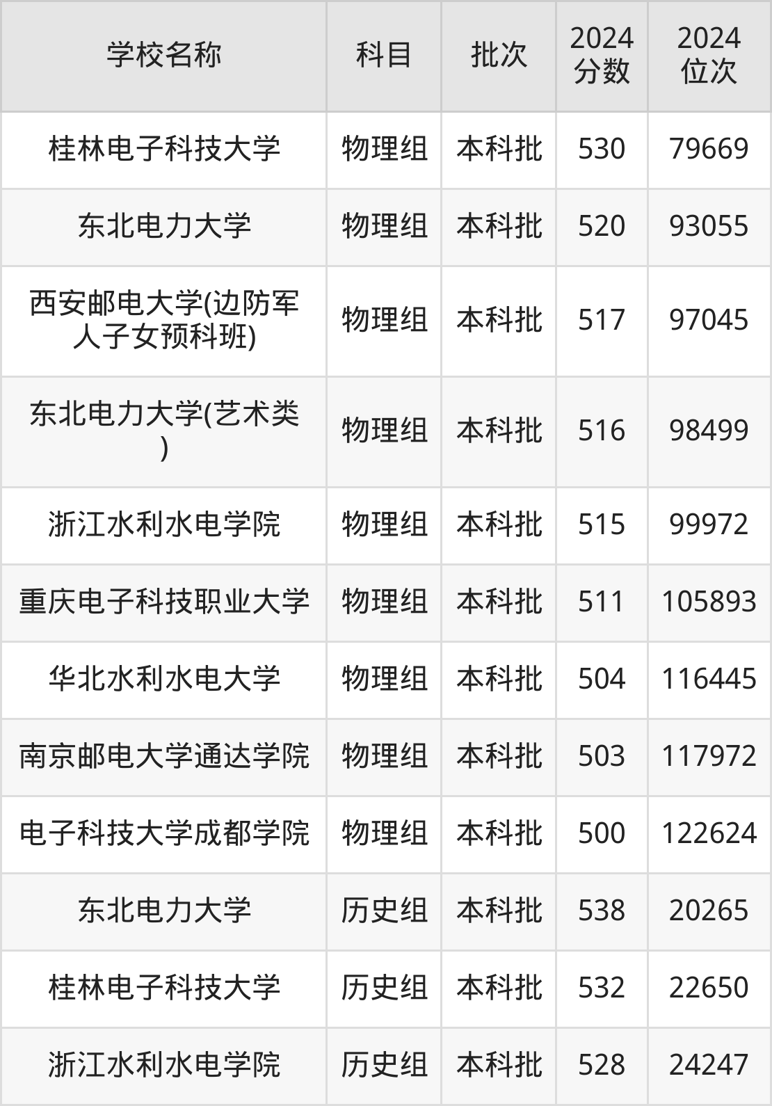 河北高考历史组共有3所电力大学在500到540分之间录取,包含东北电力大学、桂林电子科技大学、浙江水利水电学院。
