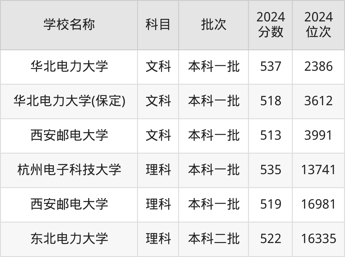 内蒙古高考文科共有3所电力大学在500到540分之间录取,包含华北电力大学、华北电力大学(保定)、西安邮电大学。