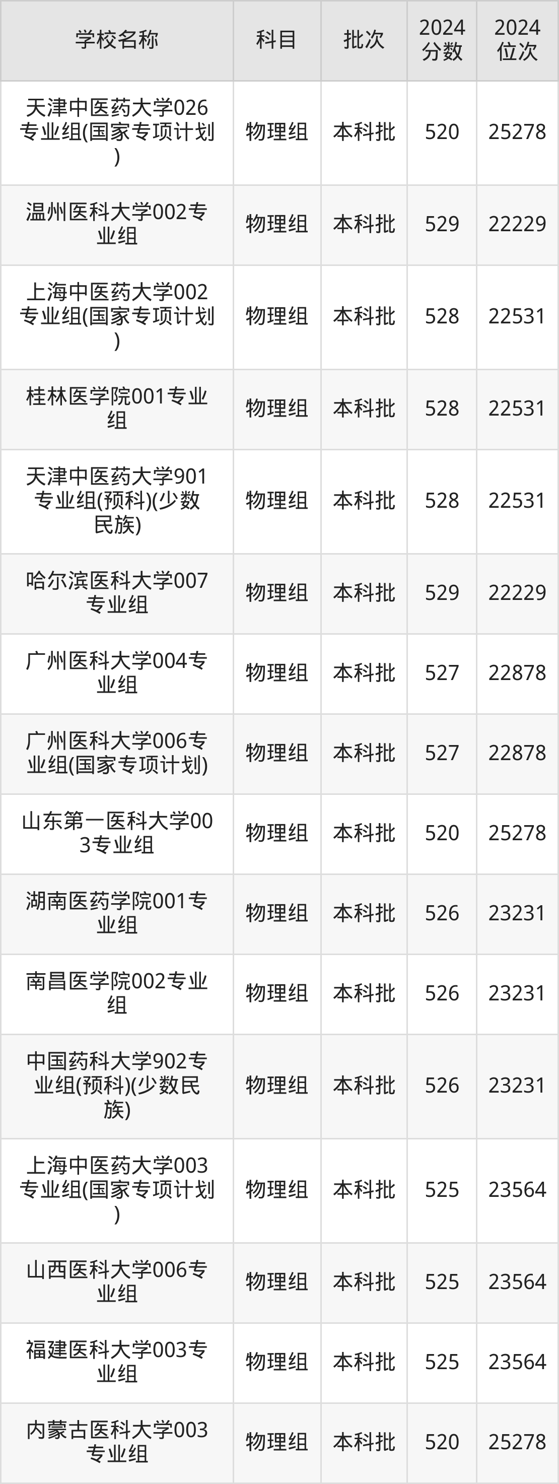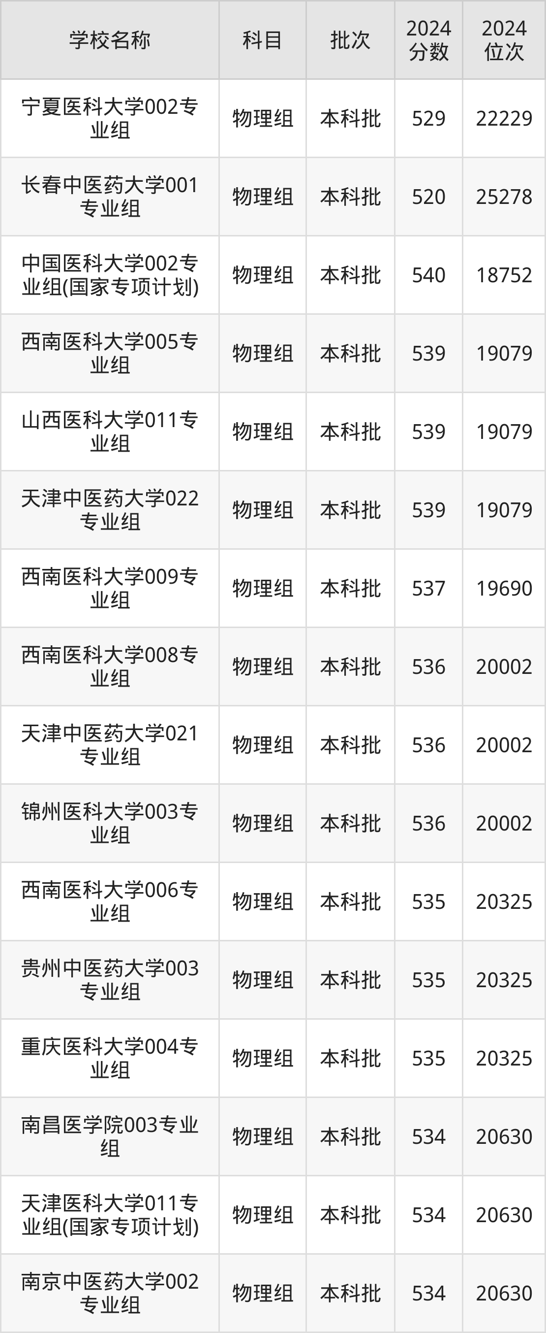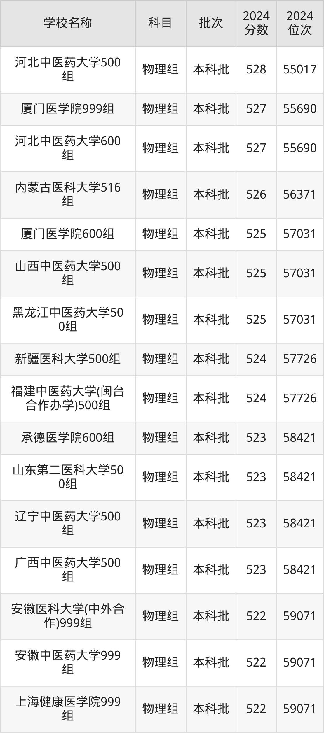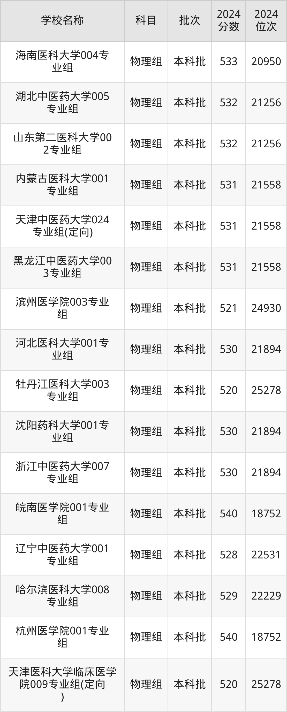 辽宁高考物理组共有9所医科大学在520到540分之间录取,包含天津中医药大学、陕西中医药大学、浙江中医药大学、河北医科大学、广东医科大学、江西中医药大学、成都中医药大学、湖南中医药大学、沈阳药科大学。