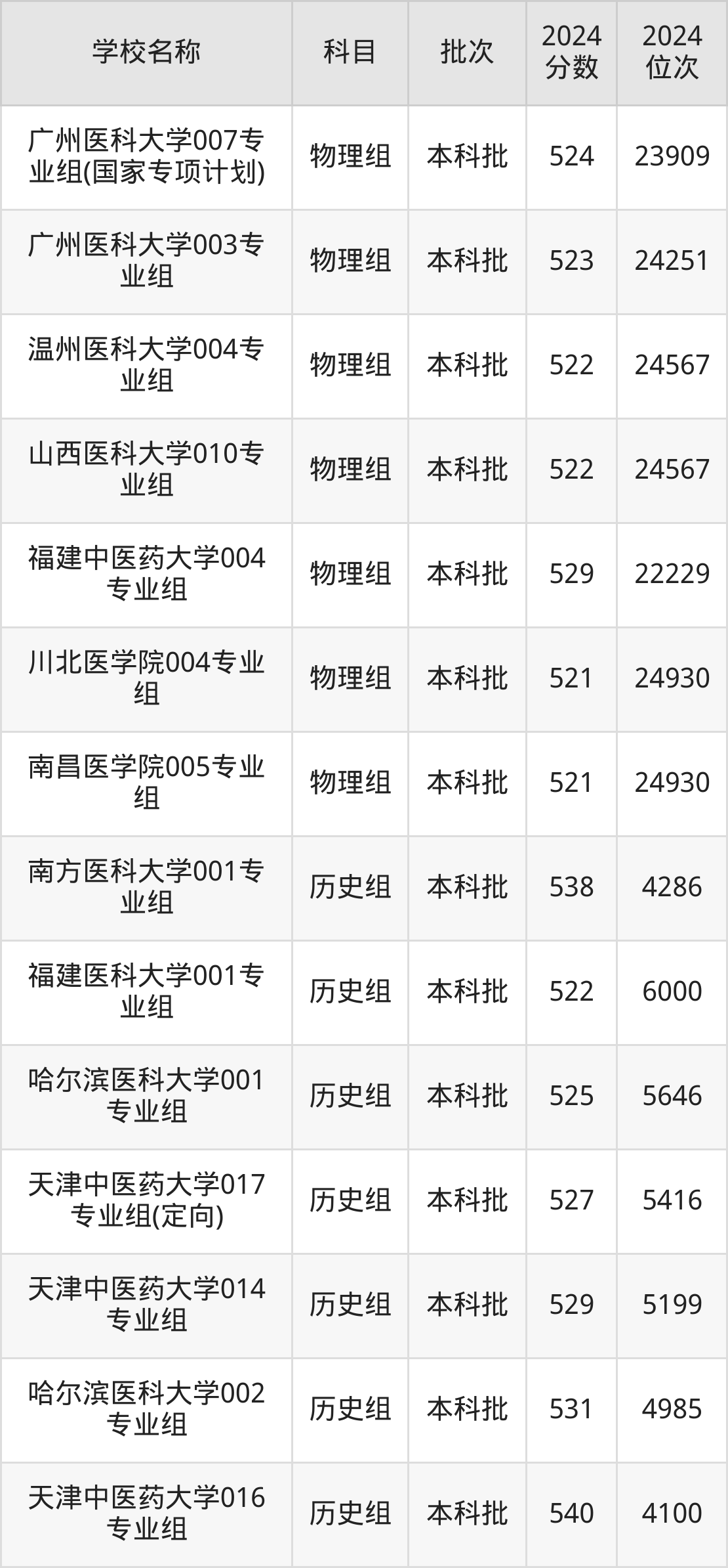 甘肃高考历史组共有4所医科大学在520到540分之间录取,包含天津中医药大学、南方医科大学、哈尔滨医科大学、福建医科大学。