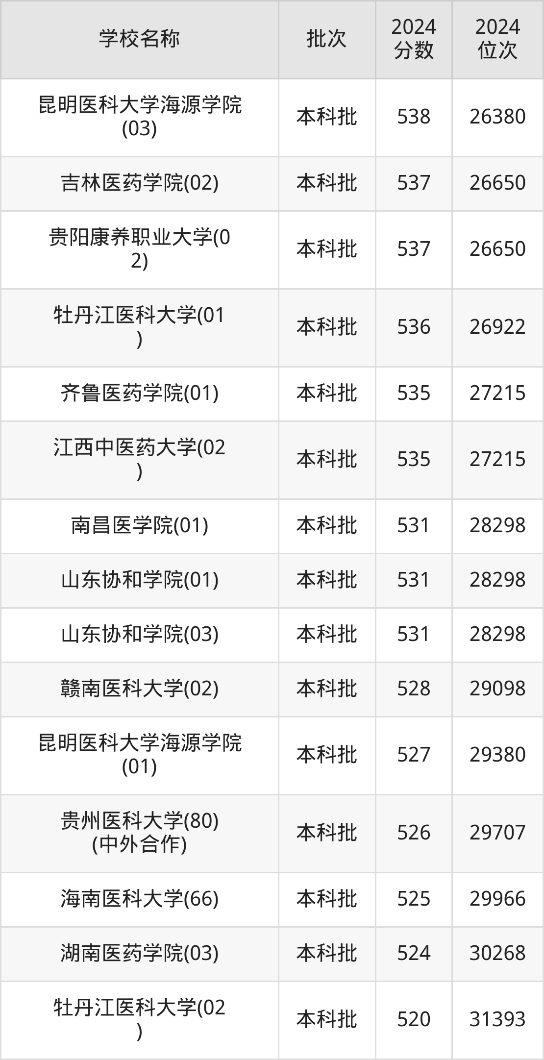 海南高考共有12所医科大学在520到540分之间录取,包含昆明医科大学海源学院、吉林医药学院、贵阳康养职业大学、牡丹江医科大学、齐鲁医药学院、江西中医药大学、南昌医学院、山东协和学院、赣南医科大学、贵州医科大学。