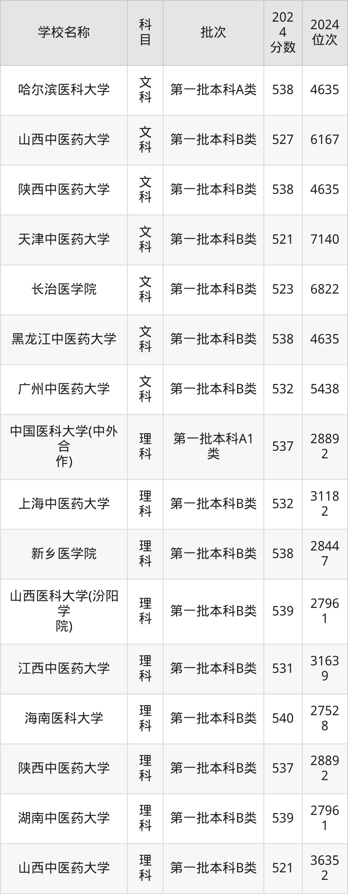 山西高考文科共有7所医科大学在520到540分之间录取,包含陕西中医药大学、哈尔滨医科大学、黑龙江中医药大学、广州中医药大学、山西中医药大学、长治医学院、天津中医药大学。