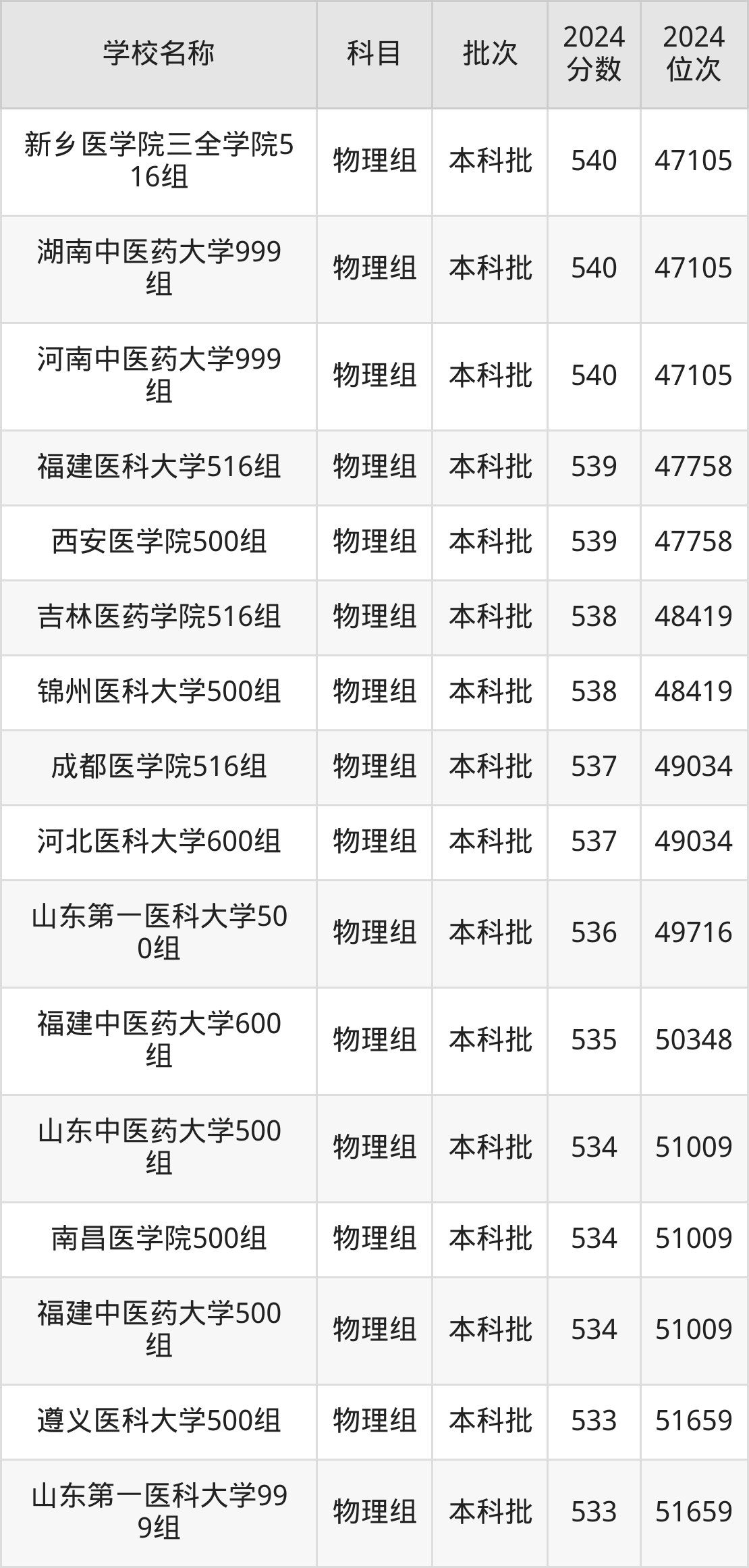 福建高考物理组共有39所医科大学在520到540分之间录取,包含新乡医学院三全学院、湖南中医药大学、河南中医药大学、福建医科大学、西安医学院、吉林医药学院、锦州医科大学、成都医学院、河北医科大学、山东第一医科大学。