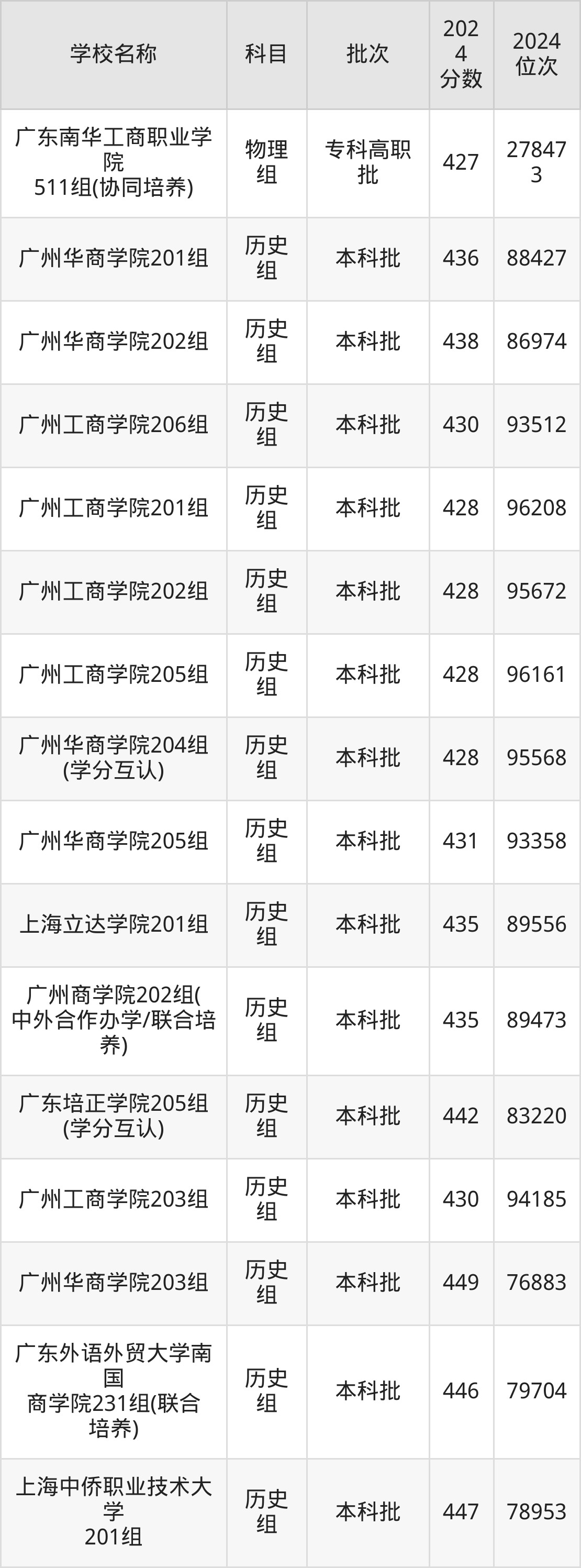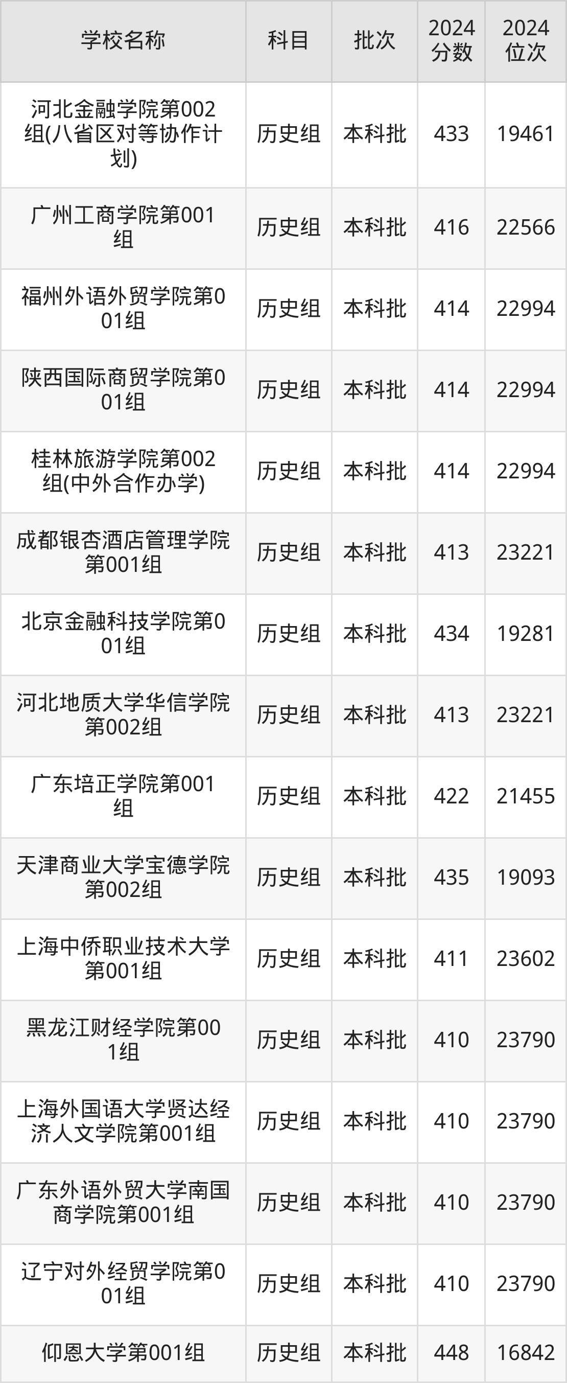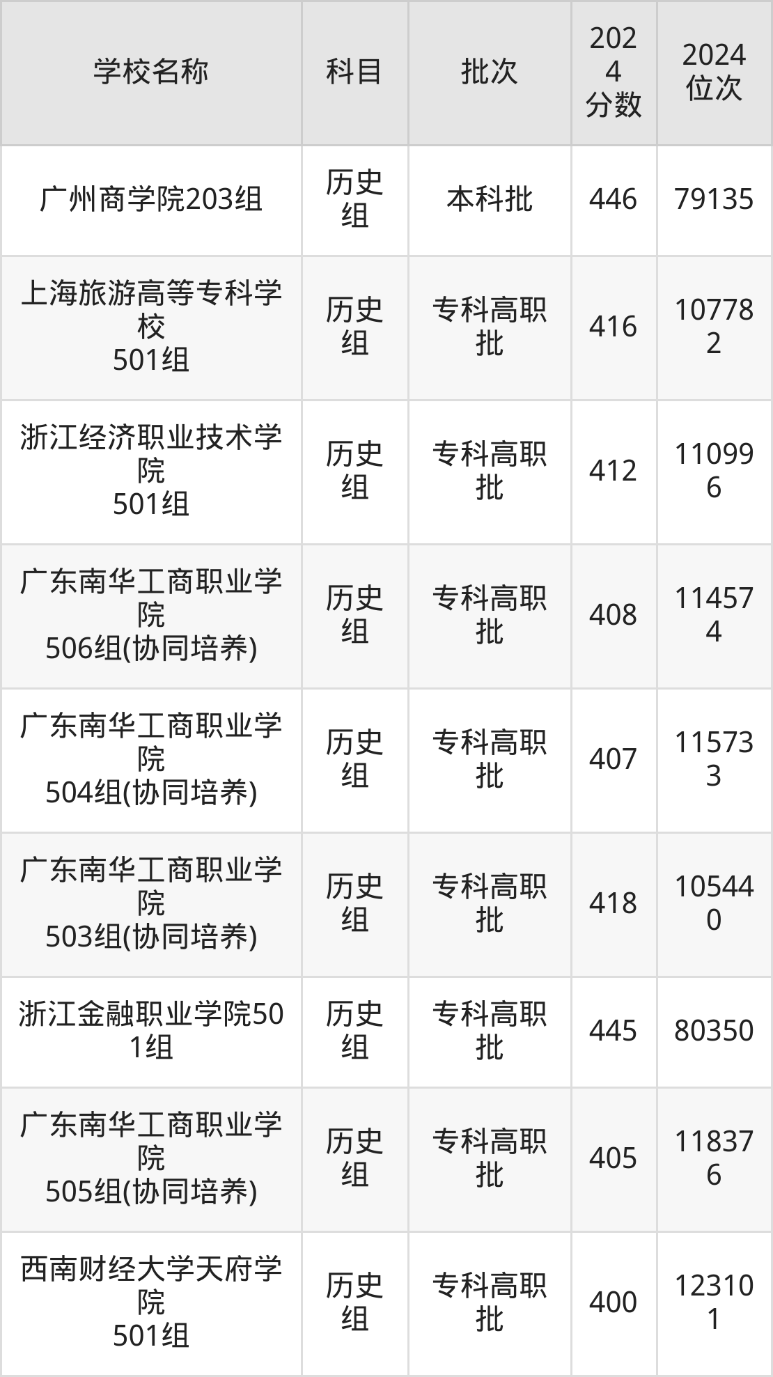 广东高考历史组共有12所财经大学在400到450分之间录取,包含广州华商学院、上海中侨职业技术大学、广州商学院、广东外语外贸大学南国商学院、浙江金融职业学院、广东培正学院、上海立达学院、广州工商学院、广东南华工商职业学院、上海旅游高等专科学校。