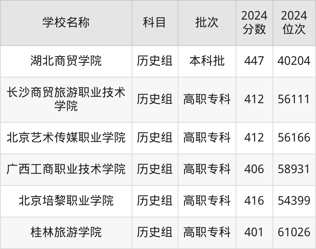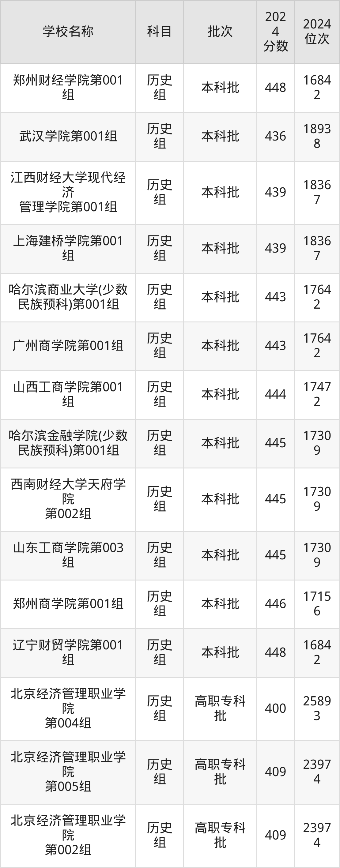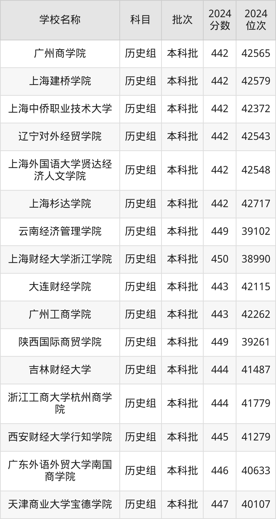 广东高考历史组共有12所财经大学在400到450分之间录取,包含广州华商学院、上海中侨职业技术大学、广州商学院、广东外语外贸大学南国商学院、浙江金融职业学院、广东培正学院、上海立达学院、广州工商学院、广东南华工商职业学院、上海旅游高等专科学校。