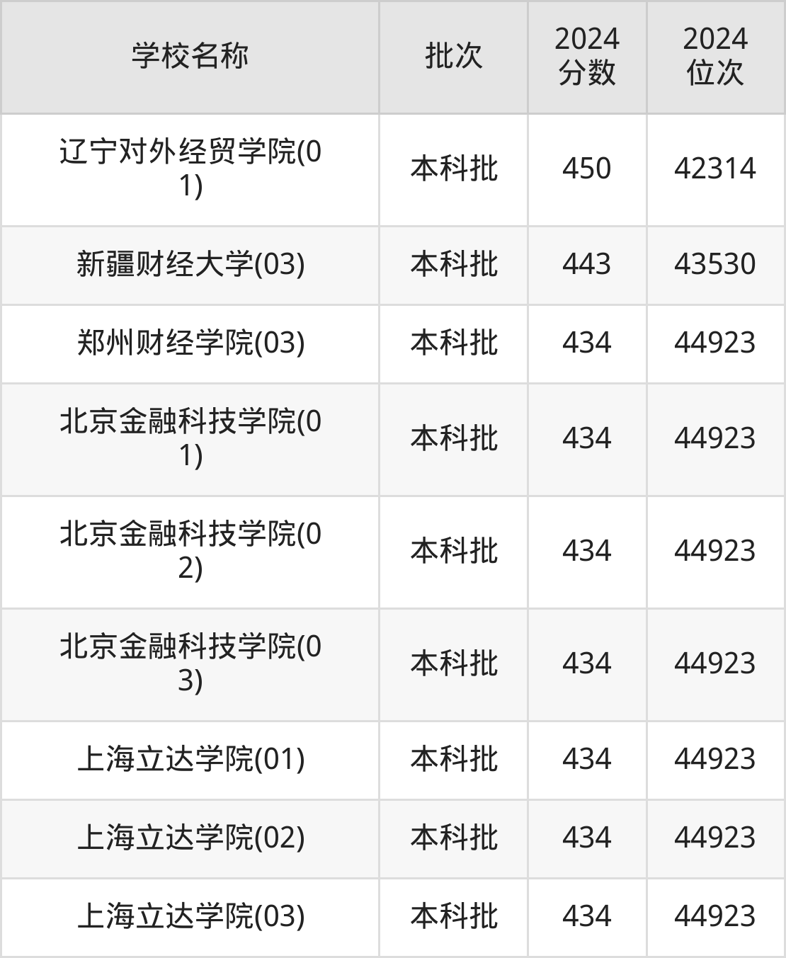 北京高考共有5所财经大学在400到450分之间录取,包含辽宁对外经贸学院、新疆财经大学、郑州财经学院、北京金融科技学院、上海立达学院。