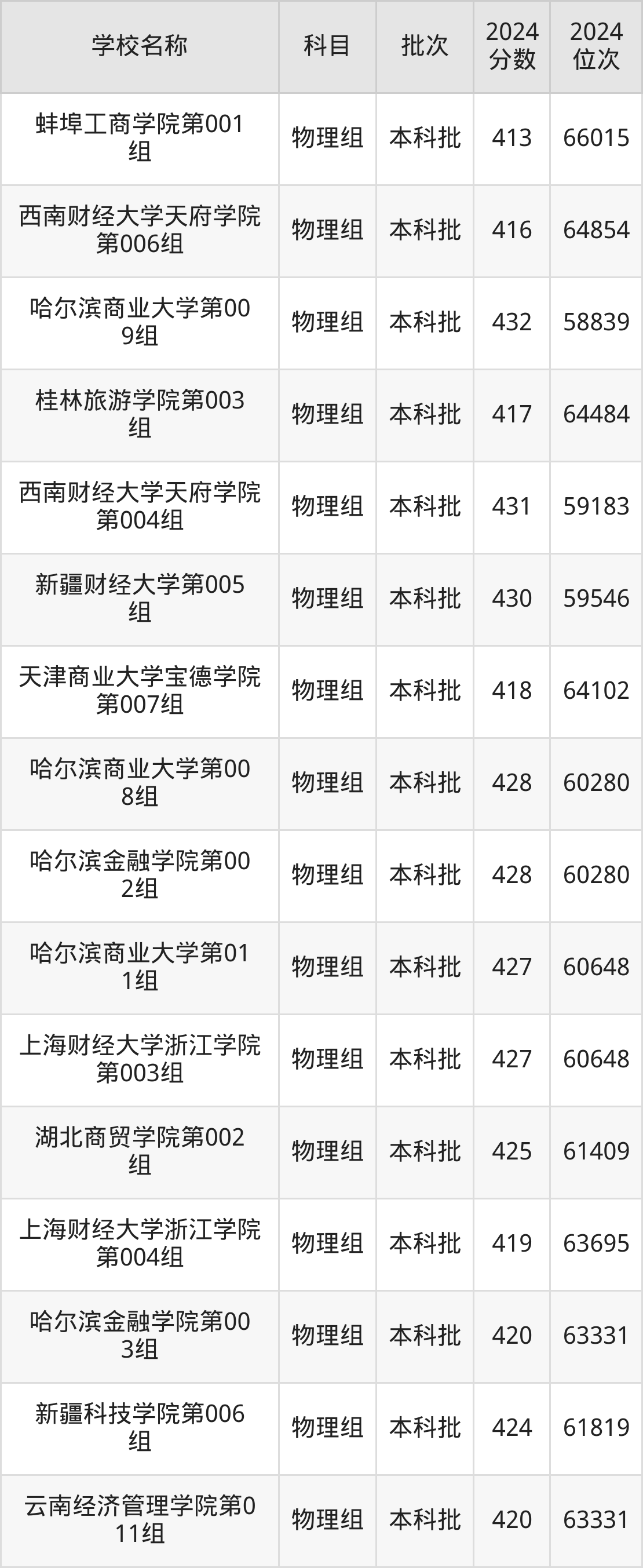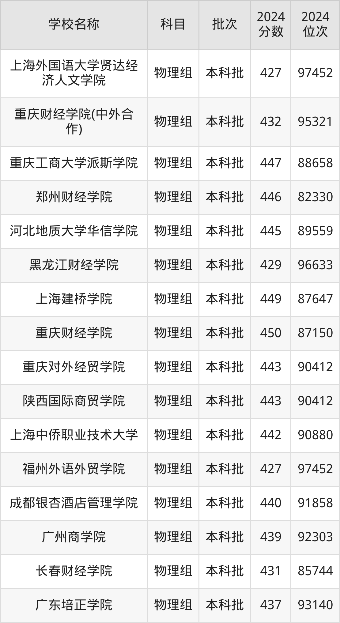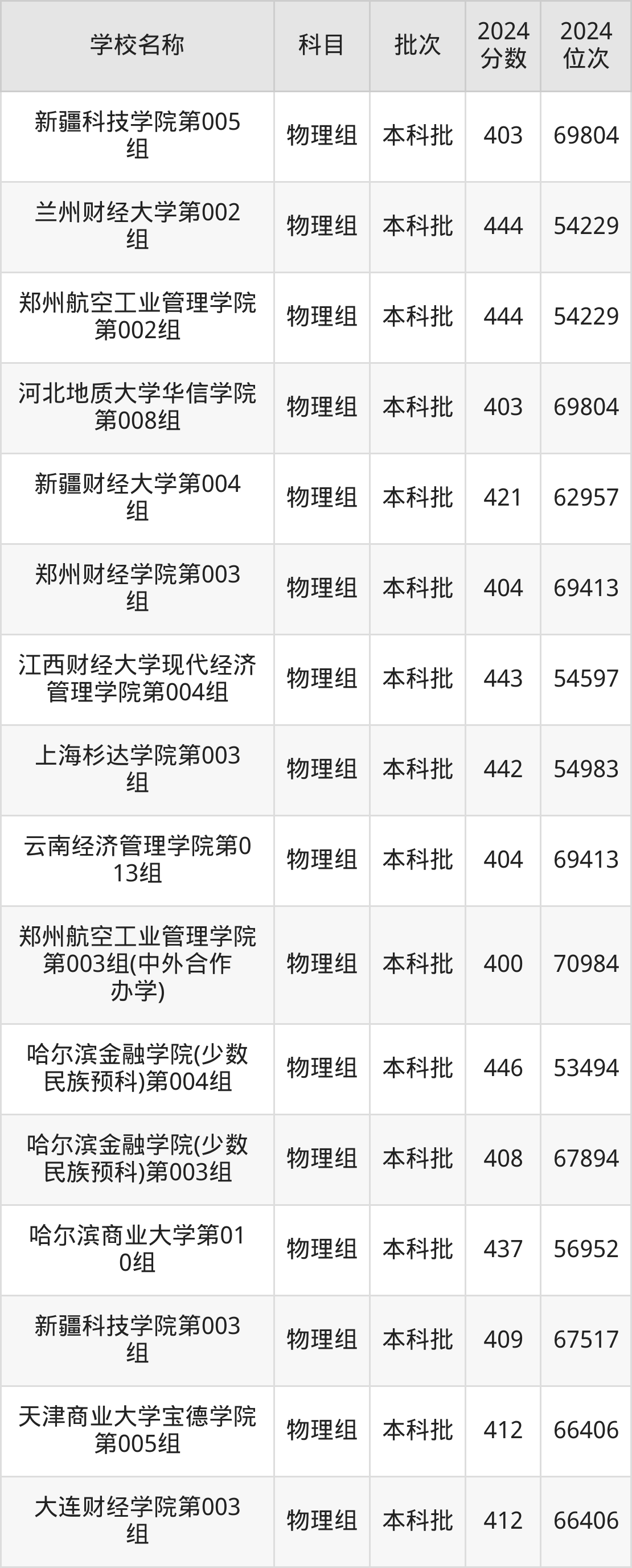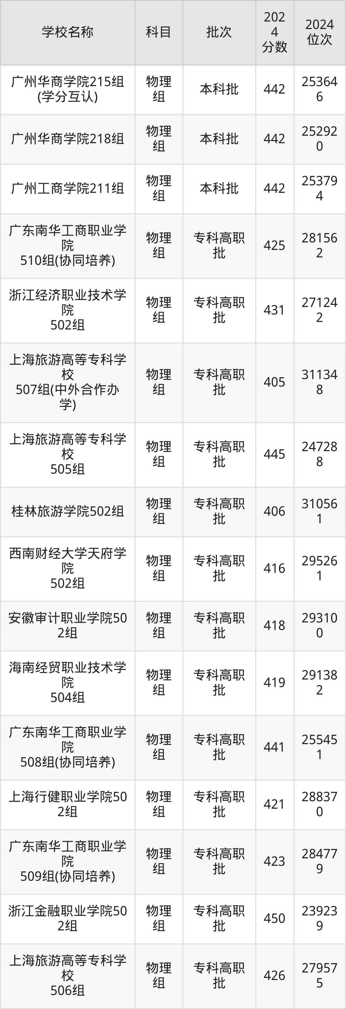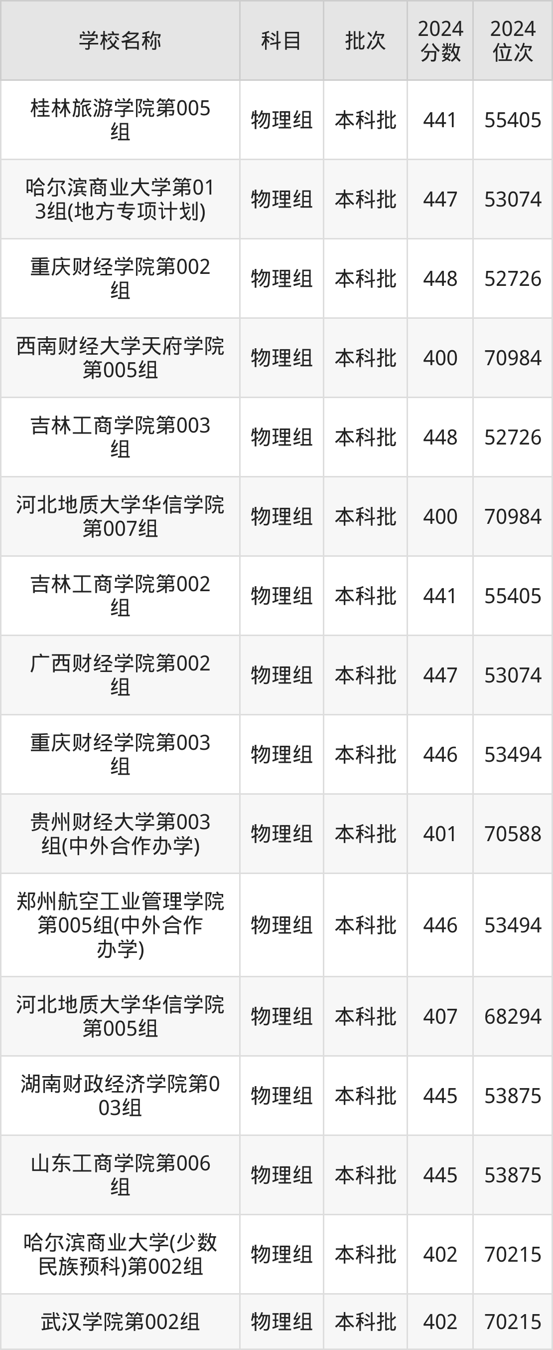 广东高考物理组共有12所财经大学在400到450分之间录取,包含浙江金融职业学院、广州商学院、广州工商学院、上海旅游高等专科学校、广州华商学院、广东南华工商职业学院、浙江经济职业技术学院、上海行健职业学院、海南经贸职业技术学院、安徽审计职业学院。