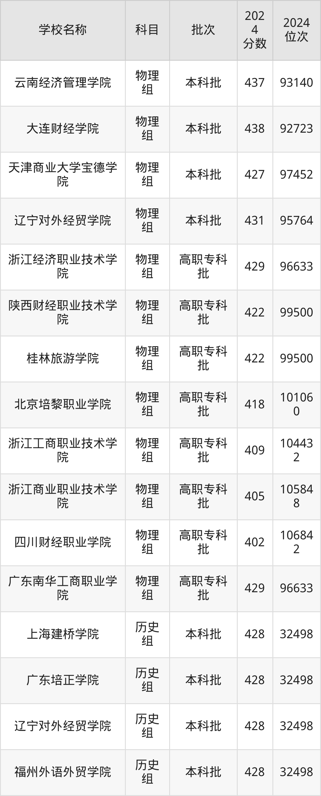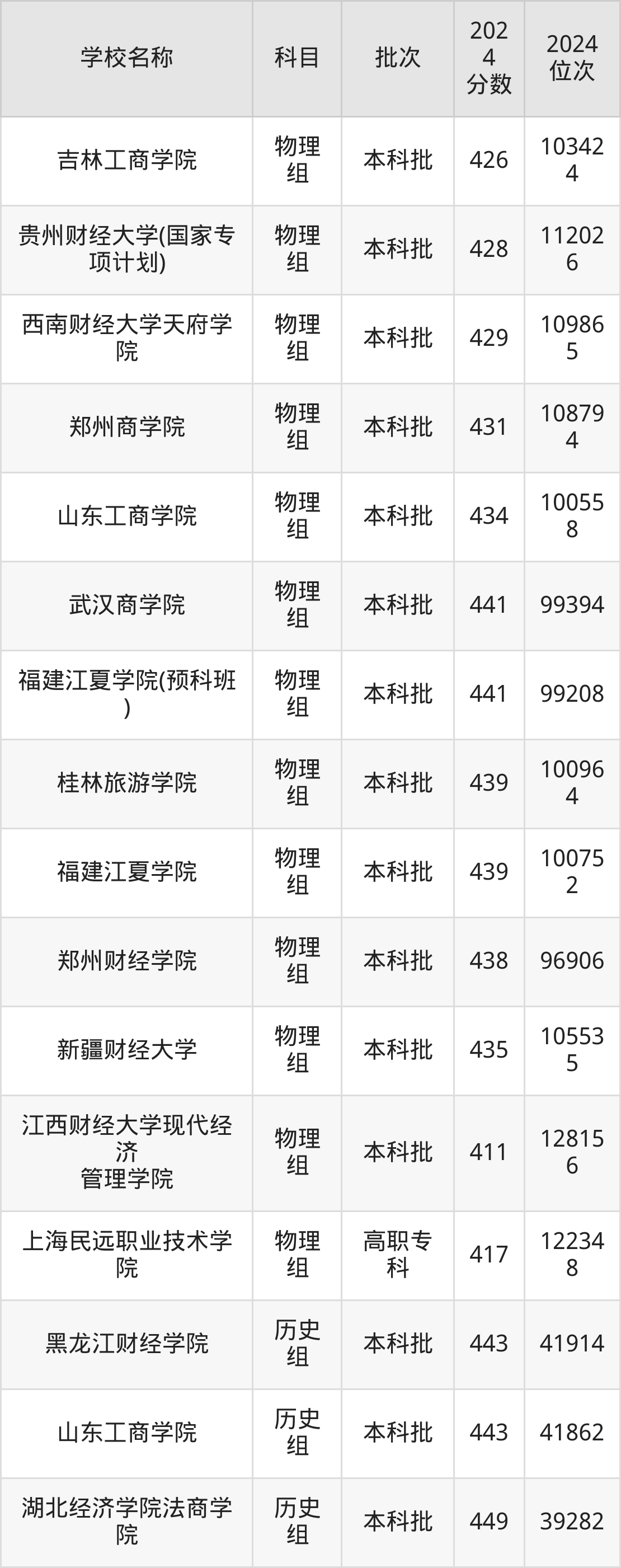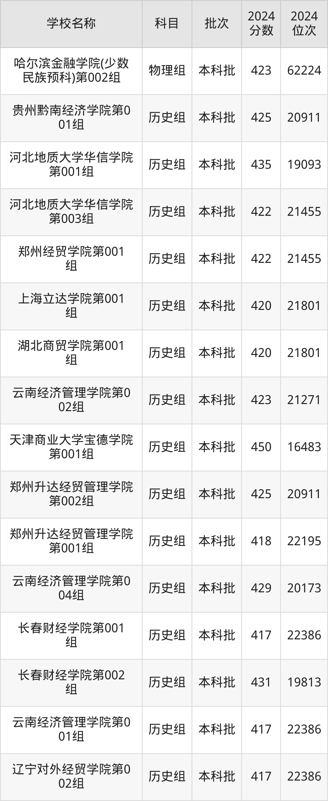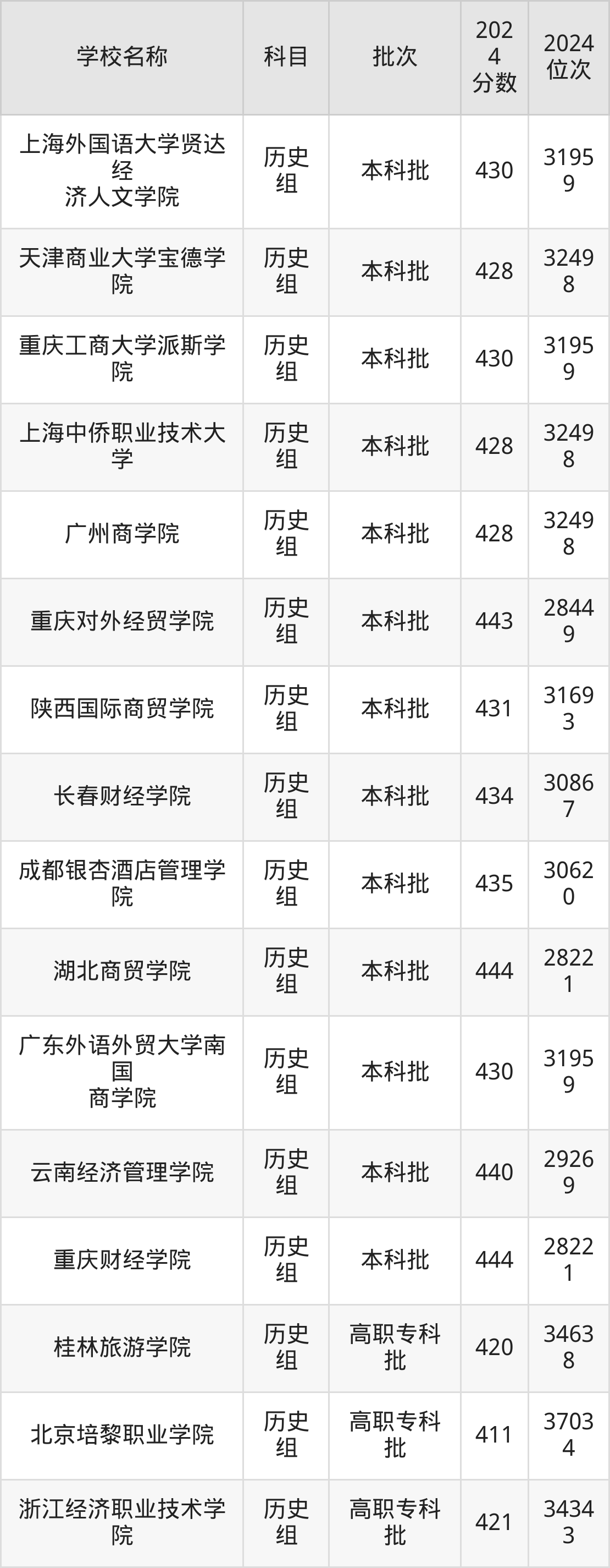 贵州高考历史组共有25所财经大学在400到450分之间录取,包含上海财经大学浙江学院、云南经济管理学院、湖北经济学院法商学院、陕西国际商贸学院、天津商业大学宝德学院、湖北商贸学院、广东外语外贸大学南国商学院、西安财经大学行知学院、浙江工商大学杭州商学院、吉林财经大学。