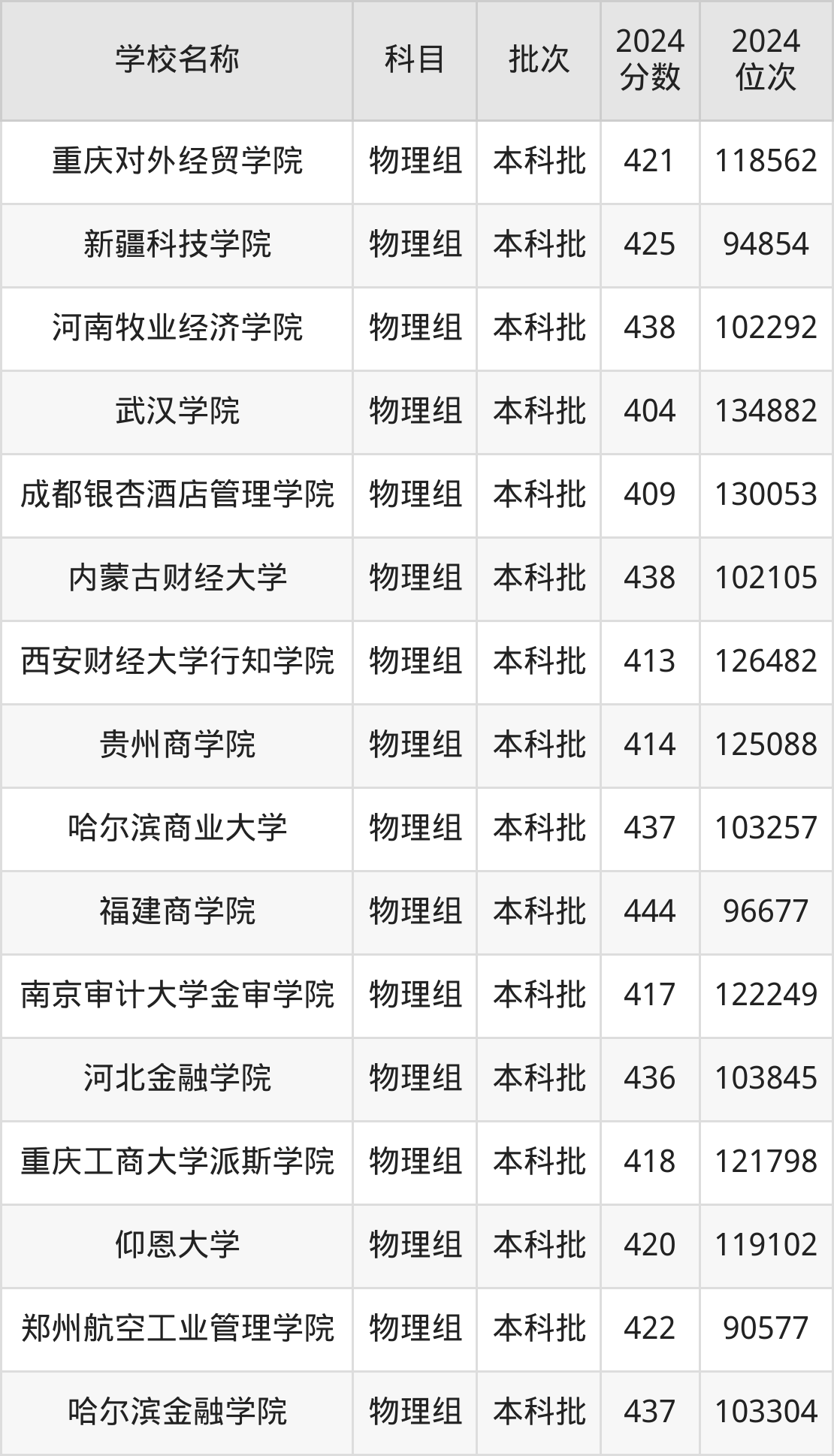 贵州高考物理组共有29所财经大学在400到450分之间录取,包含福建商学院、武汉商学院、福建江夏学院(预科班)、桂林旅游学院、福建江夏学院、郑州财经学院、河南牧业经济学院、内蒙古财经大学、哈尔滨商业大学、哈尔滨金融学院。