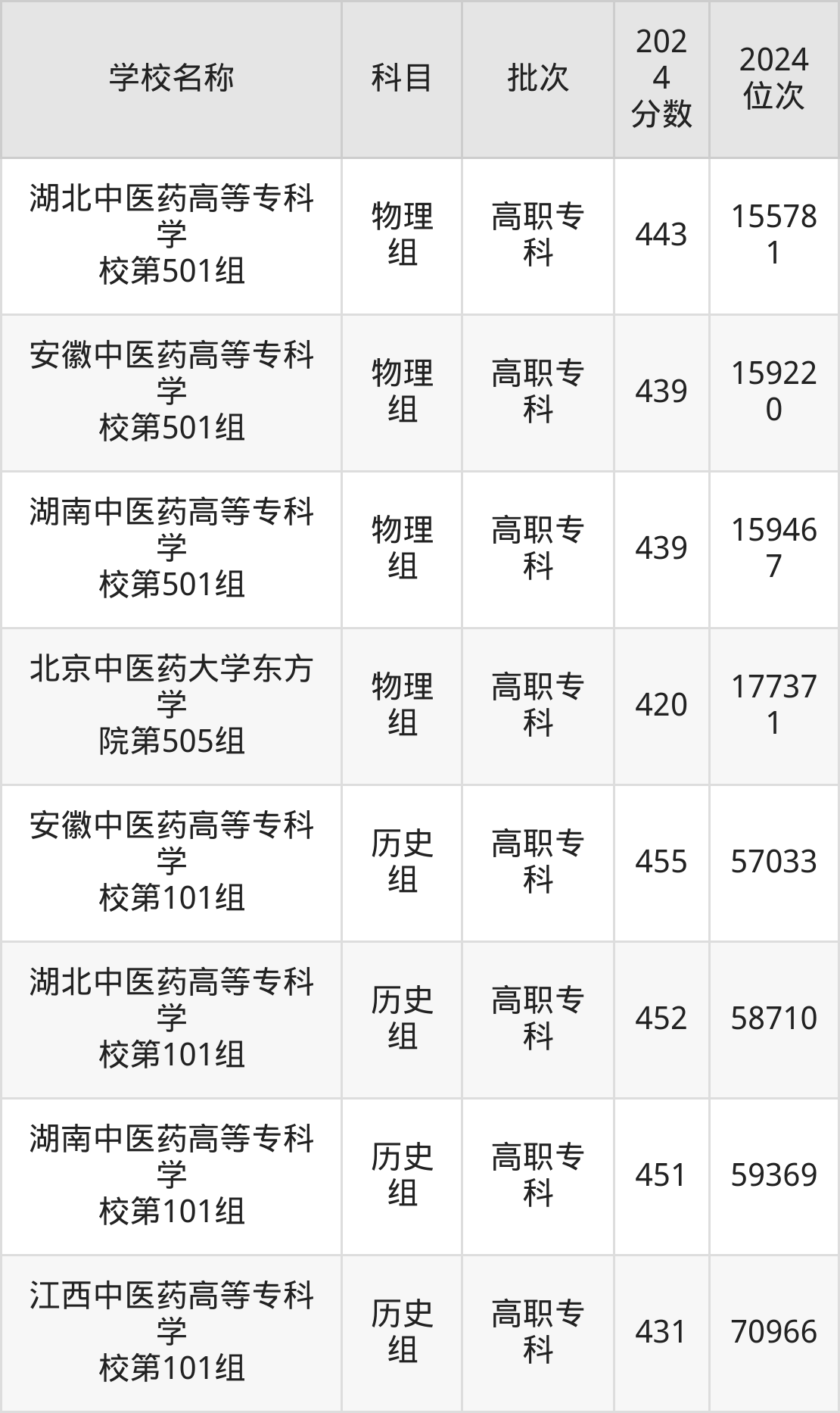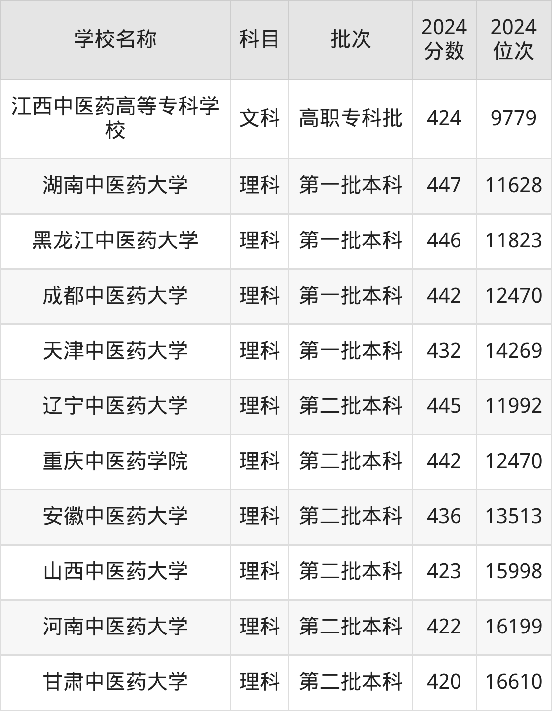 江西高考历史组共有4所中医药大学在420到460分之间录取,包含安徽中医药高等专科学校、湖北中医药高等专科学校、湖南中医药高等专科学校、江西中医药高等专科学校。