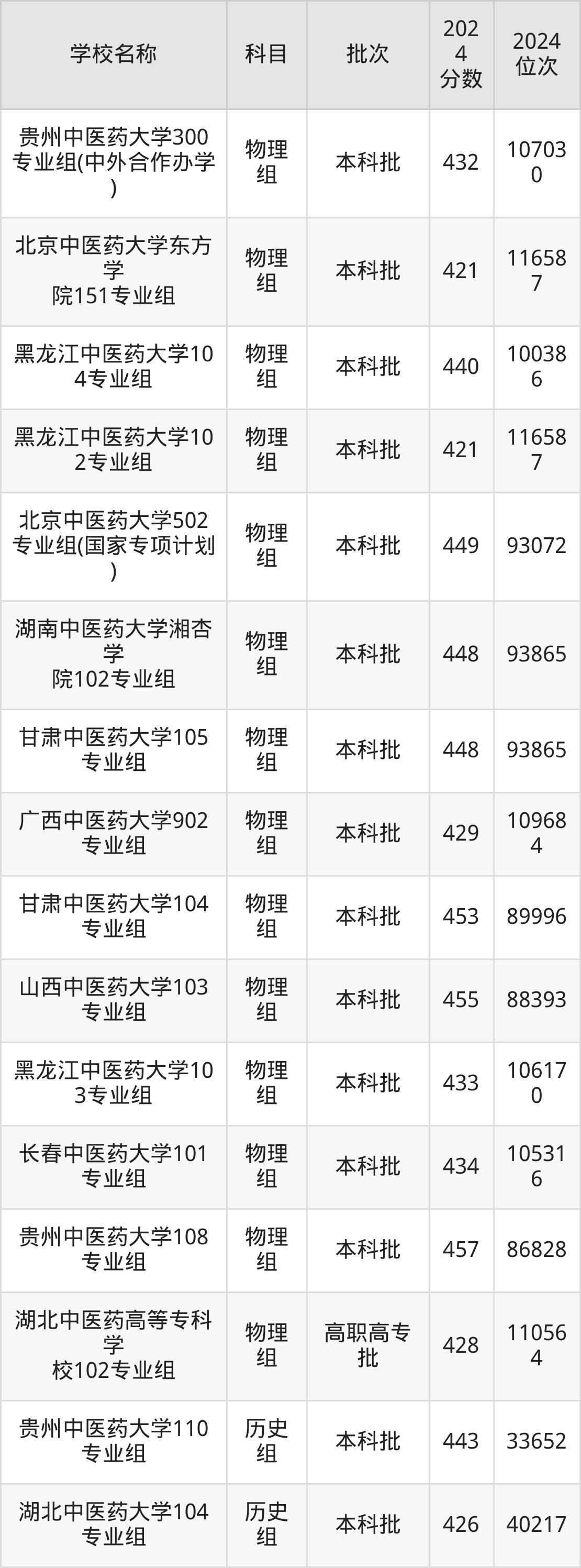 广西高考物理组共有10所中医药大学在420到460分之间录取,包含贵州中医药大学、山西中医药大学、甘肃中医药大学、北京中医药大学、湖南中医药大学湘杏学院、黑龙江中医药大学、长春中医药大学、广西中医药大学、湖北中医药高等专科学校、北京中医药大学东方学院。