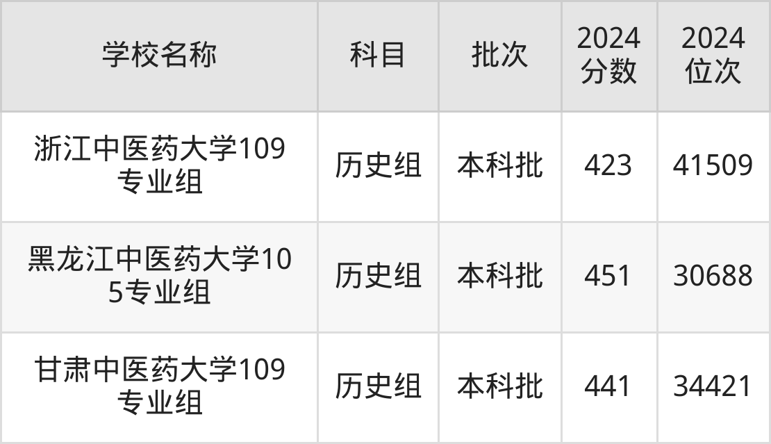 广西高考历史组共有5所中医药大学在420到460分之间录取,包含黑龙江中医药大学、贵州中医药大学、甘肃中医药大学、湖北中医药大学、浙江中医药大学。