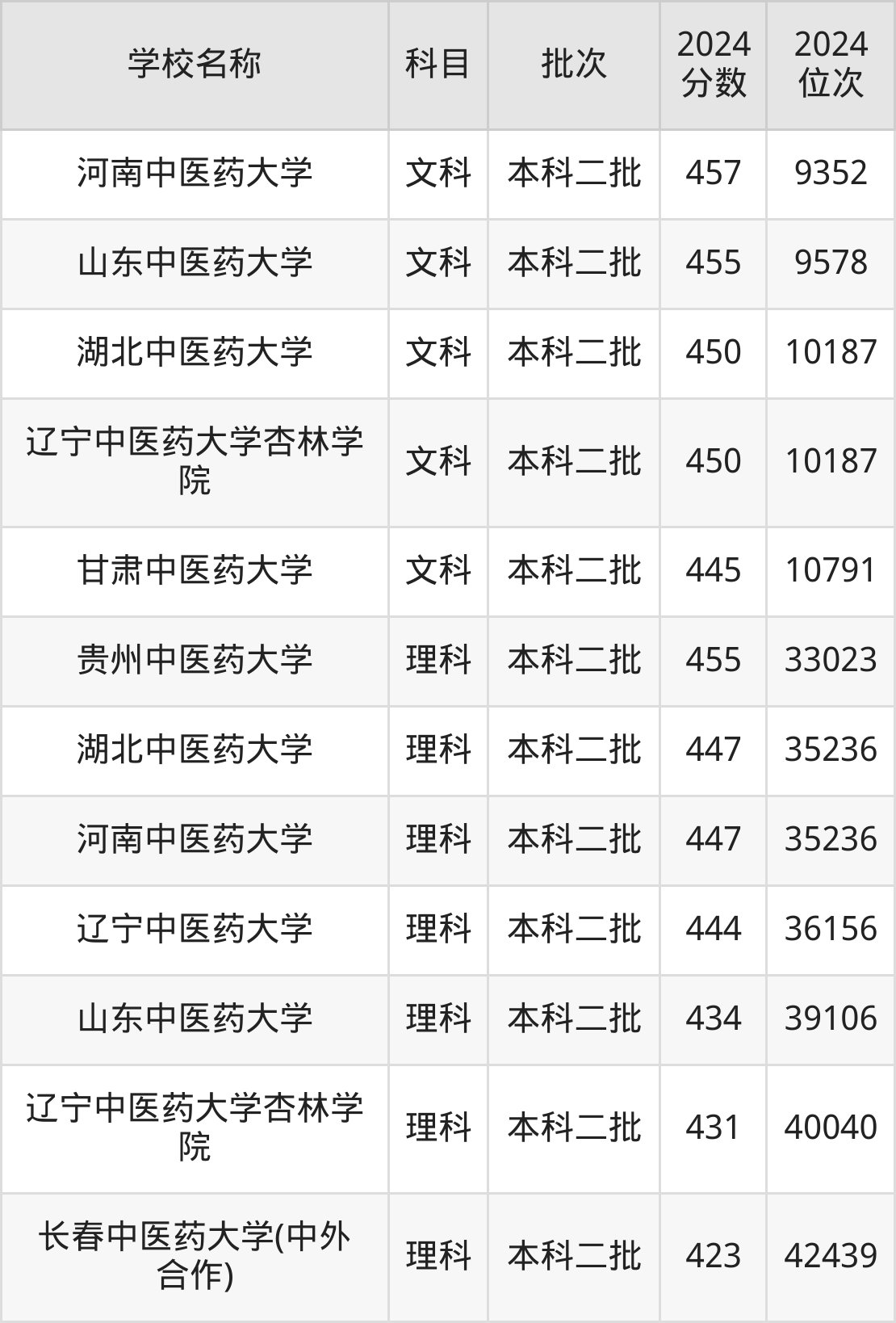 内蒙古高考文科共有5所中医药大学在420到460分之间录取,包含河南中医药大学、山东中医药大学、湖北中医药大学、辽宁中医药大学杏林学院、甘肃中医药大学。