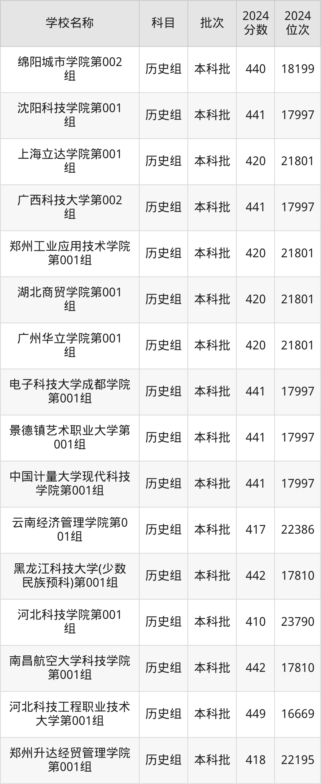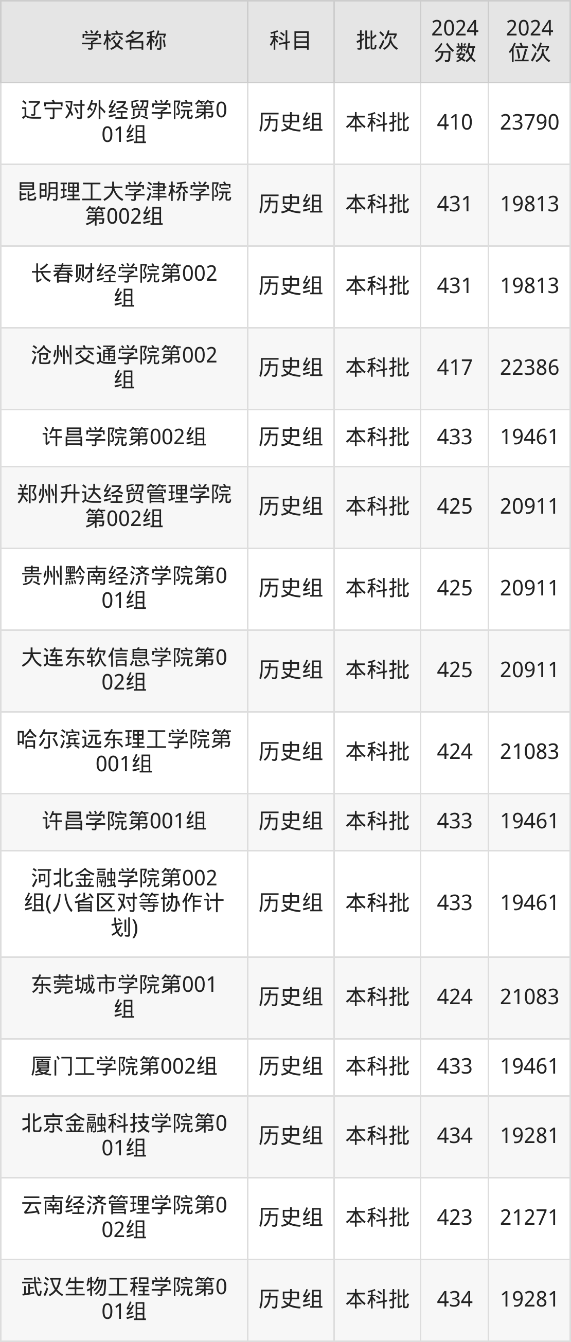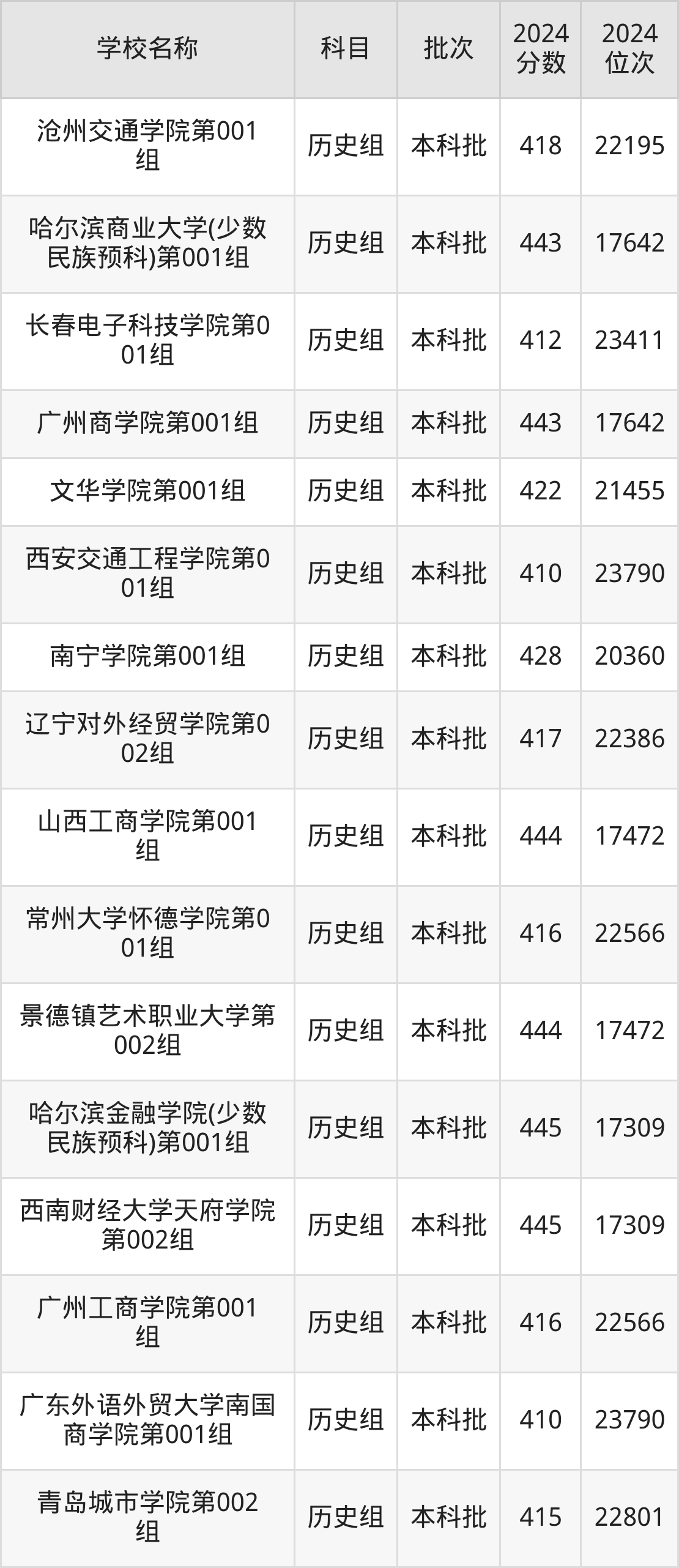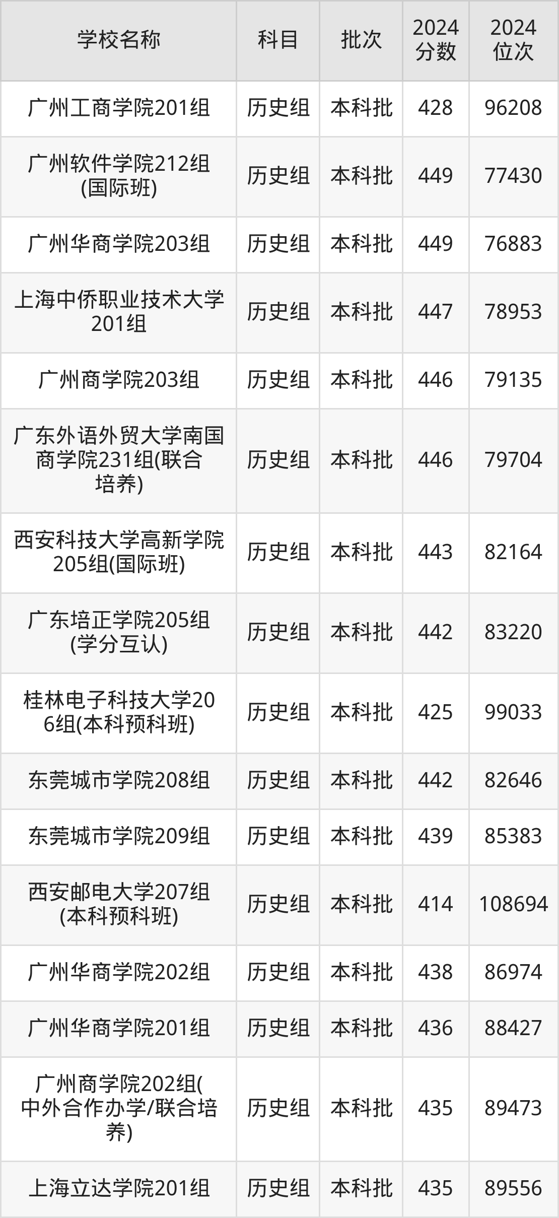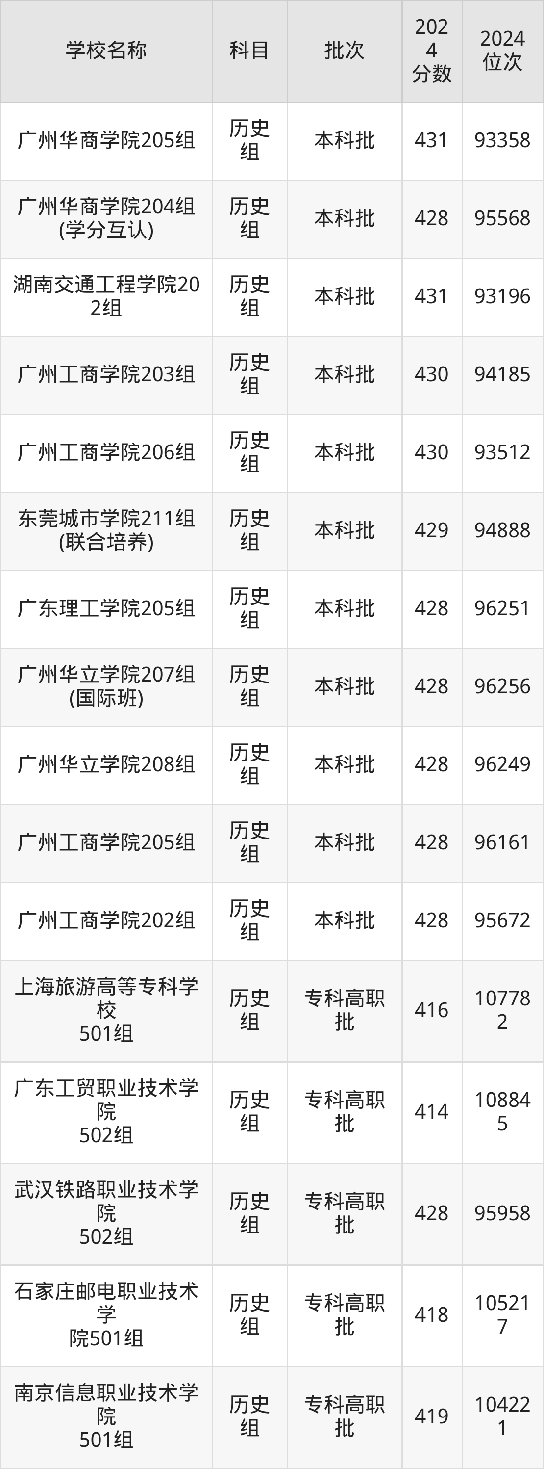 广东高考历史组共有51所理科大学在410到450分之间录取,包含广州软件学院、广州华商学院、上海中侨职业技术大学、广州商学院、广东外语外贸大学南国商学院、浙江金融职业学院、湖南高速铁路职业技术学院、西安科技大学高新学院、广东培正学院、东莞城市学院。