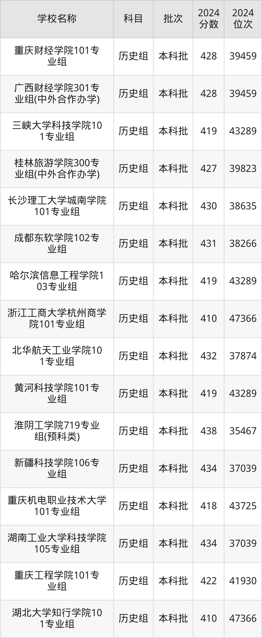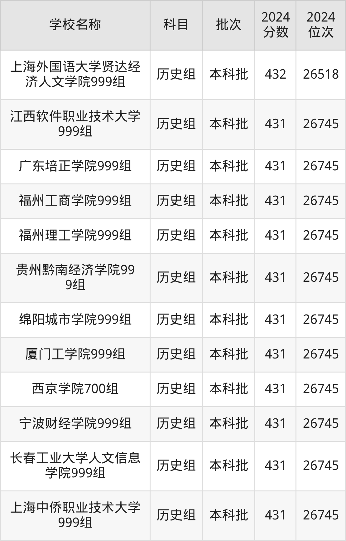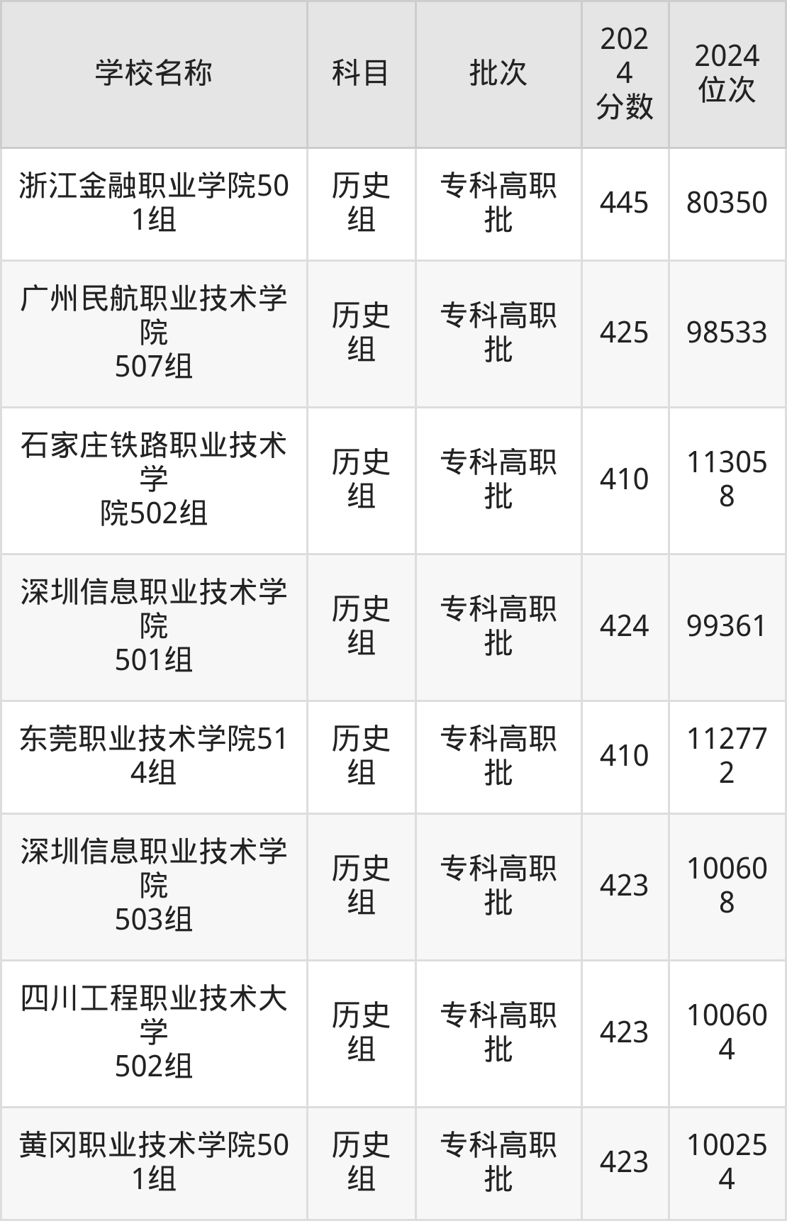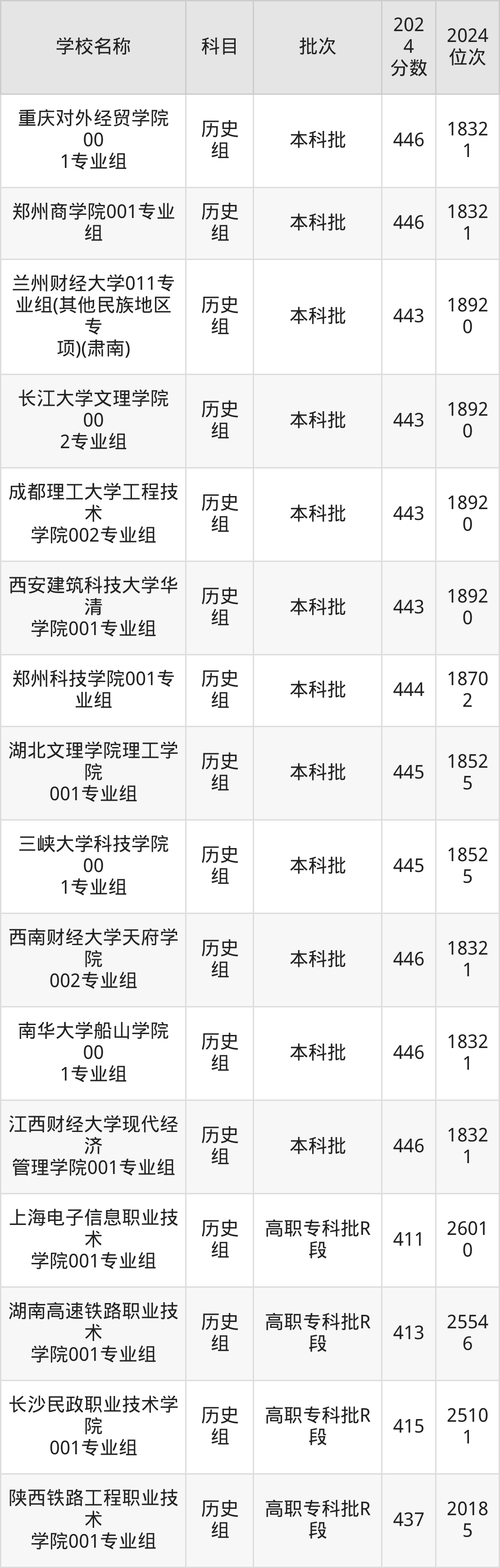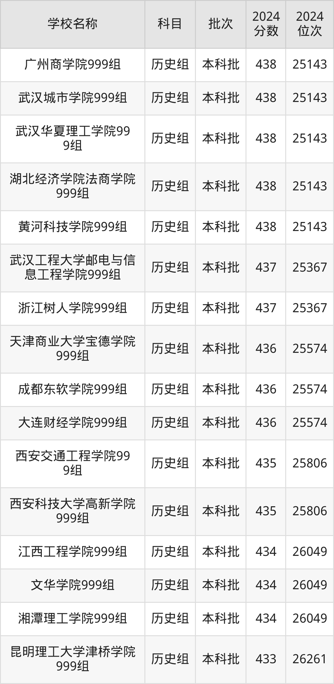 广东高考历史组共有51所理科大学在410到450分之间录取,包含广州软件学院、广州华商学院、上海中侨职业技术大学、广州商学院、广东外语外贸大学南国商学院、浙江金融职业学院、湖南高速铁路职业技术学院、西安科技大学高新学院、广东培正学院、东莞城市学院。