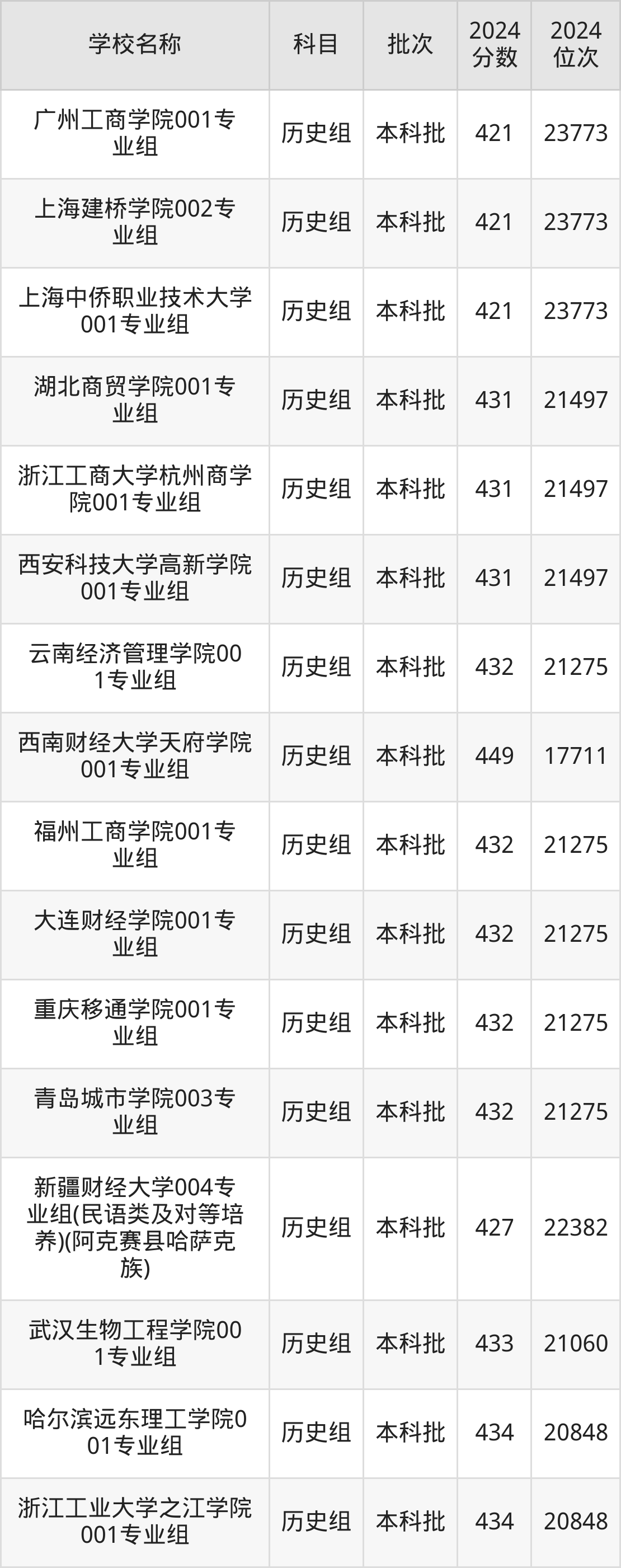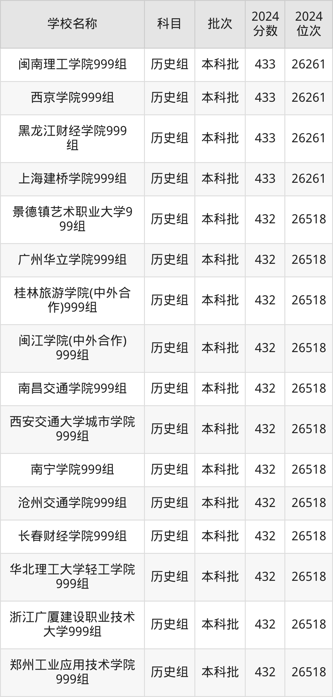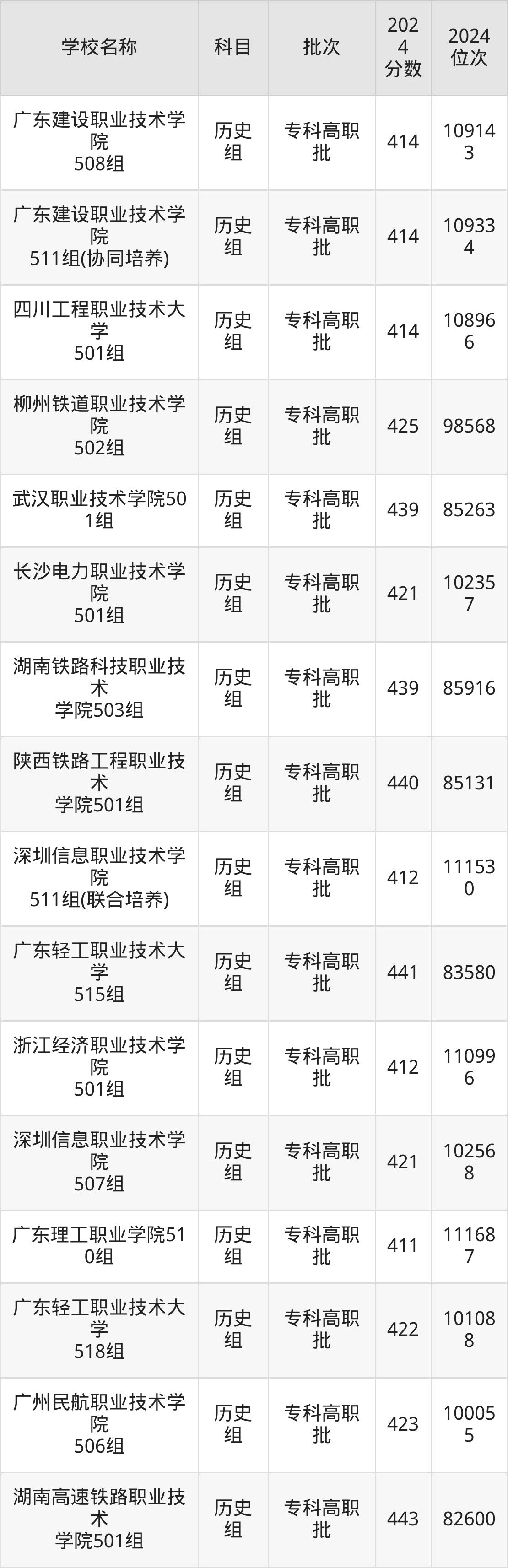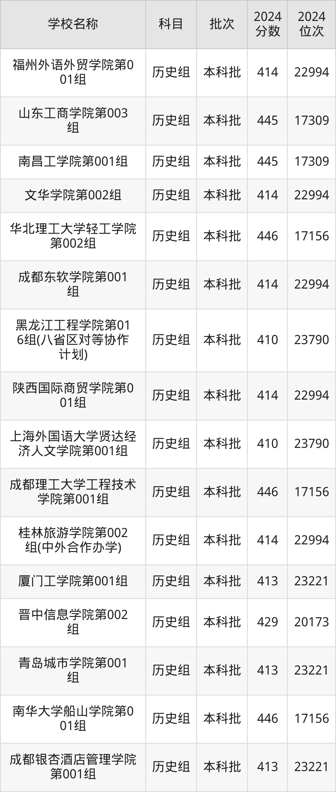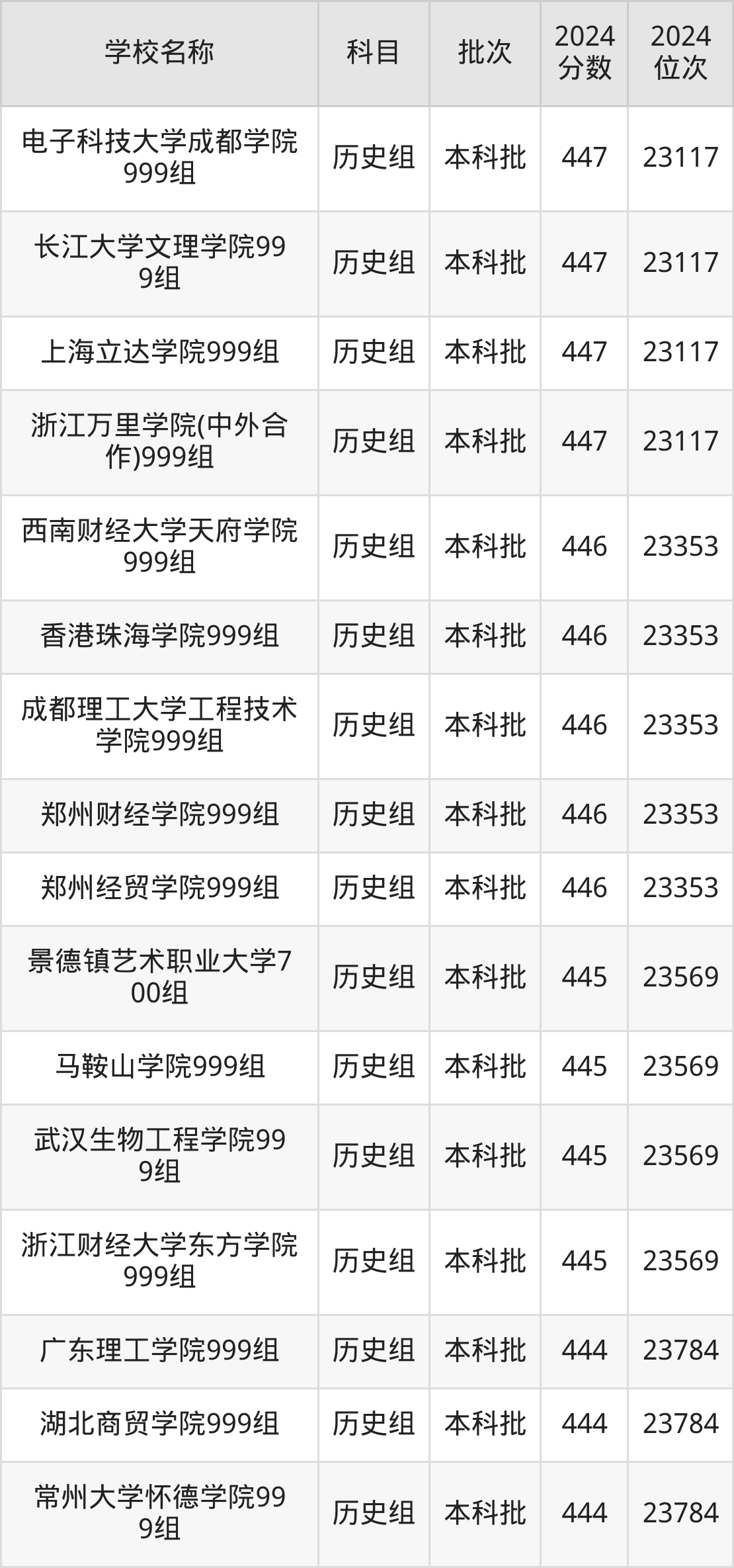 广东高考历史组共有51所理科大学在410到450分之间录取,包含广州软件学院、广州华商学院、上海中侨职业技术大学、广州商学院、广东外语外贸大学南国商学院、浙江金融职业学院、湖南高速铁路职业技术学院、西安科技大学高新学院、广东培正学院、东莞城市学院。