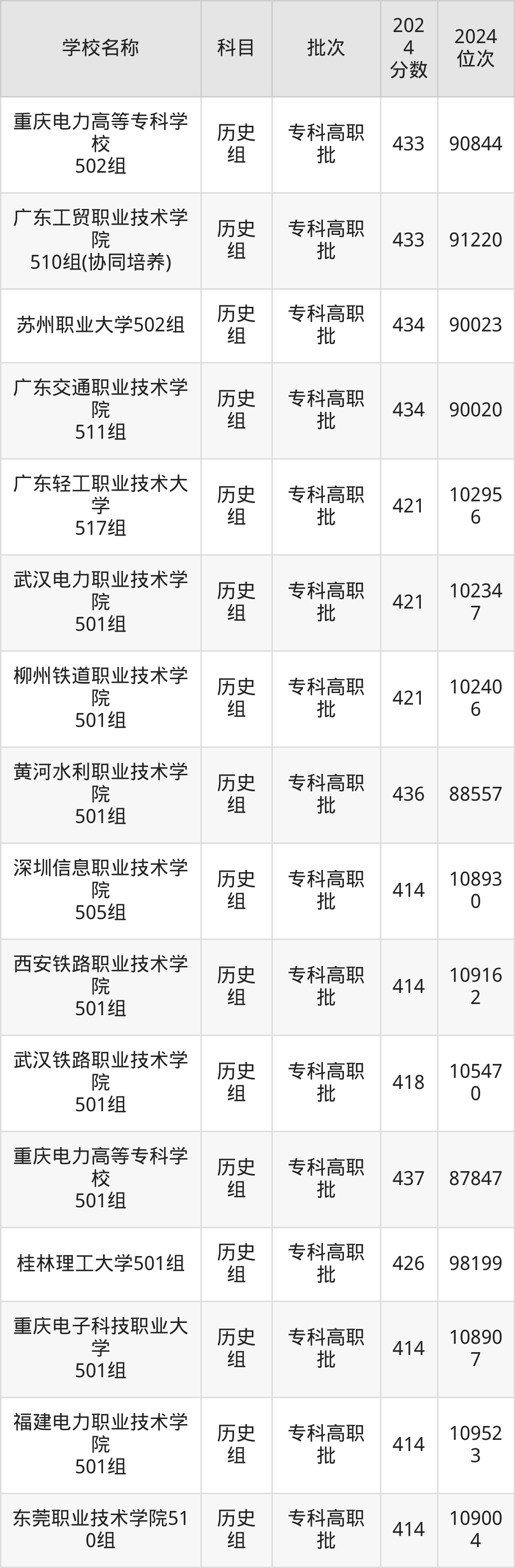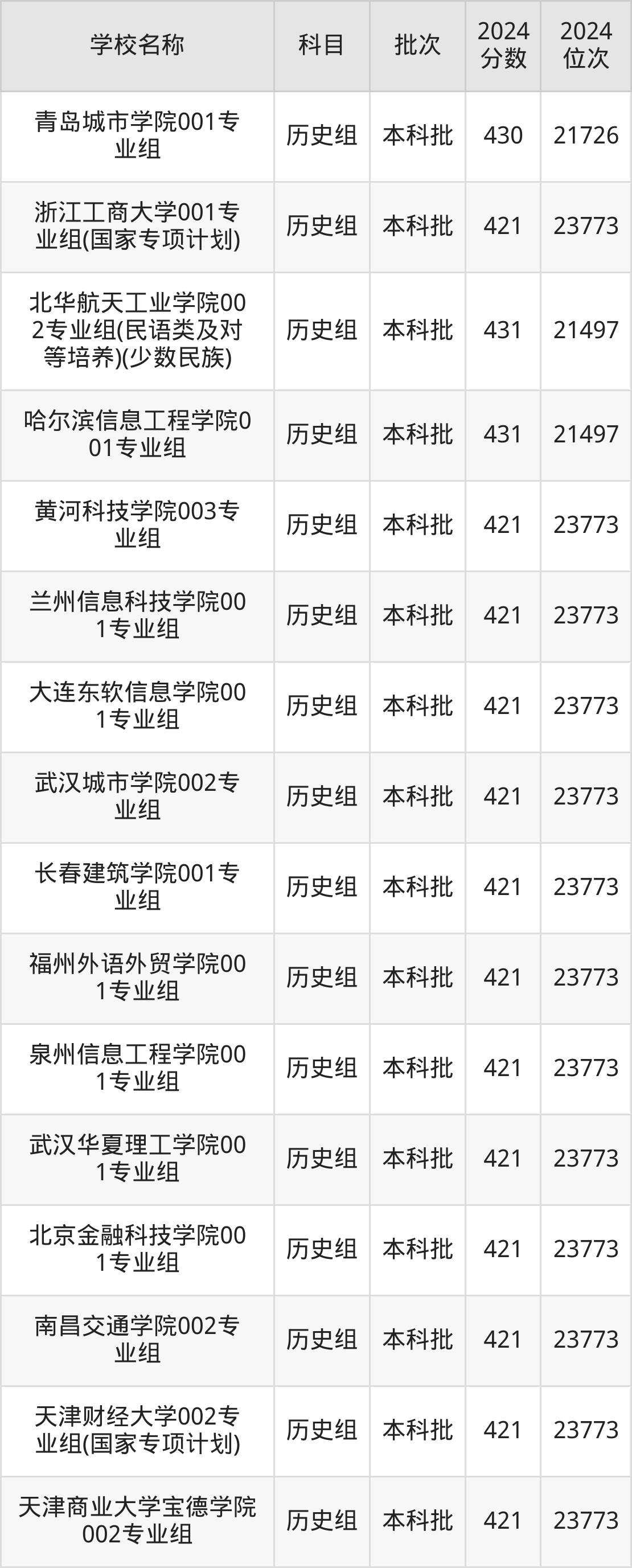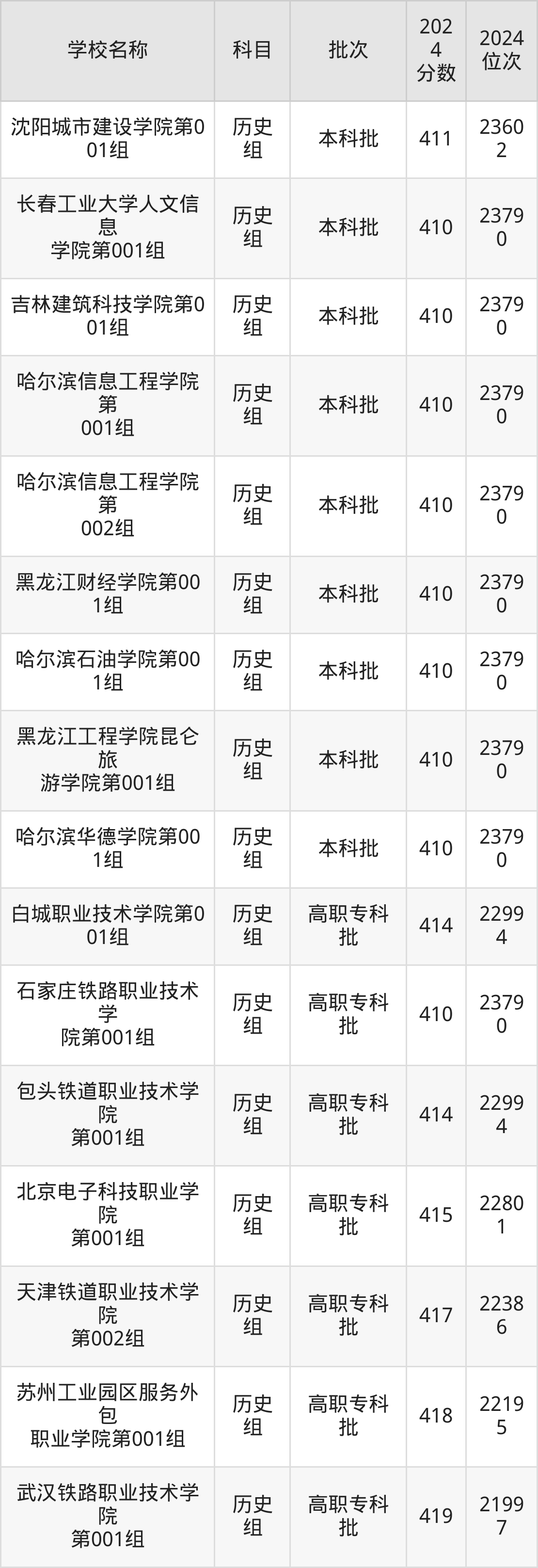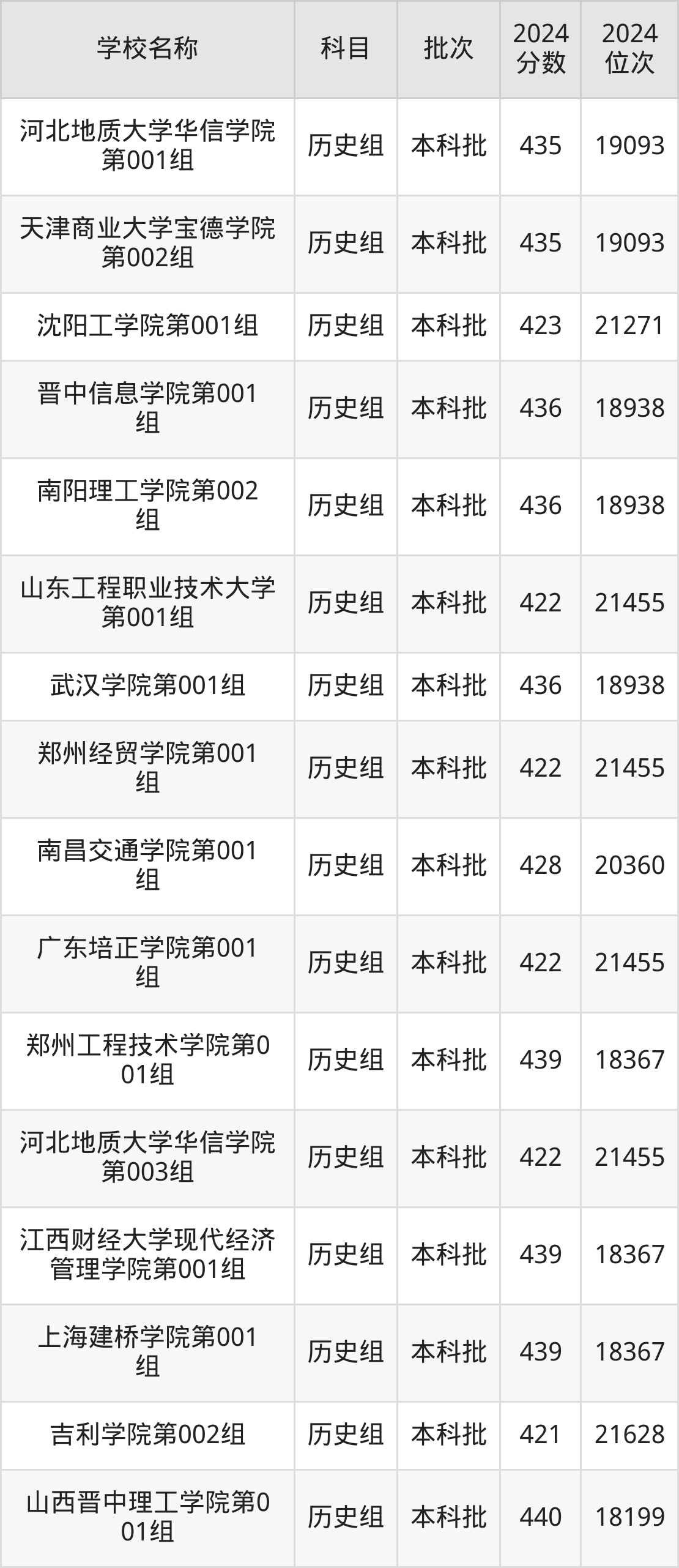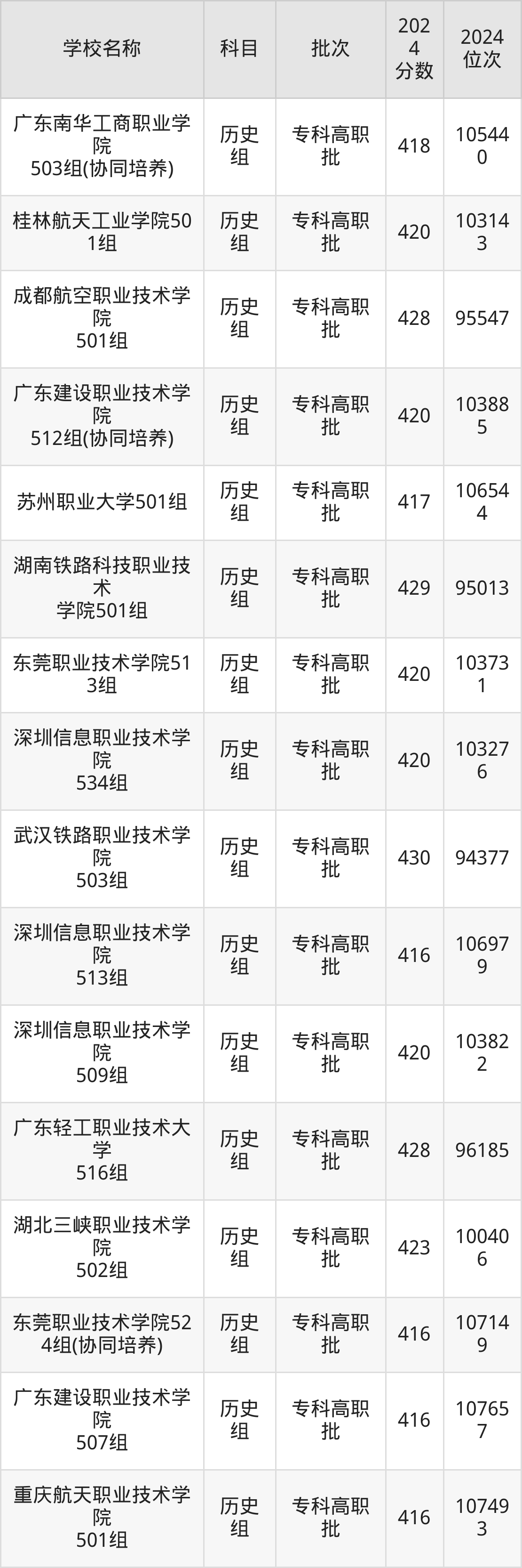 广东高考历史组共有51所理科大学在410到450分之间录取,包含广州软件学院、广州华商学院、上海中侨职业技术大学、广州商学院、广东外语外贸大学南国商学院、浙江金融职业学院、湖南高速铁路职业技术学院、西安科技大学高新学院、广东培正学院、东莞城市学院。