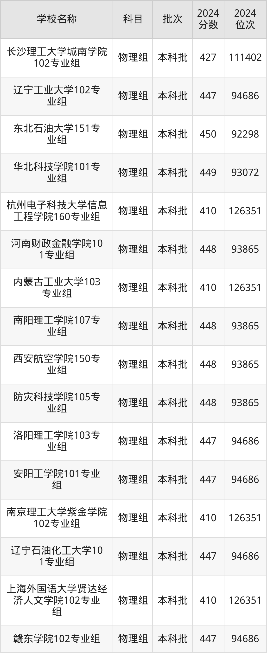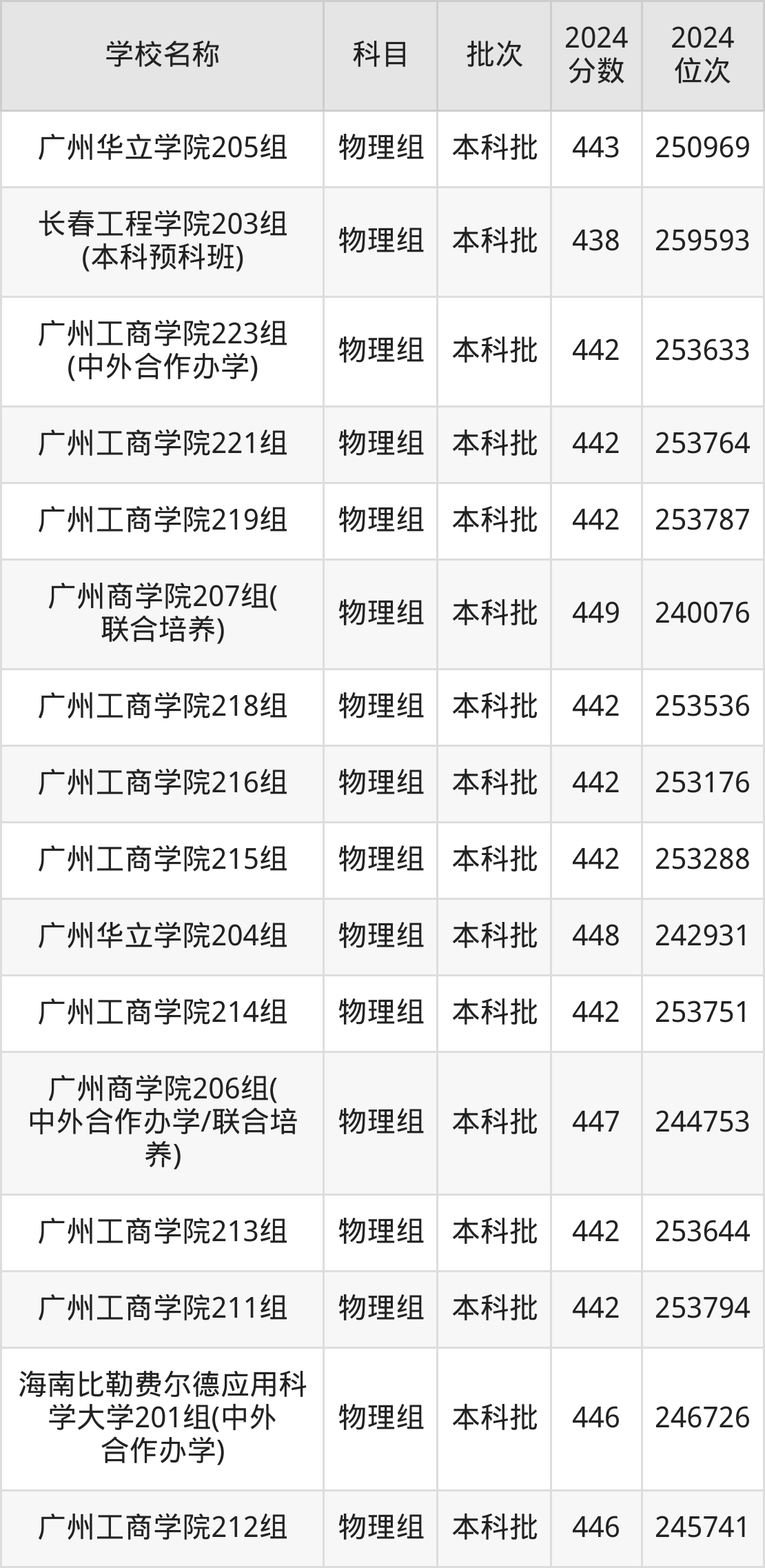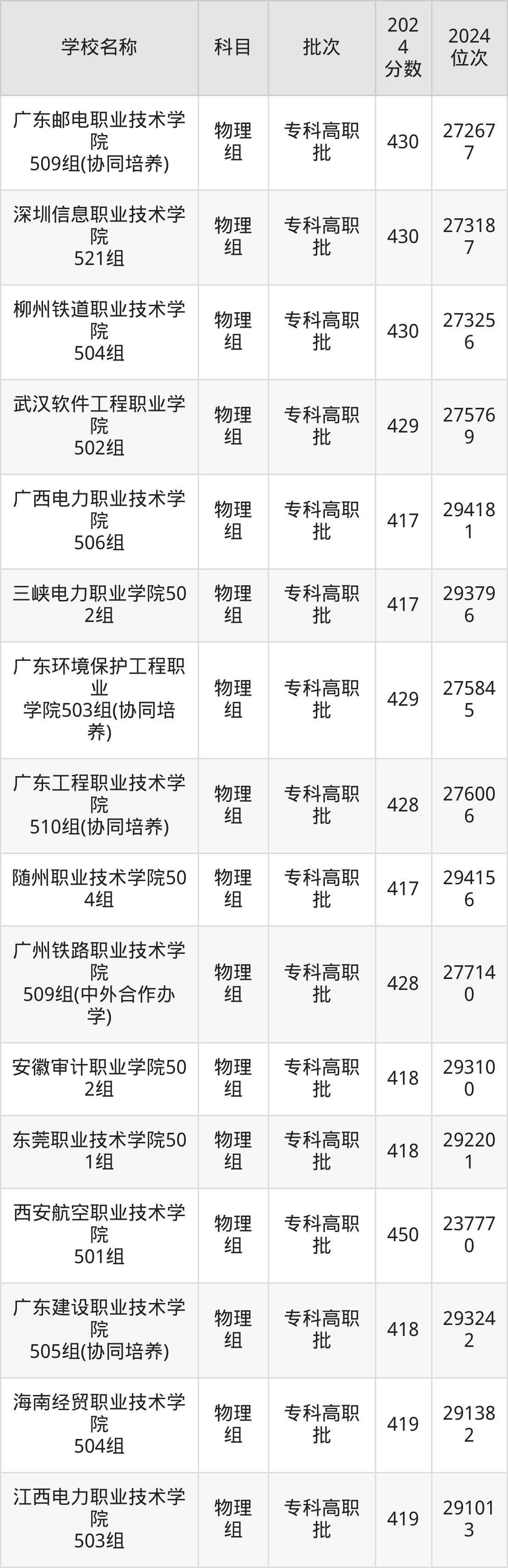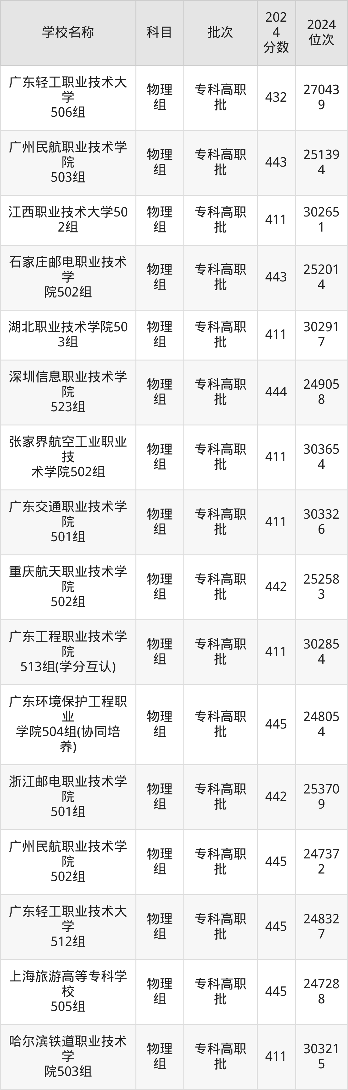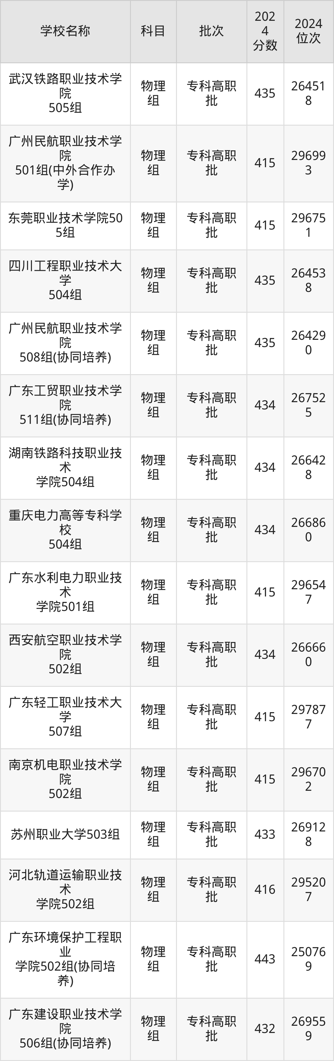 广东高考物理组共有79所理科大学在410到450分之间录取,包含西安航空职业技术学院、浙江金融职业学院、广东轻工职业技术大学、广州商学院、广州铁路职业技术学院、重庆电子科技职业大学、黄河水利职业技术学院、广州华立学院、海南比勒费尔德应用科学大学、广州工商学院。