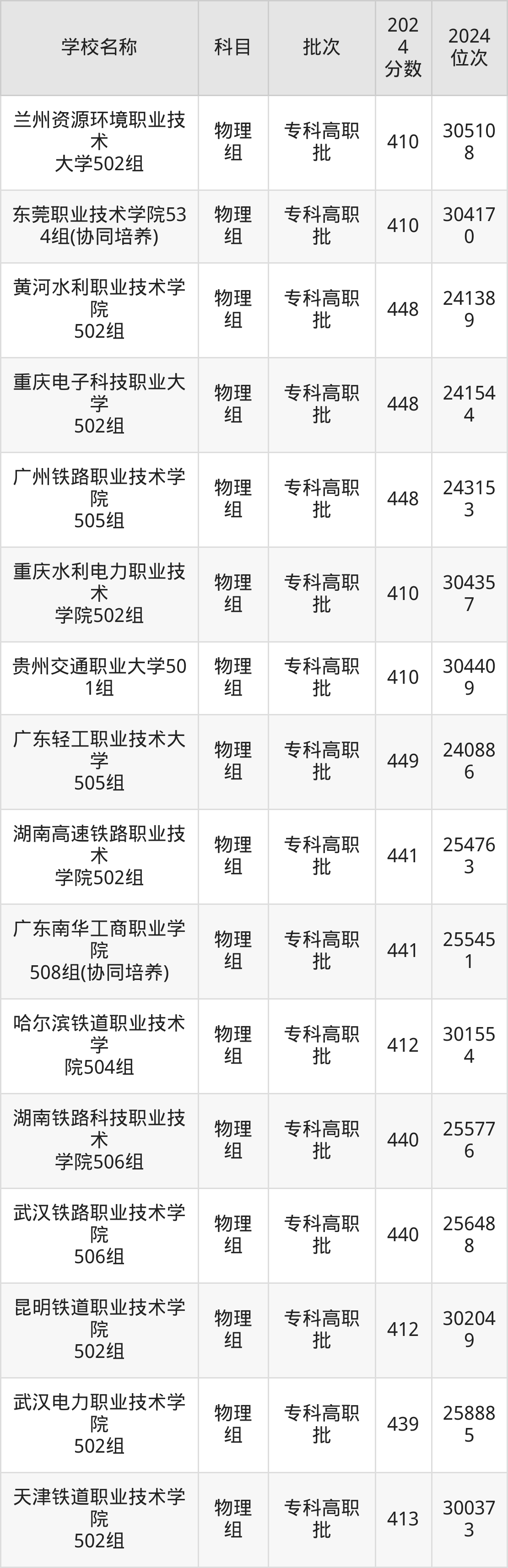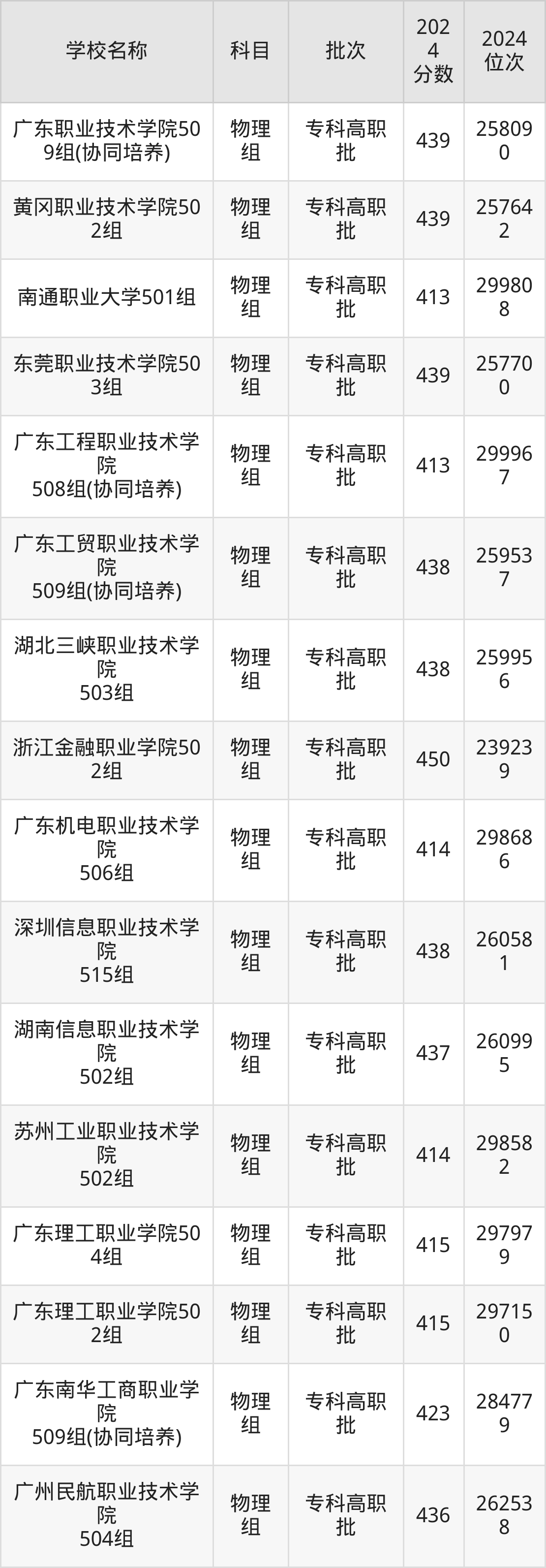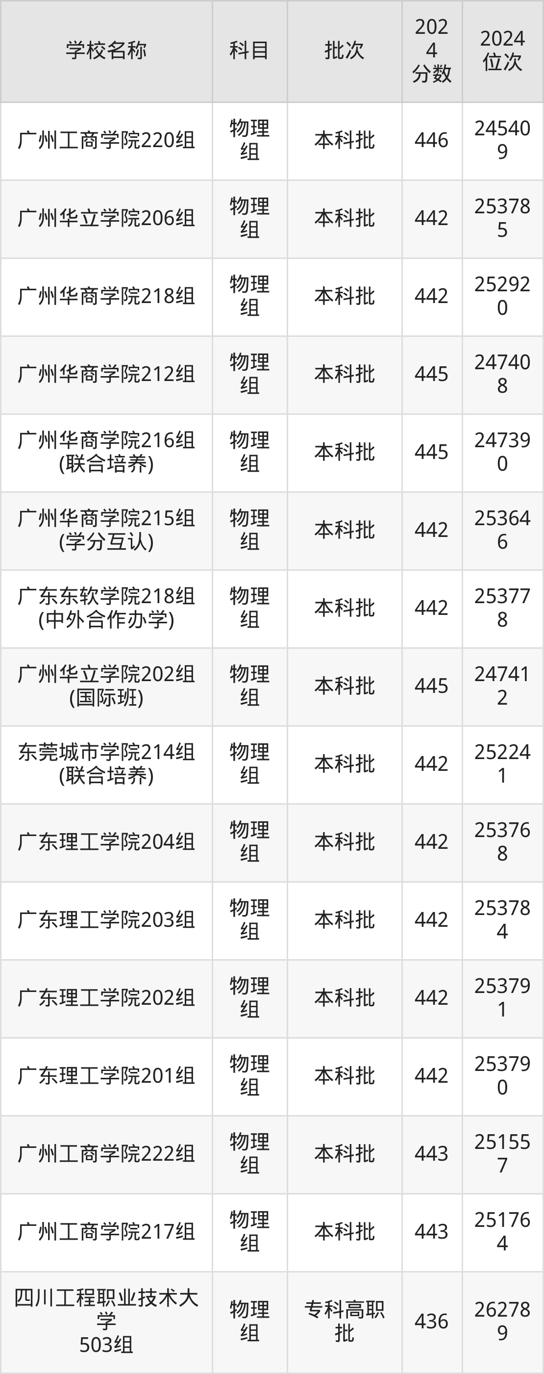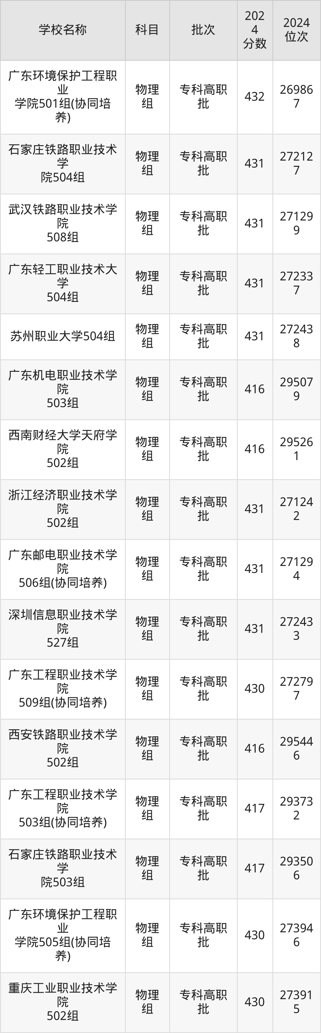 广东高考物理组共有79所理科大学在410到450分之间录取,包含西安航空职业技术学院、浙江金融职业学院、广东轻工职业技术大学、广州商学院、广州铁路职业技术学院、重庆电子科技职业大学、黄河水利职业技术学院、广州华立学院、海南比勒费尔德应用科学大学、广州工商学院。