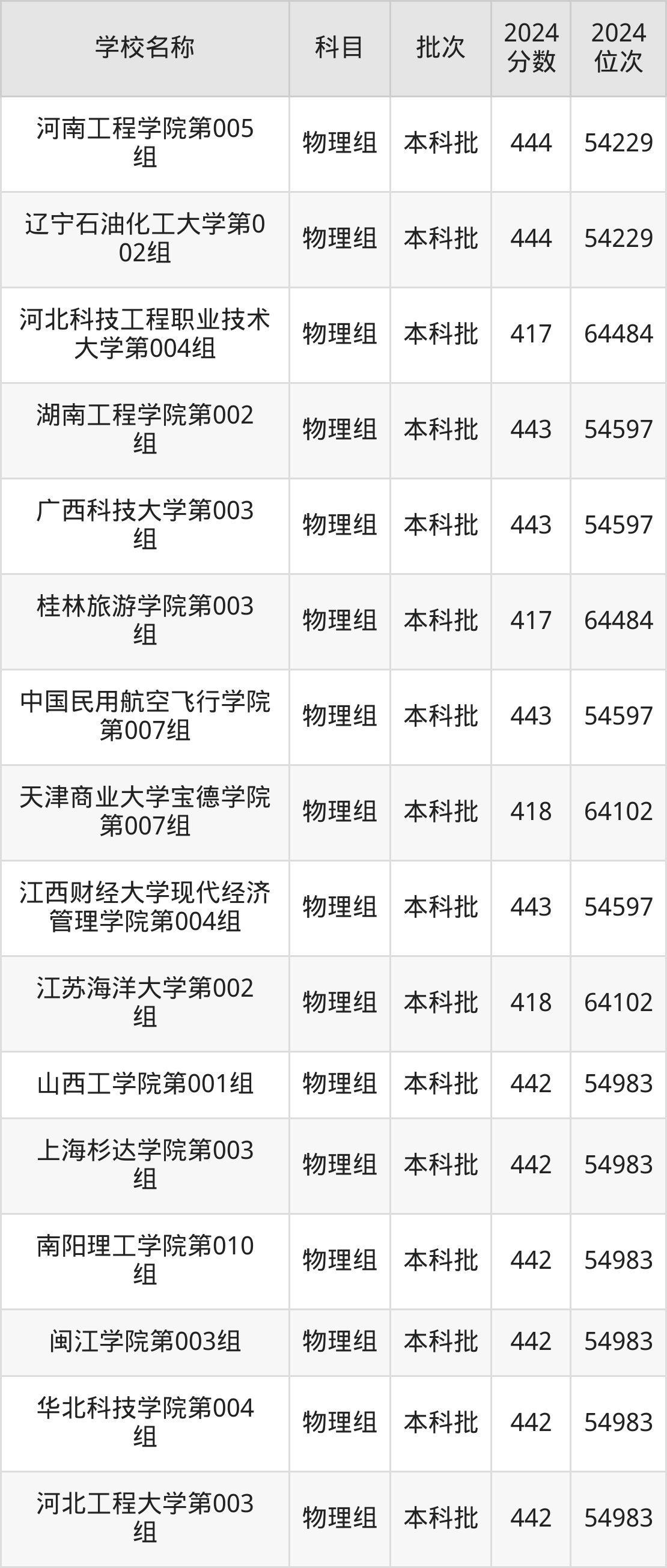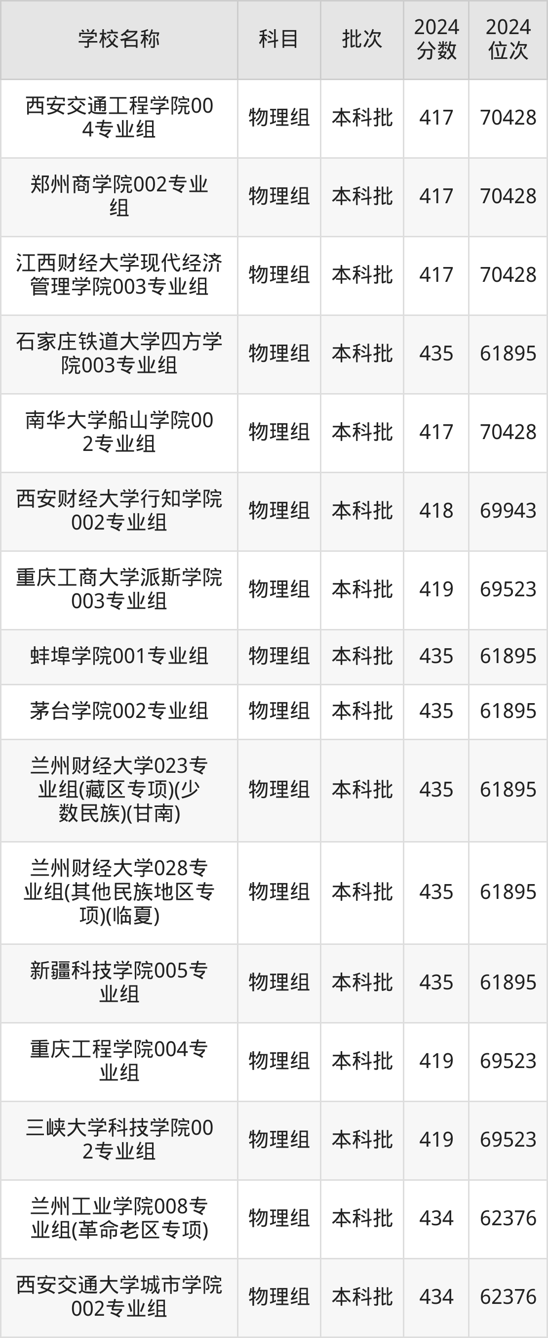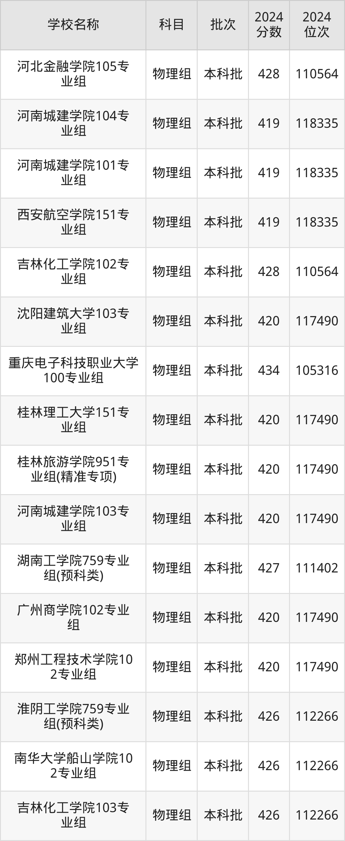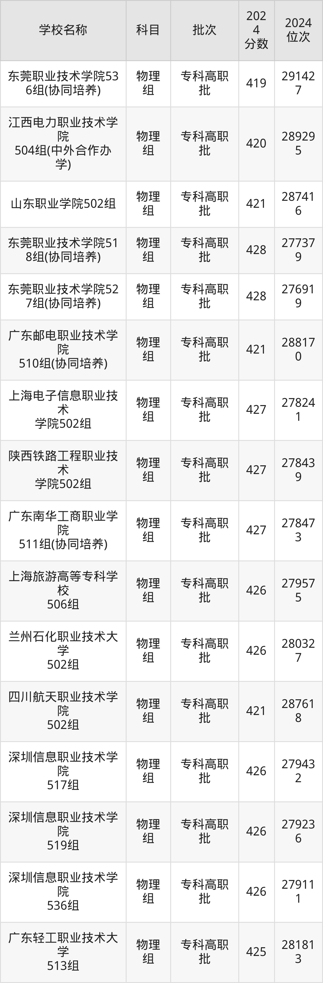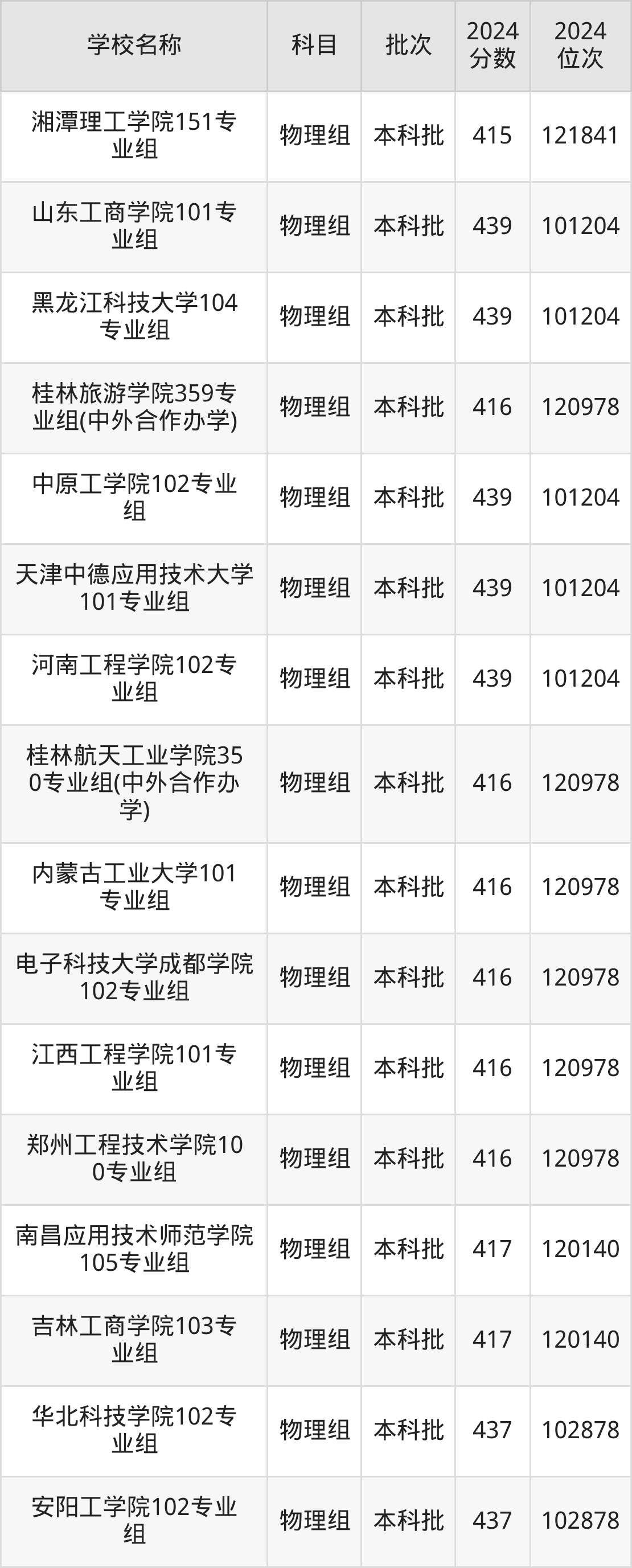 广东高考物理组共有79所理科大学在410到450分之间录取,包含西安航空职业技术学院、浙江金融职业学院、广东轻工职业技术大学、广州商学院、广州铁路职业技术学院、重庆电子科技职业大学、黄河水利职业技术学院、广州华立学院、海南比勒费尔德应用科学大学、广州工商学院。