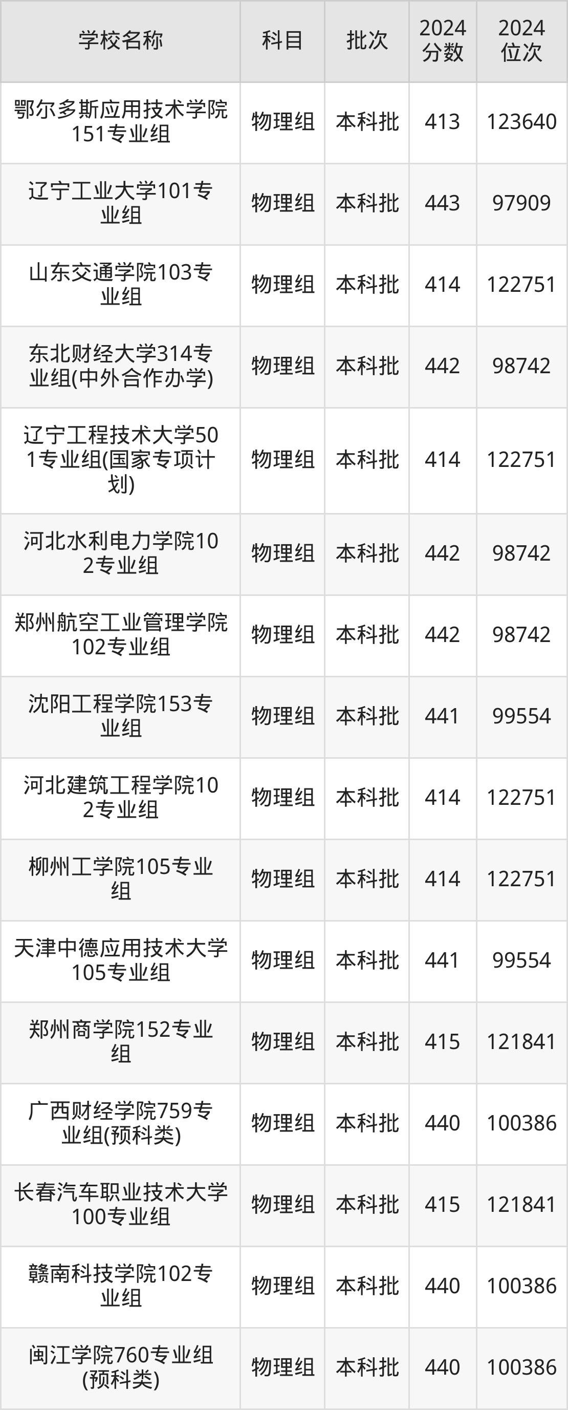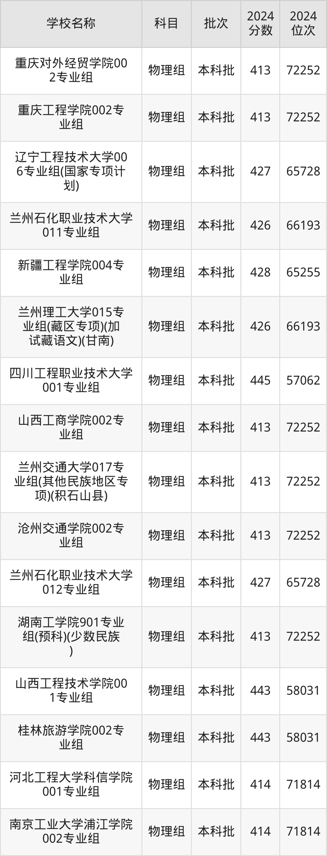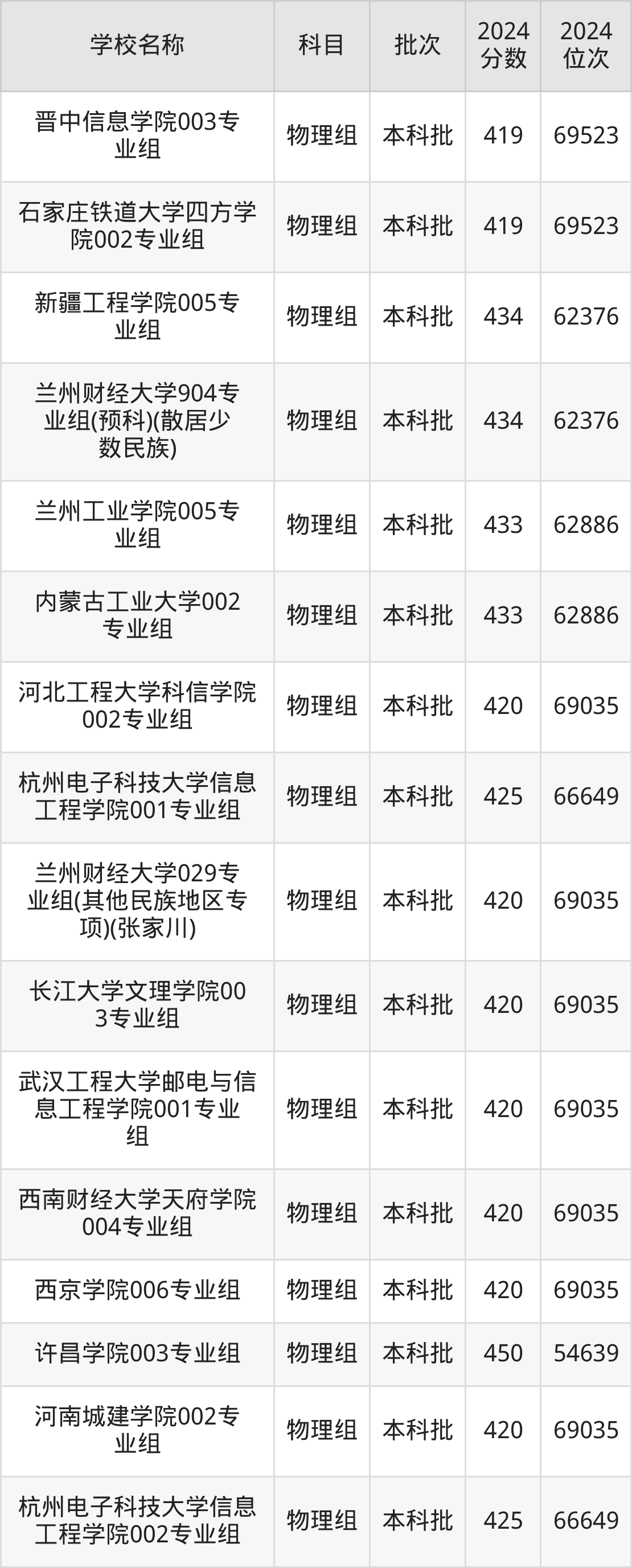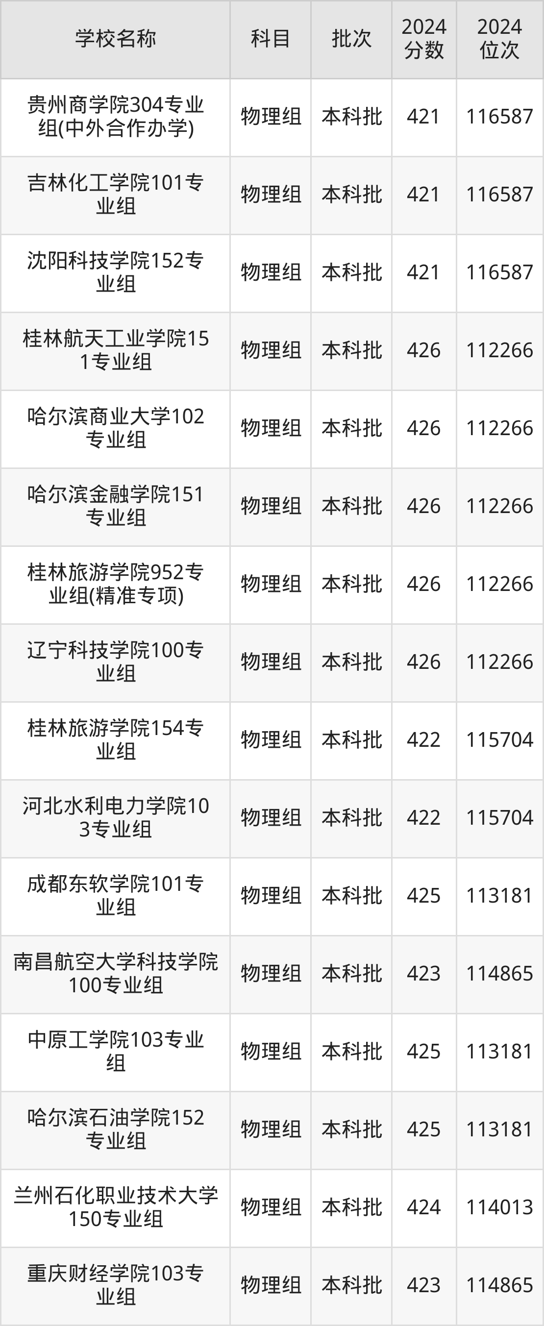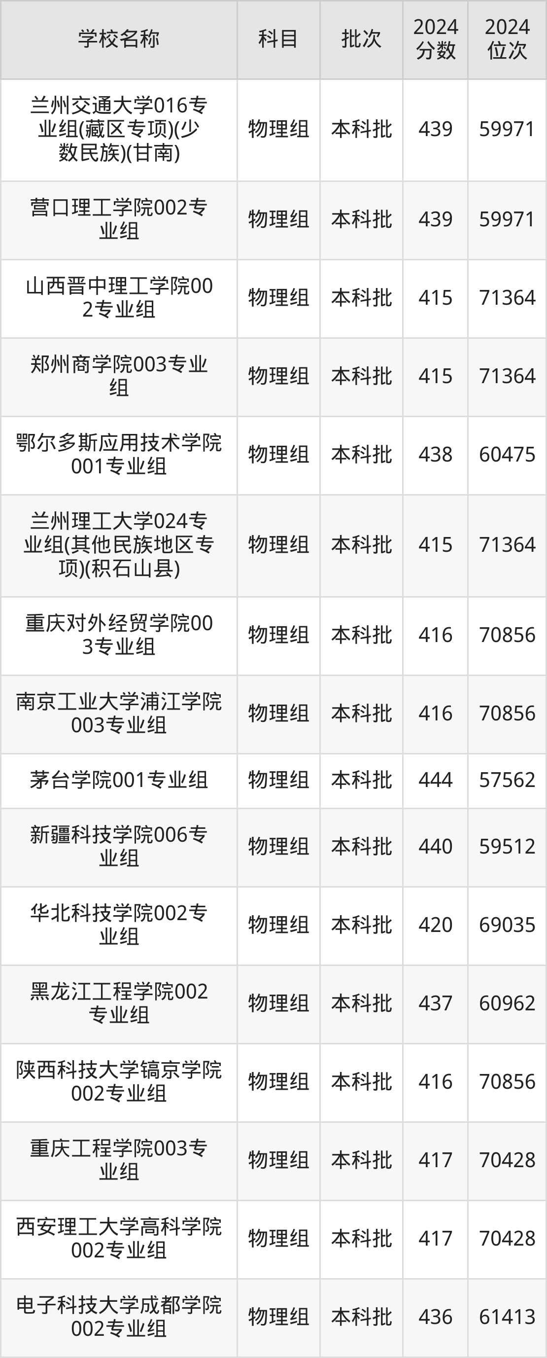 广东高考物理组共有79所理科大学在410到450分之间录取,包含西安航空职业技术学院、浙江金融职业学院、广东轻工职业技术大学、广州商学院、广州铁路职业技术学院、重庆电子科技职业大学、黄河水利职业技术学院、广州华立学院、海南比勒费尔德应用科学大学、广州工商学院。