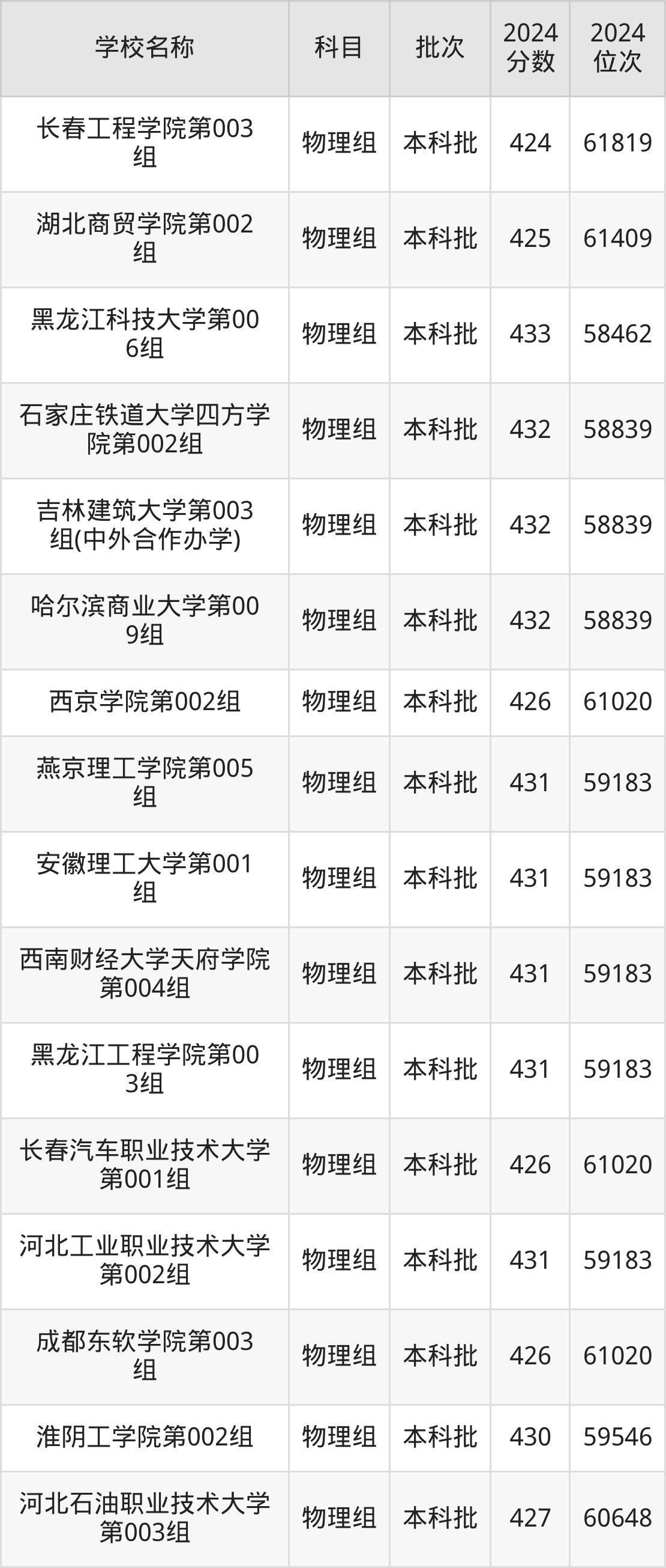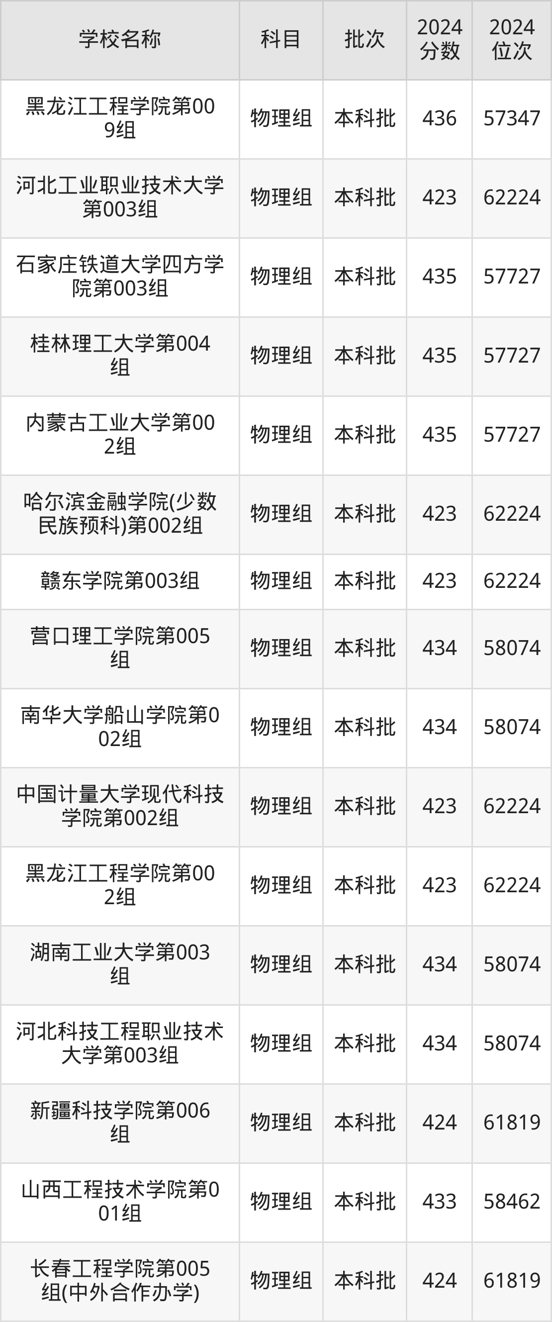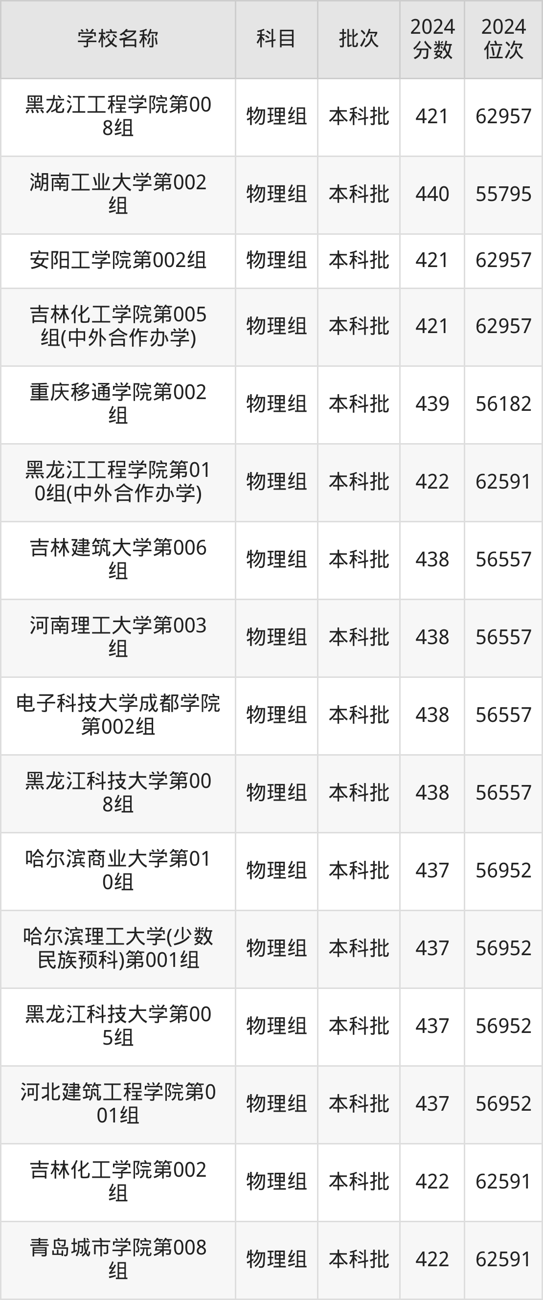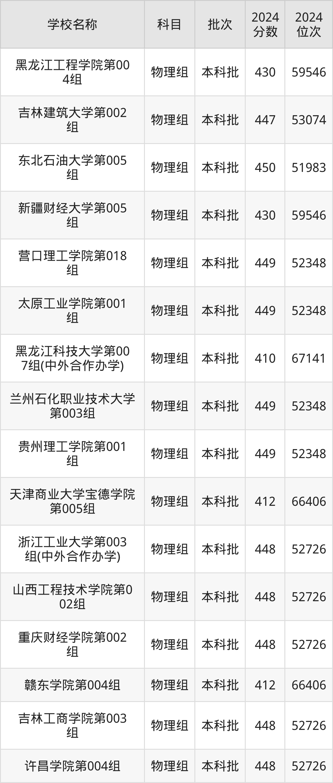 黑龙江高考物理组共有85所理科大学在410到450分之间录取,包含哈尔滨理工大学(荣成校区)、东北石油大学、营口理工学院、太原工业学院、兰州石化职业技术大学、贵州理工学院、浙江工业大学、山西工程技术学院、重庆财经学院、吉林工商学院。