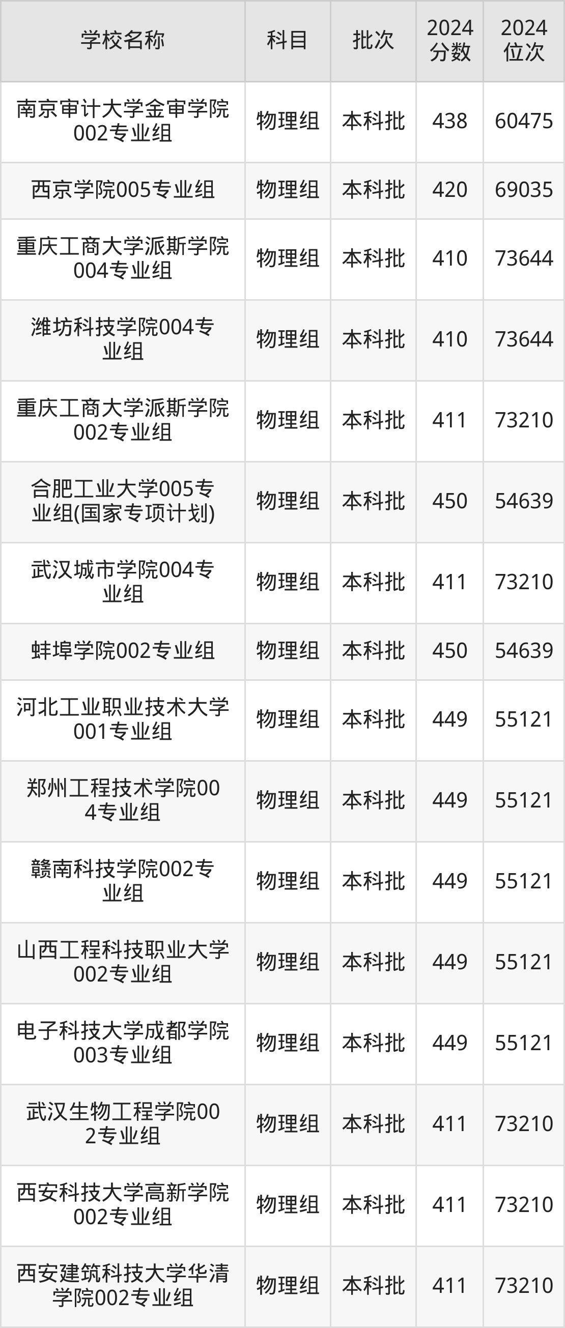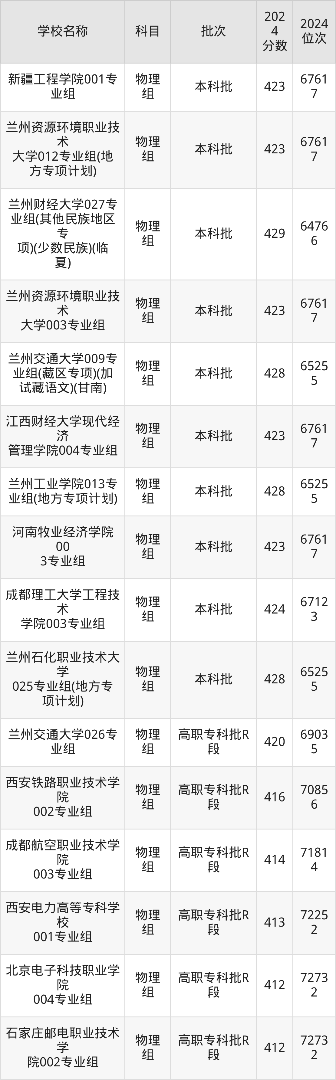 甘肃高考物理组共有87所理科大学在410到450分之间录取,包含许昌学院、合肥工业大学、蚌埠学院、河北工业职业技术大学、郑州工程技术学院、赣南科技学院、山西工程科技职业大学、电子科技大学成都学院、河北水利电力学院、中原工学院。