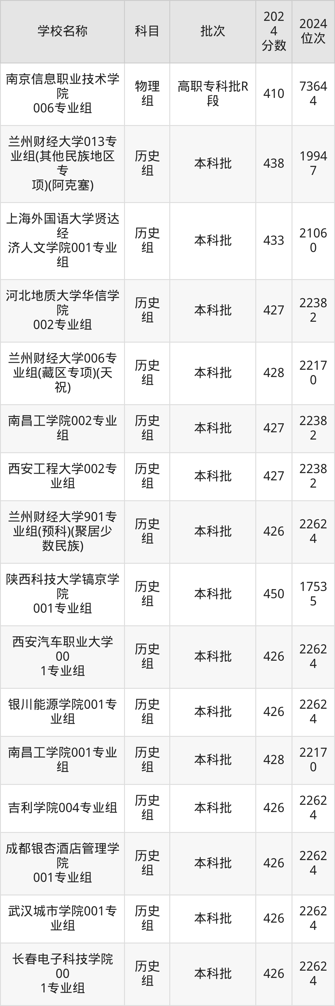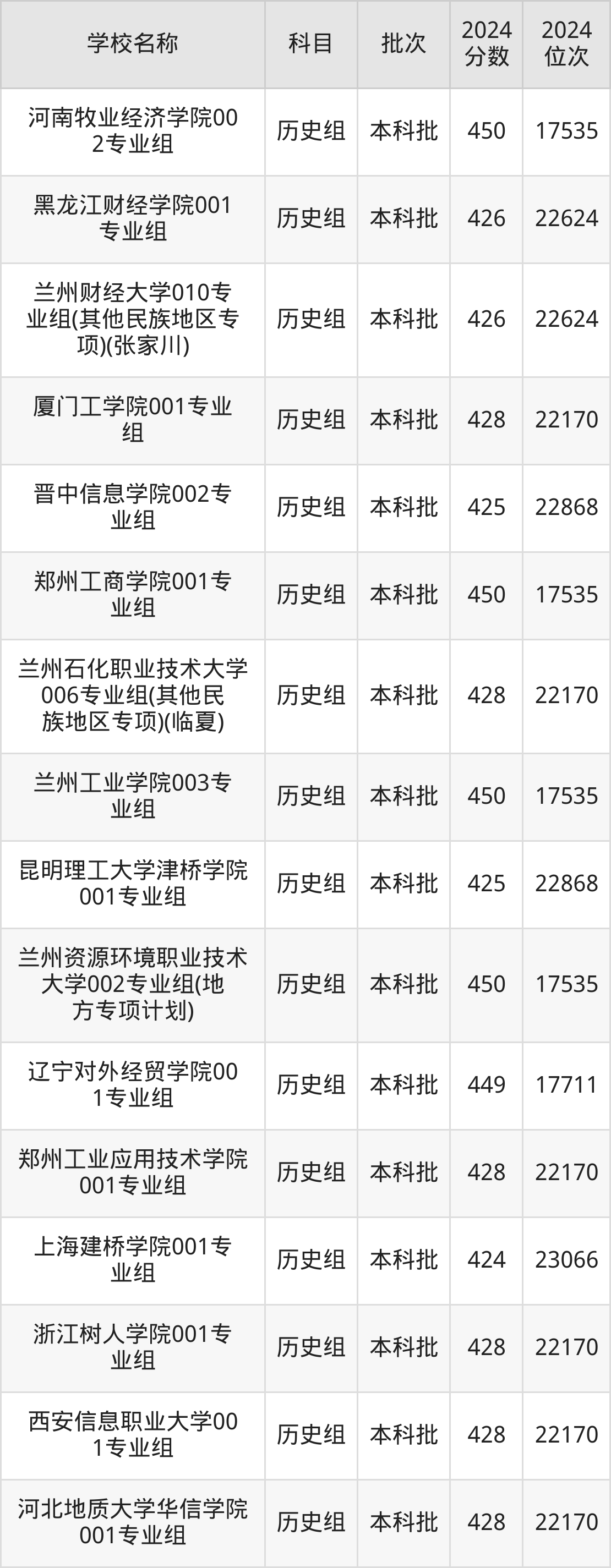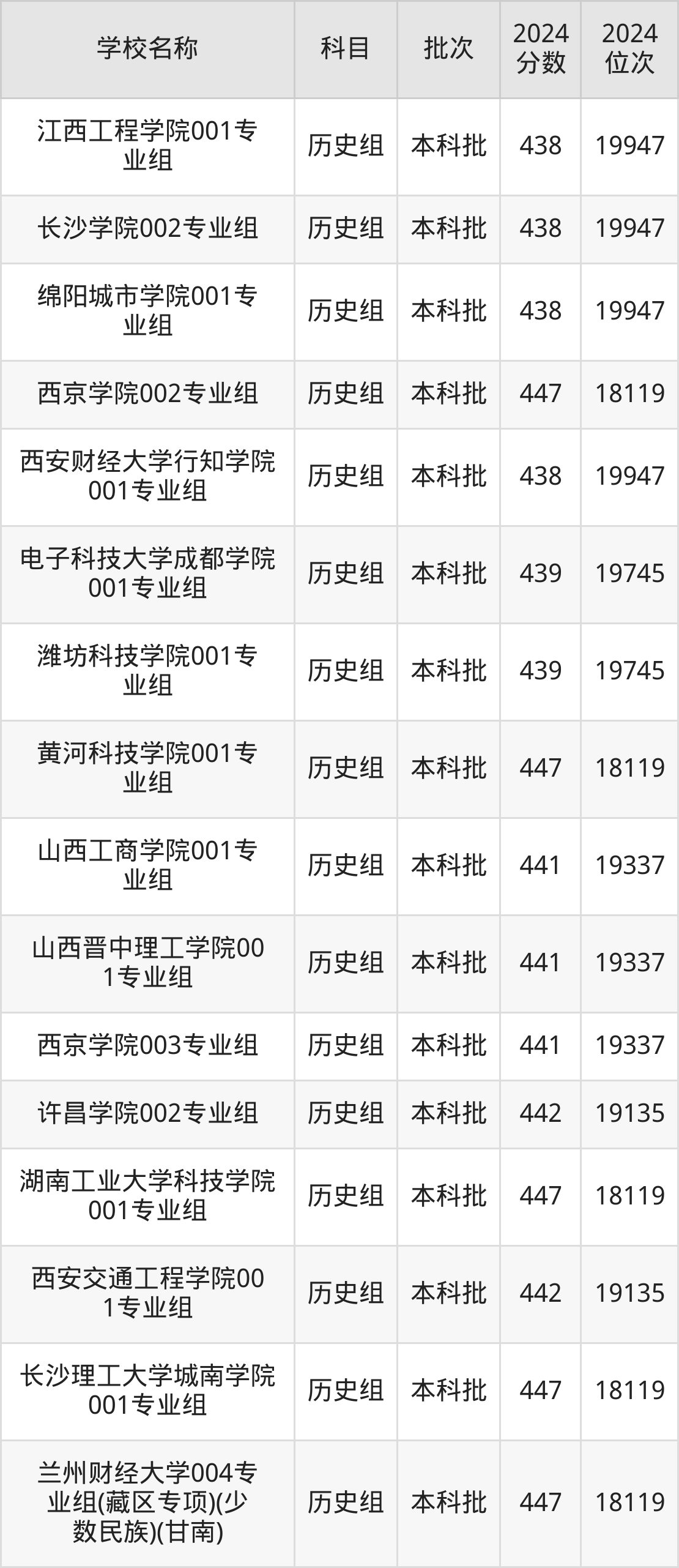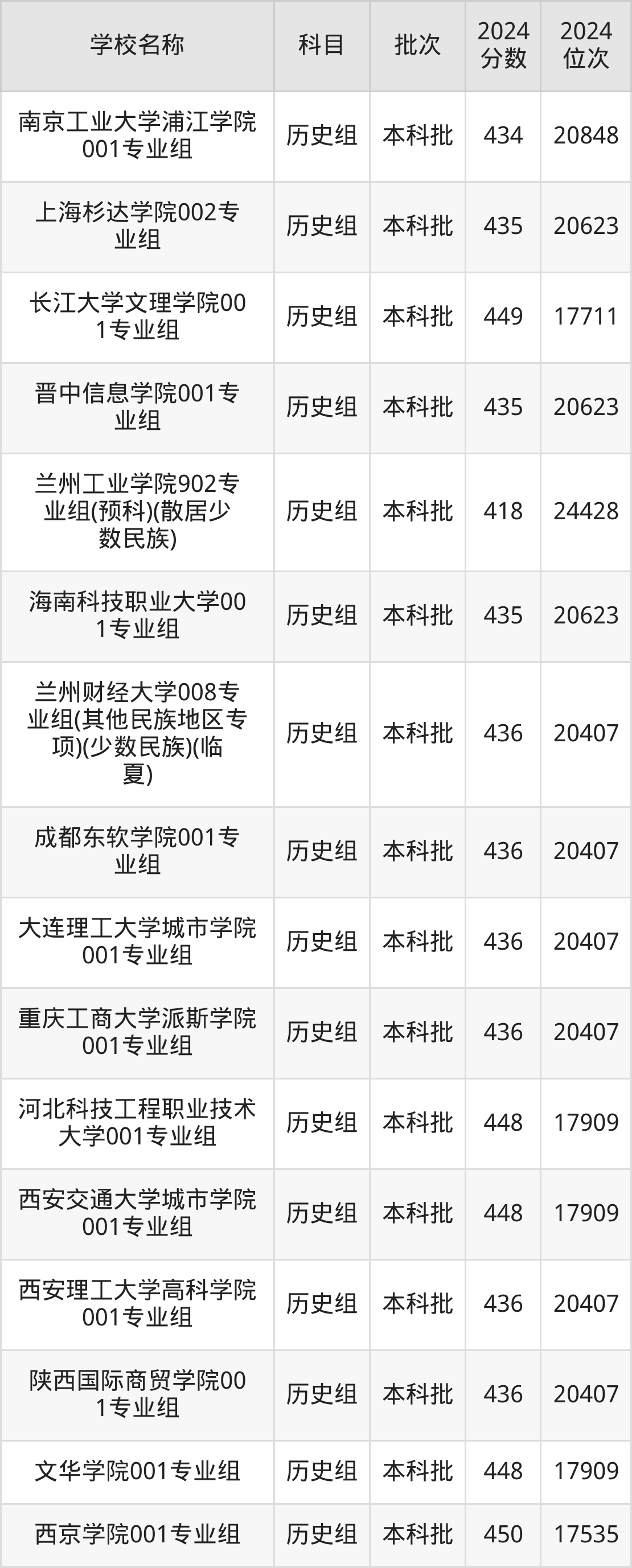 甘肃高考历史组共有123所理科大学在410到450分之间录取,包含西京学院、陕西科技大学镐京学院、河南牧业经济学院、郑州工商学院、兰州工业学院、兰州资源环境职业技术大学、辽宁对外经贸学院、西南财经大学天府学院、长江大学文理学院、河北科技工程职业技术大学。