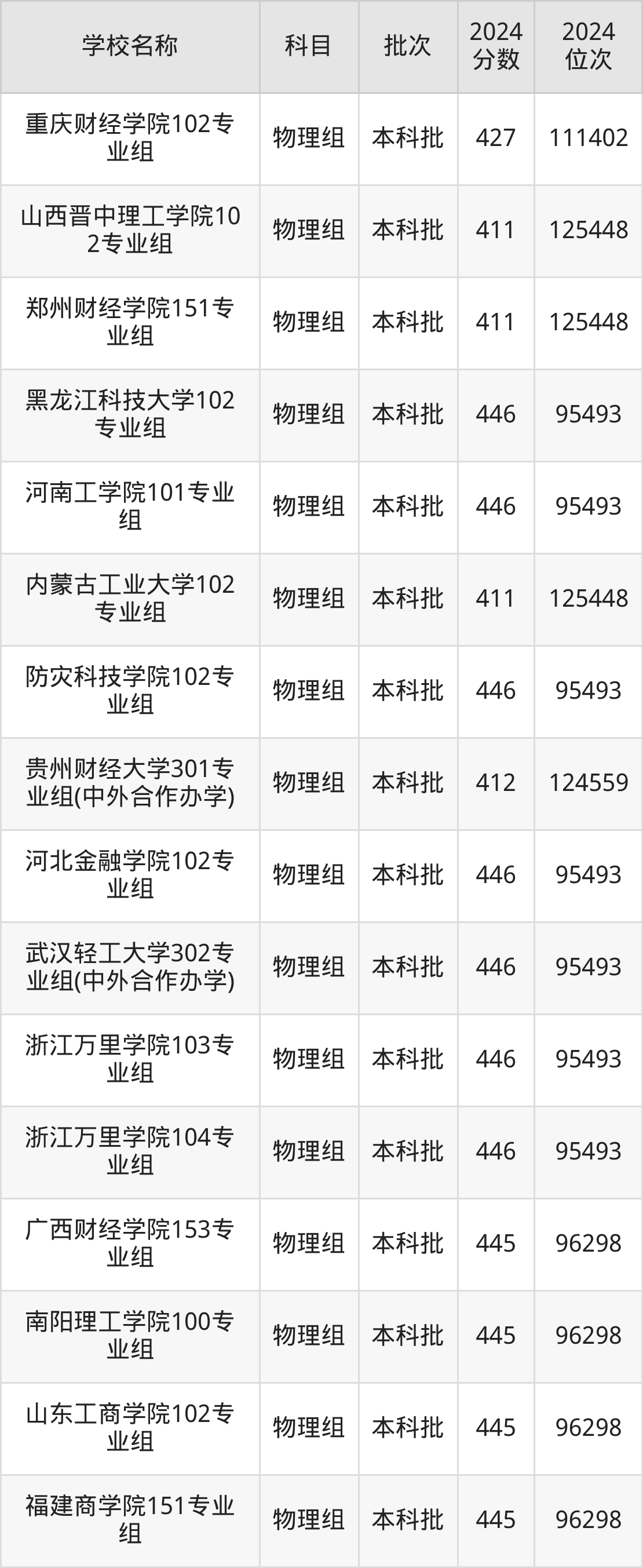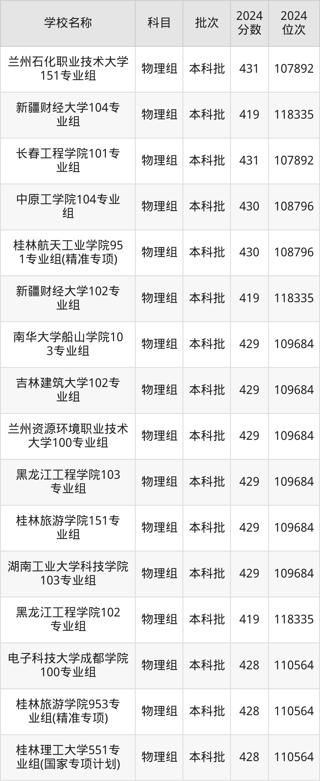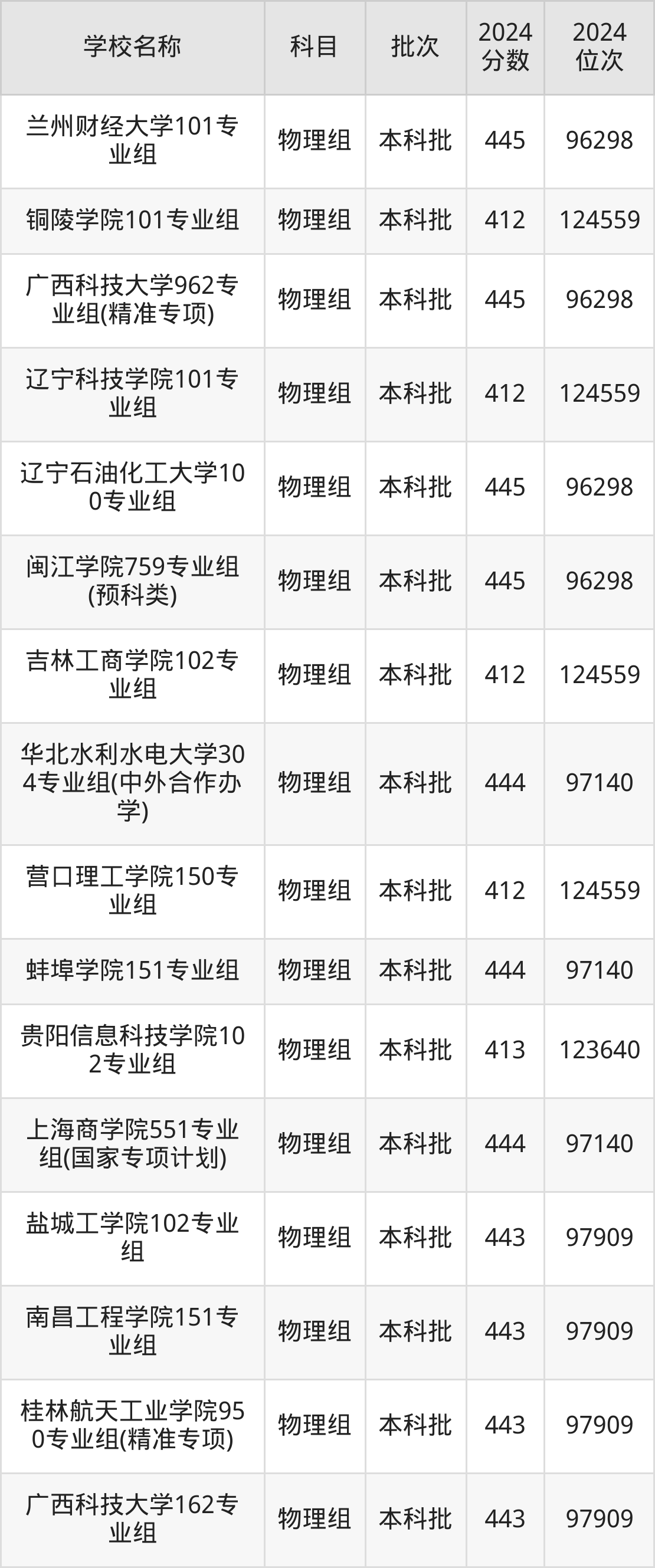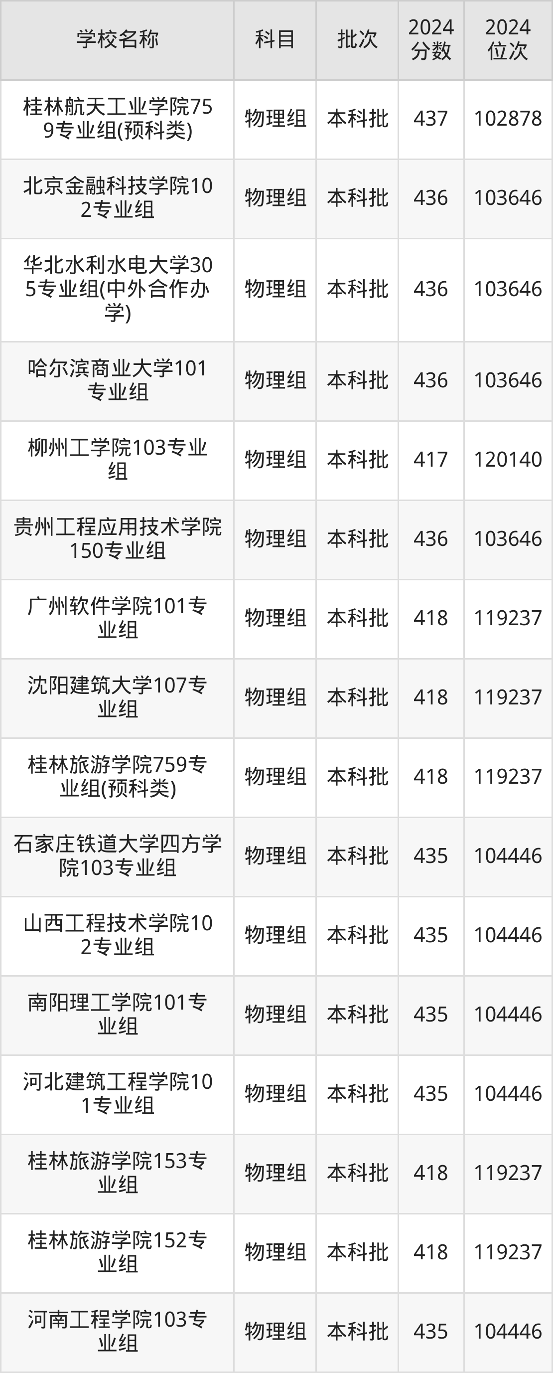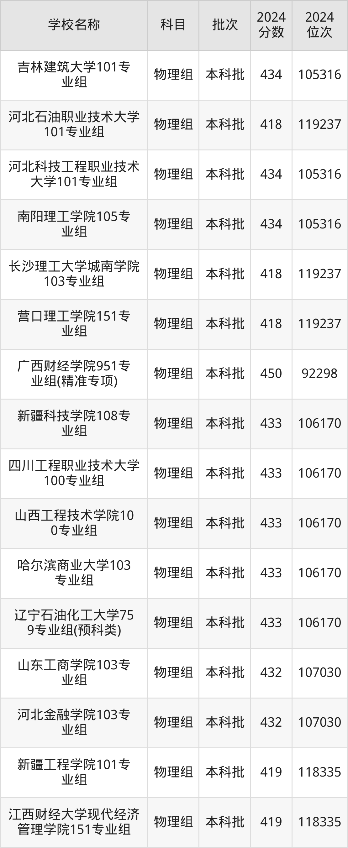 广西高考物理组共有103所理科大学在410到450分之间录取,包含广西财经学院、东北石油大学、华北科技学院、河南财政金融学院、南阳理工学院、西安航空学院、防灾科技学院、洛阳理工学院、安阳工学院、辽宁石油化工大学。