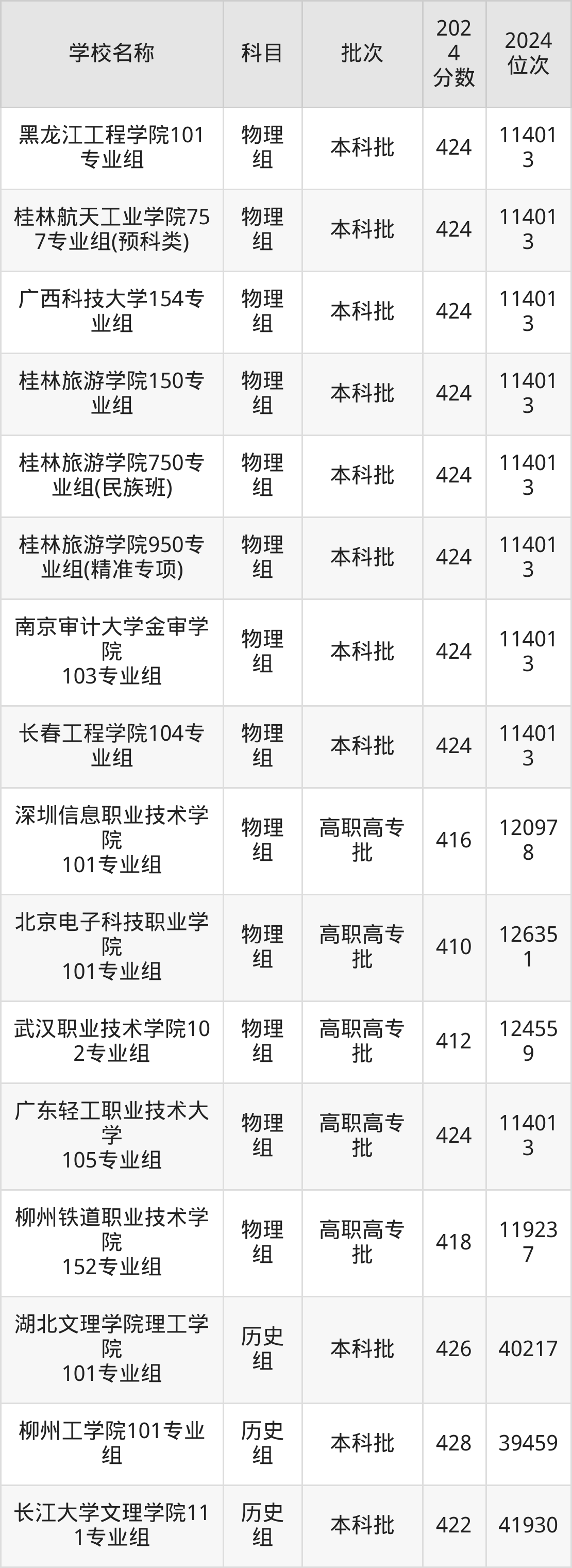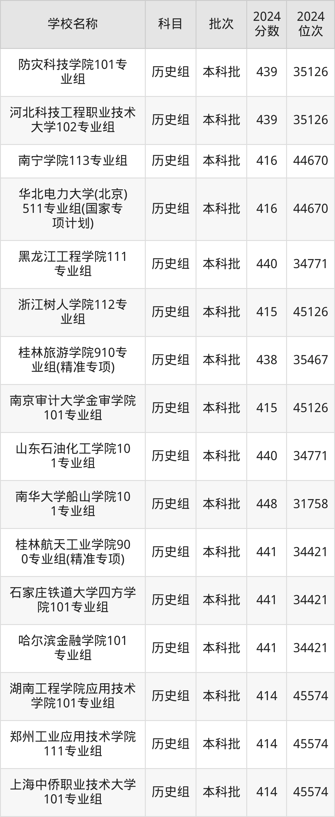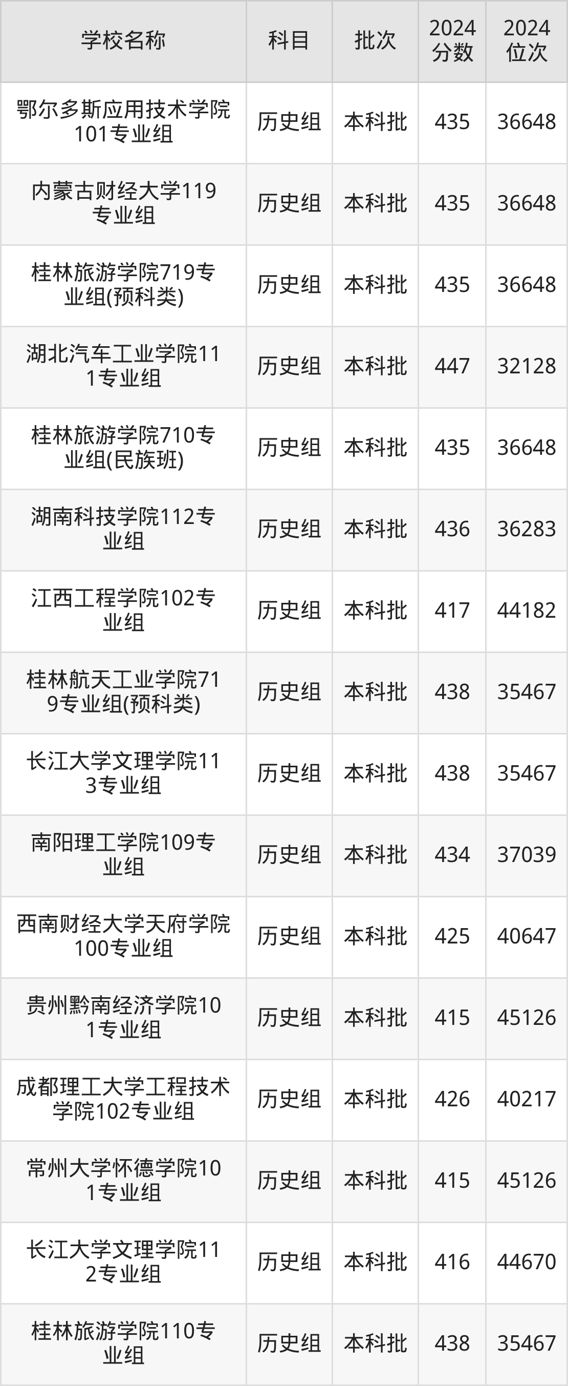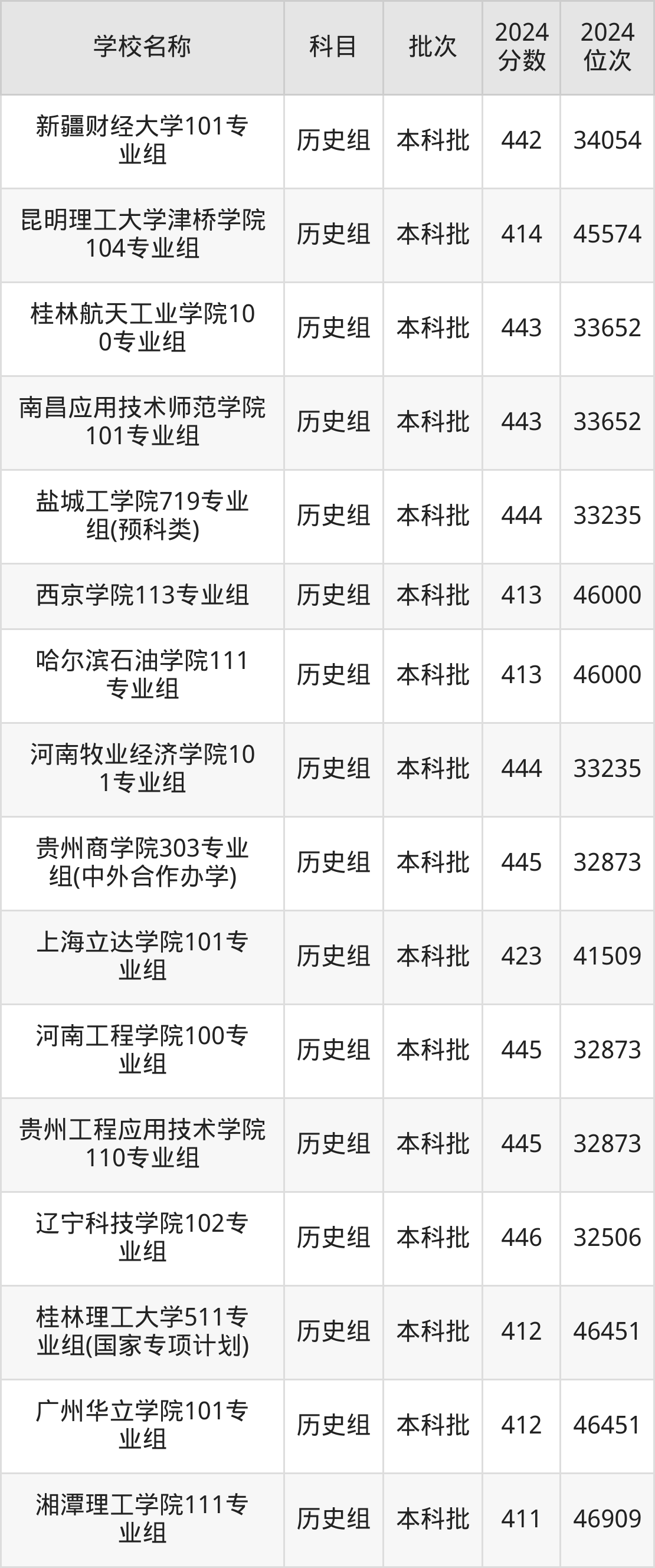 广西高考历史组共有81所理科大学在410到450分之间录取,包含桂林旅游学院、兰州石化职业技术大学、南华大学船山学院、湖北汽车工业学院、新疆科技学院、河南城建学院、桂林航天工业学院、安阳工学院、辽宁科技学院、贵州工程应用技术学院。