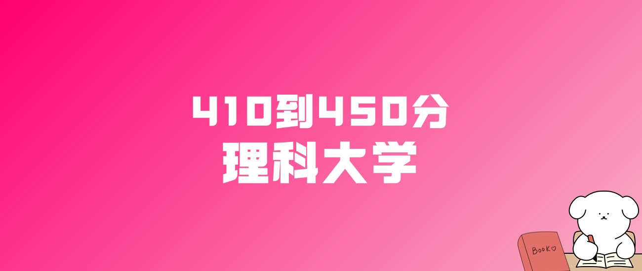 410到450分的理科大学有天津商业大学宝德学院、燕京理工学院、河北科技工程职业技术大学、仰恩大学、郑州财经学院、辽宁财贸学院、青岛城市学院、郑州商学院、南华大学船山学院、成都理工大学工程技术学院等。