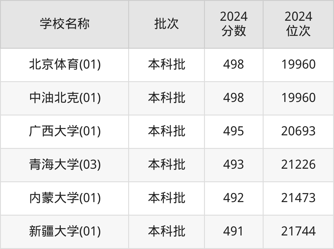 上海高考共有6所211大学在490到500分之间录取,包含北京体育大学、中国石油大学(北京)克拉玛依校区、广西大学、青海大学、内蒙古大学、新疆大学。