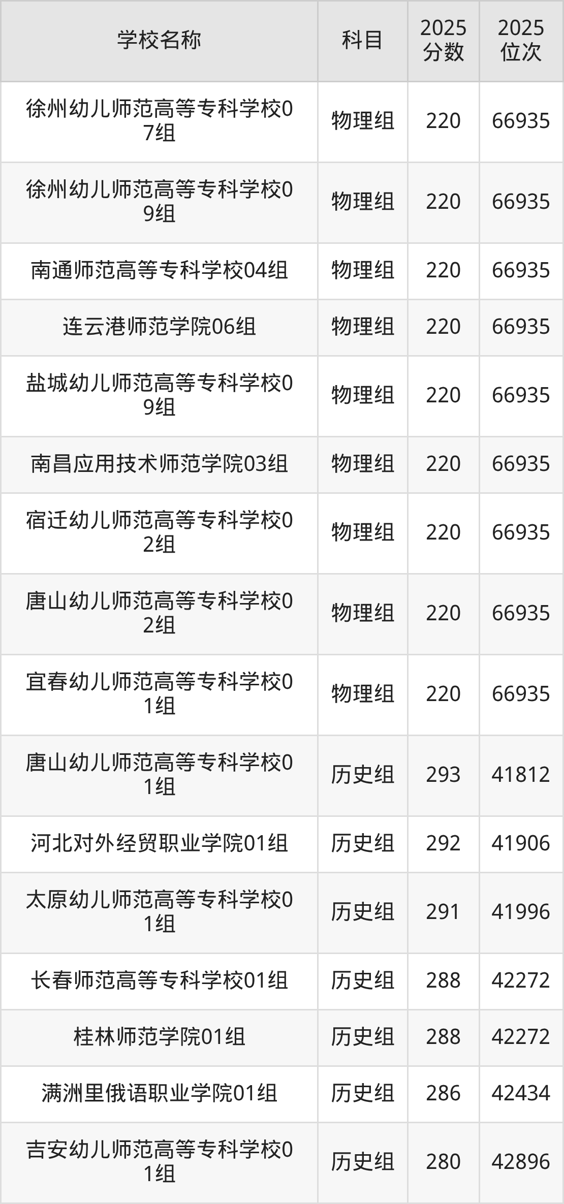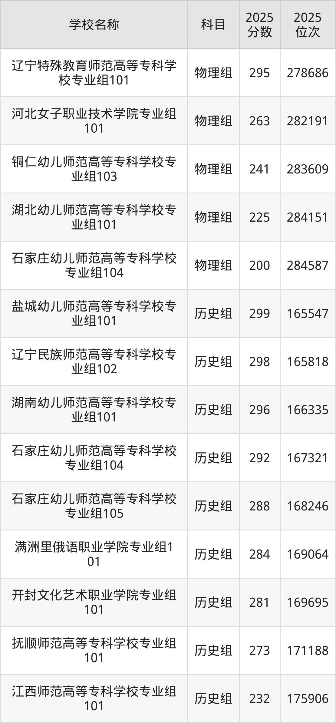 四川高考历史组共有8所文科大学在200到300分之间录取,包含盐城幼儿师范高等专科学校、辽宁民族师范高等专科学校、湖南幼儿师范高等专科学校、石家庄幼儿师范高等专科学校、满洲里俄语职业学院、开封文化艺术职业学院、抚顺师范高等专科学校、江西师范高等专科学校。