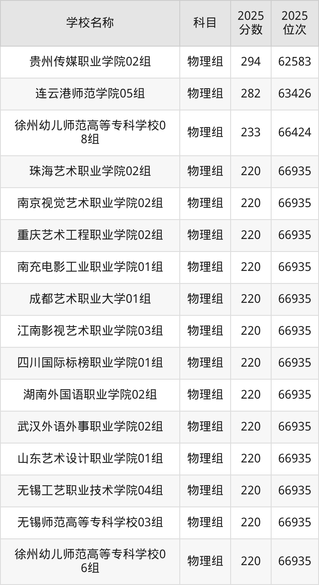 江苏高考物理组共有21所文科大学在200到300分之间录取,包含贵州传媒职业学院、连云港师范学院、徐州幼儿师范高等专科学校、无锡工艺职业技术学院、无锡师范高等专科学校、南通师范高等专科学校、盐城幼儿师范高等专科学校、宿迁幼儿师范高等专科学校、南京视觉艺术职业学院、江南影视艺术职业学院。
